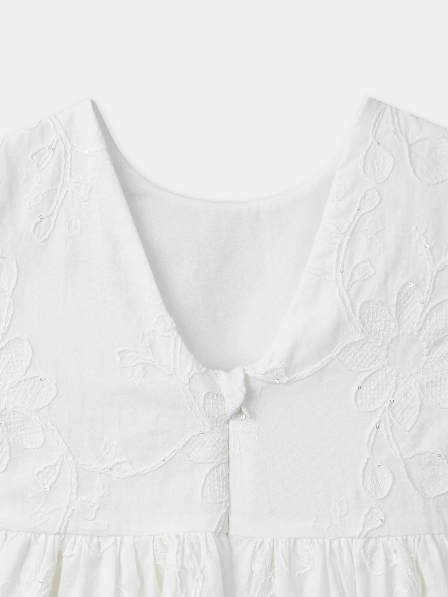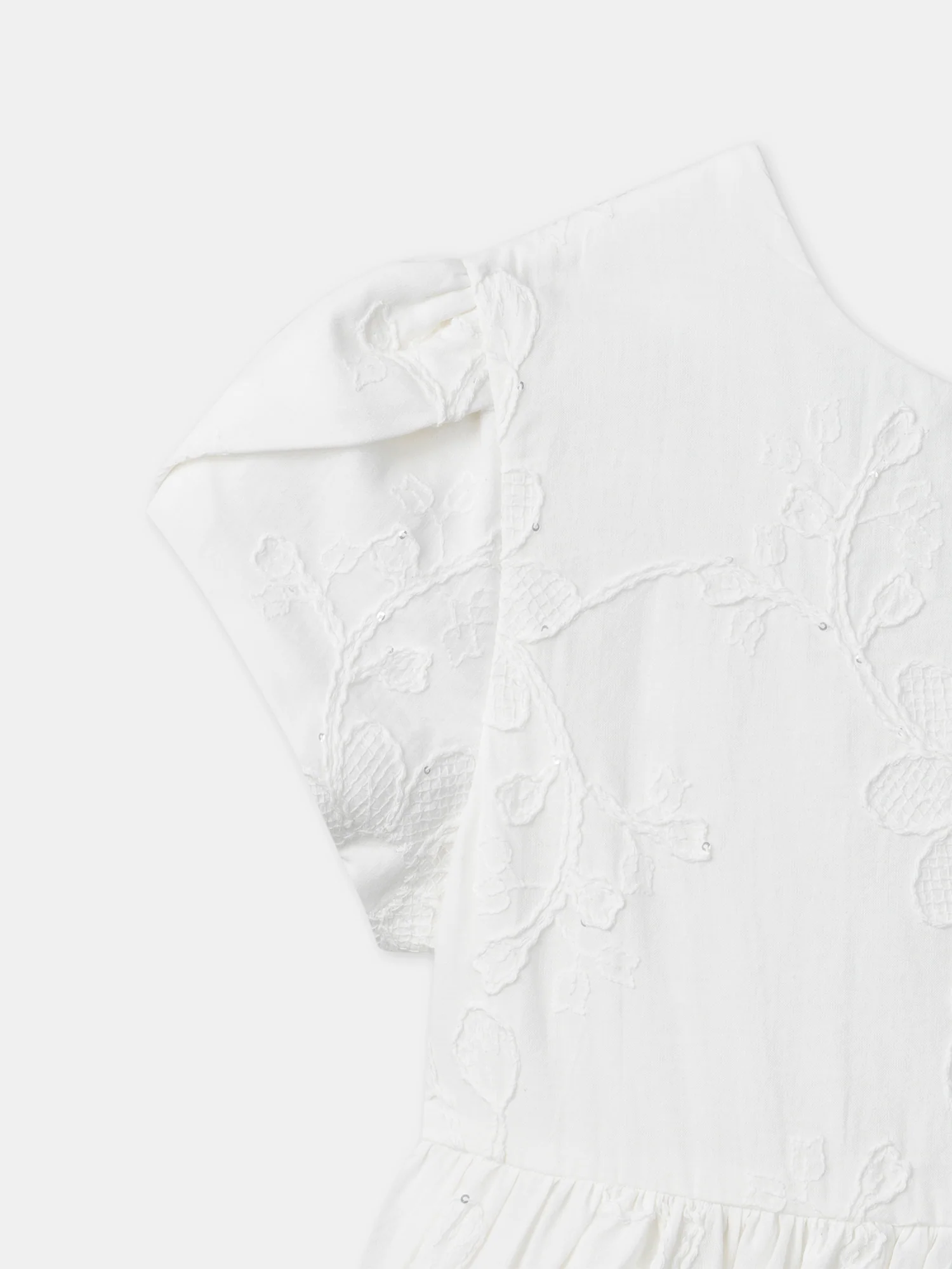 Un elegante abito ecru con ricami di fiori, perfetto per la bella stagione. Realizzato in popeline ecru foderato, presenta un taglio fluido con maniche a palloncino. I fiori ricamati e i paillettes creano un’atmosfera chic e delicata.