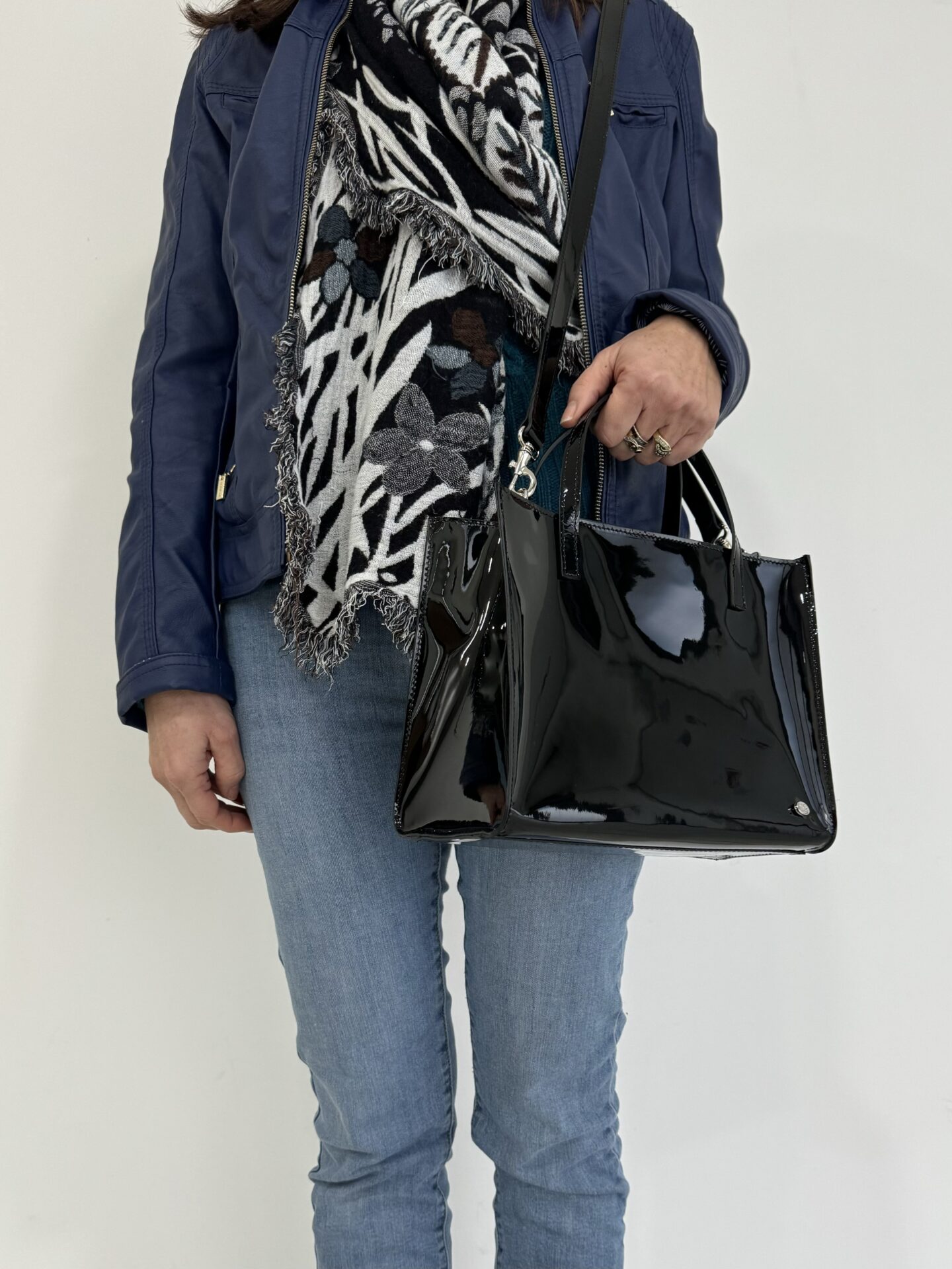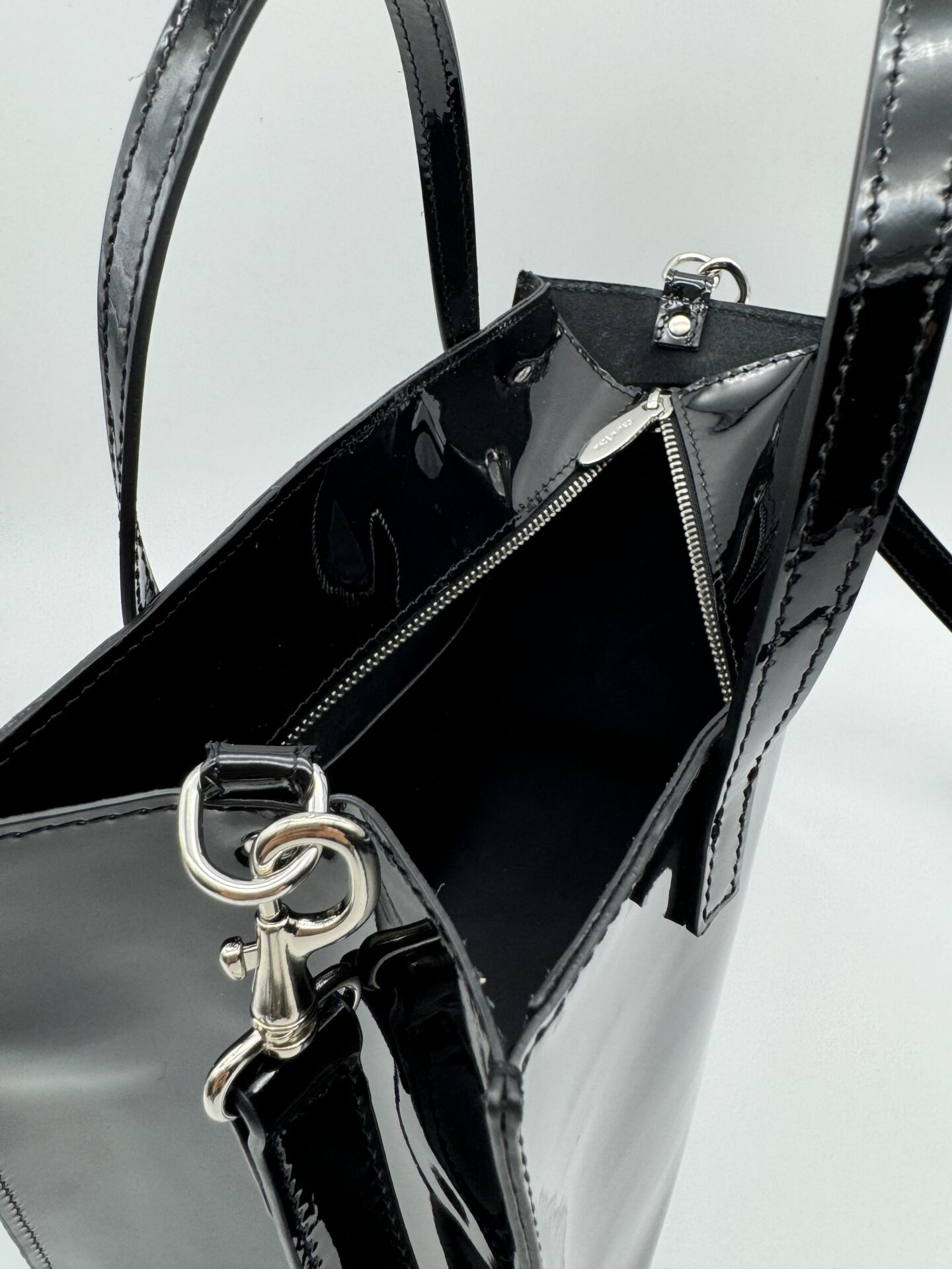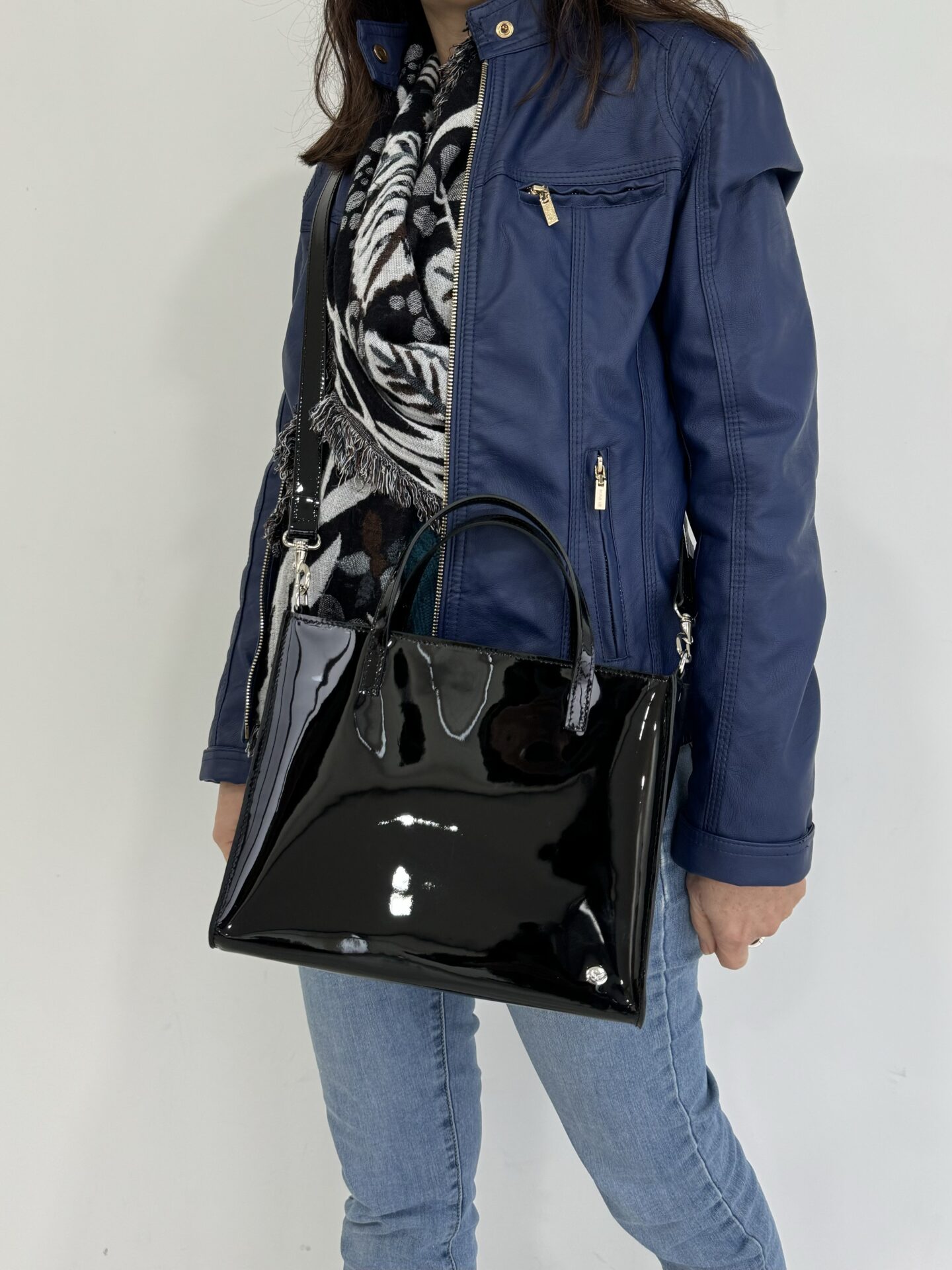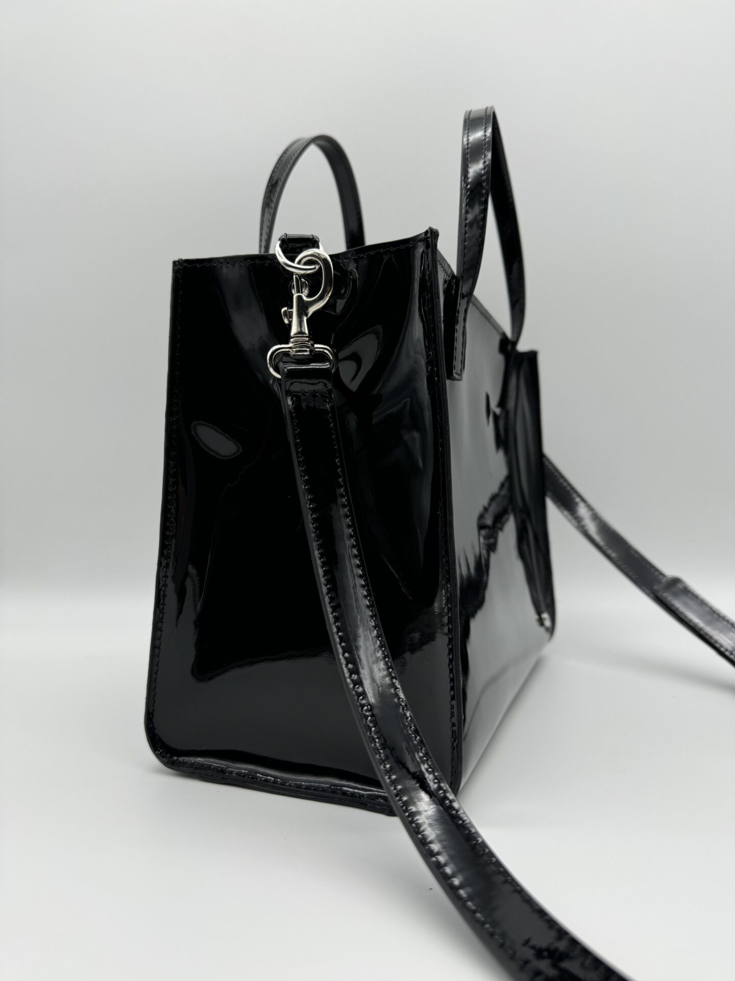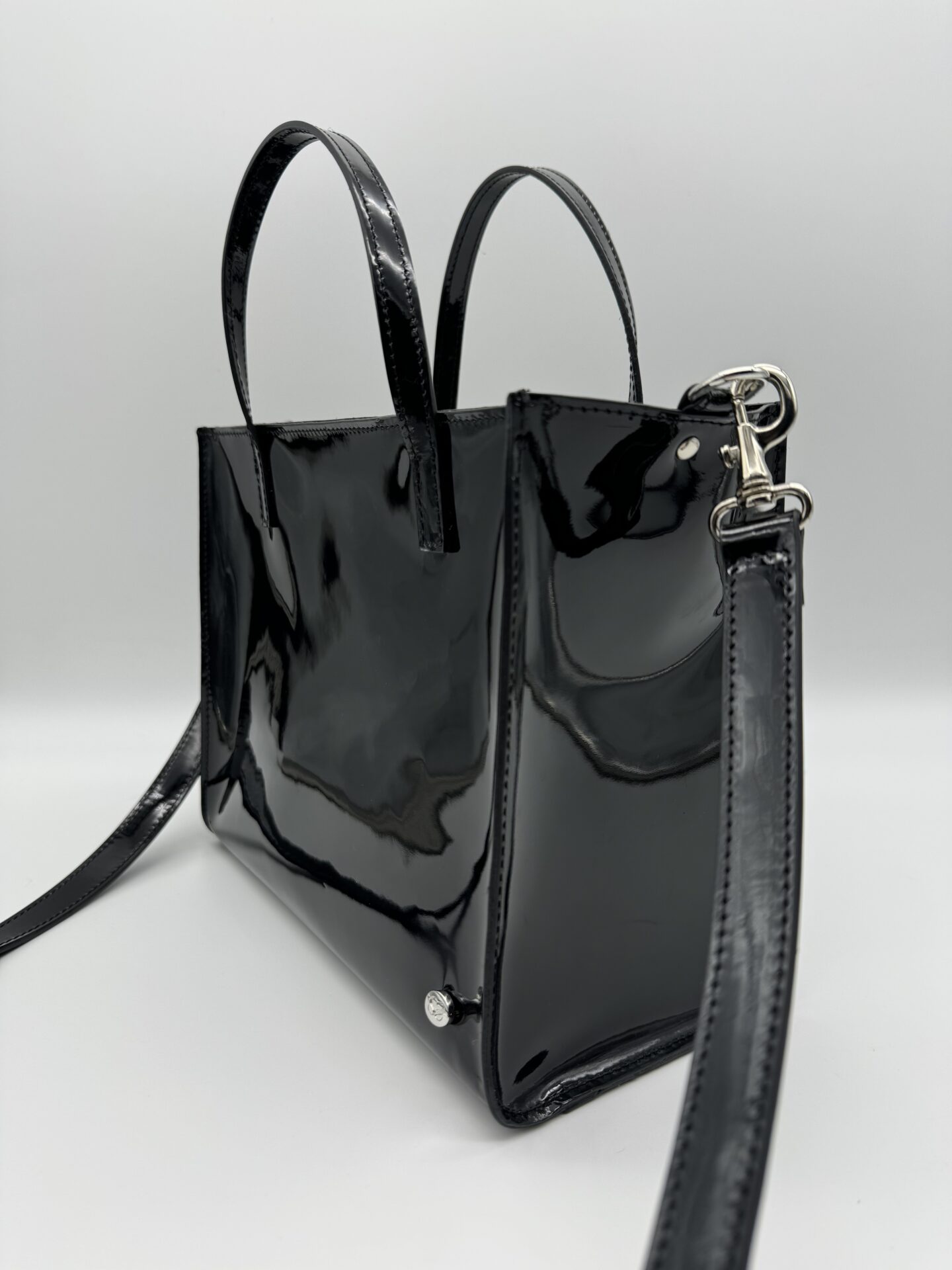 Borsa realizzata in vera pelle lucida, vernice colore nero. Il suo stile glossy può essere portato anche di giorno.