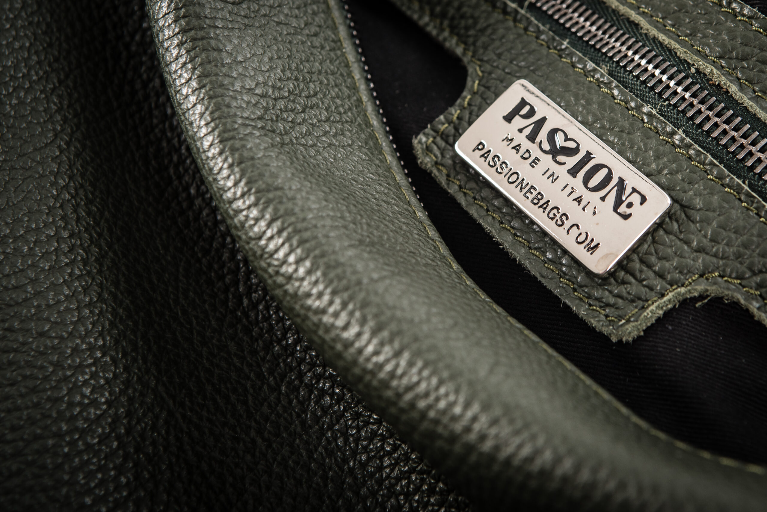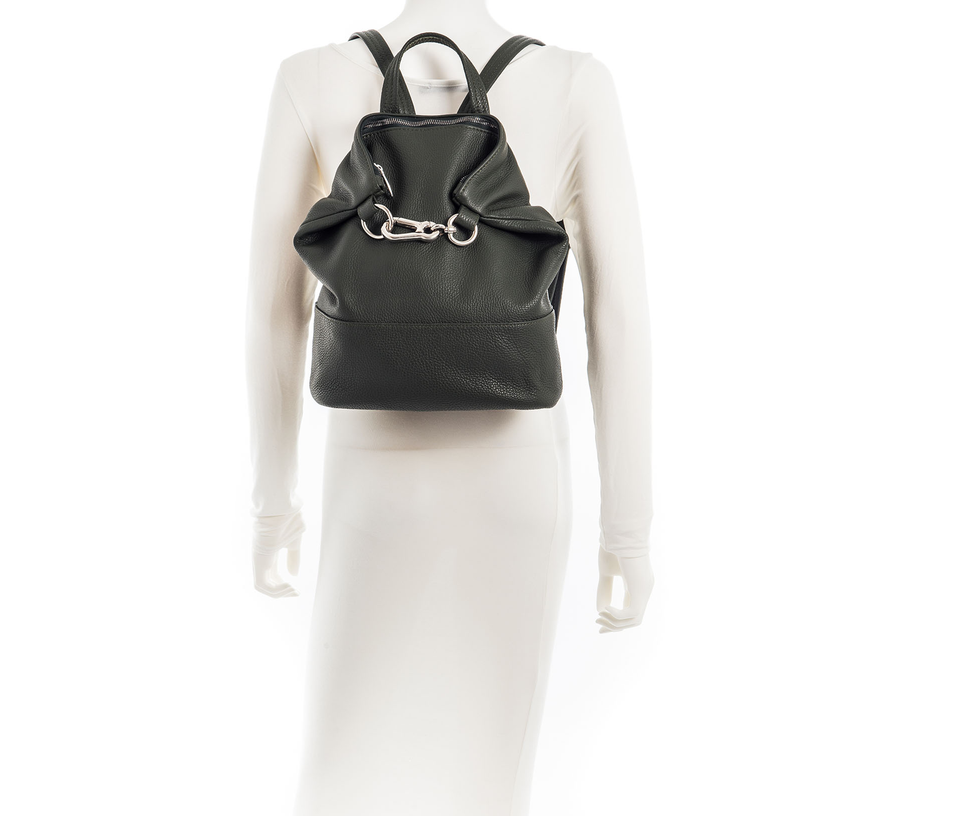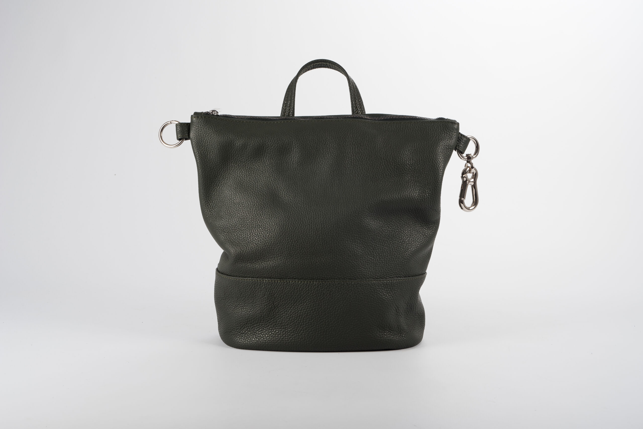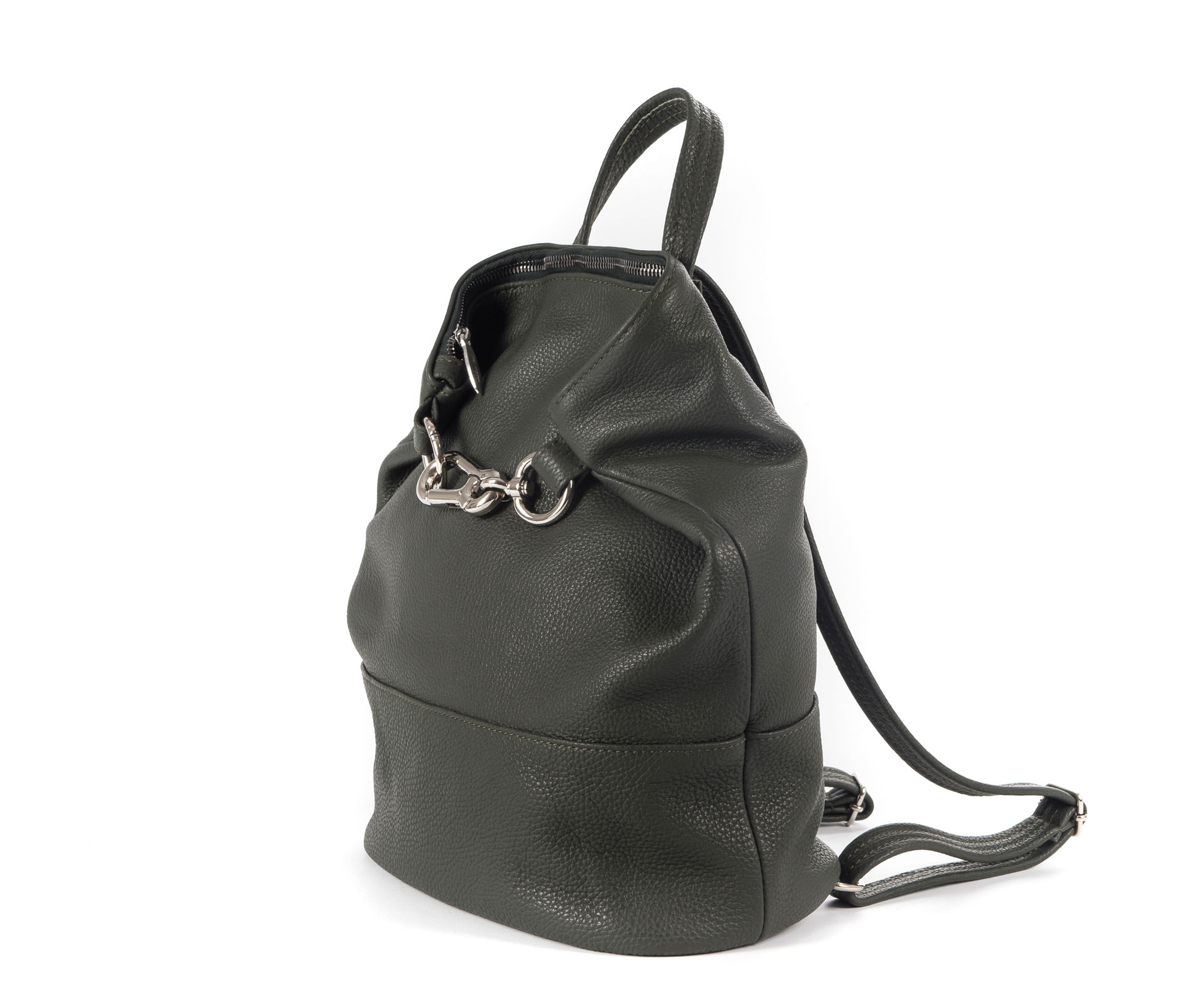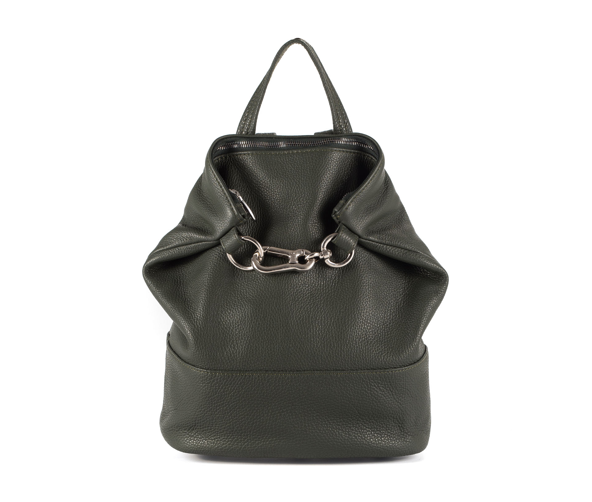 Zaino in vera pelle verde militare con chiusura lampo e moschettone.