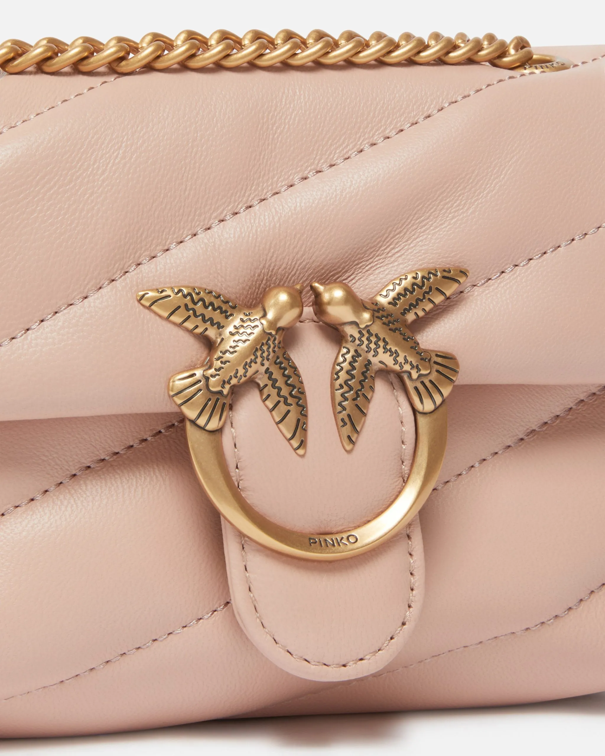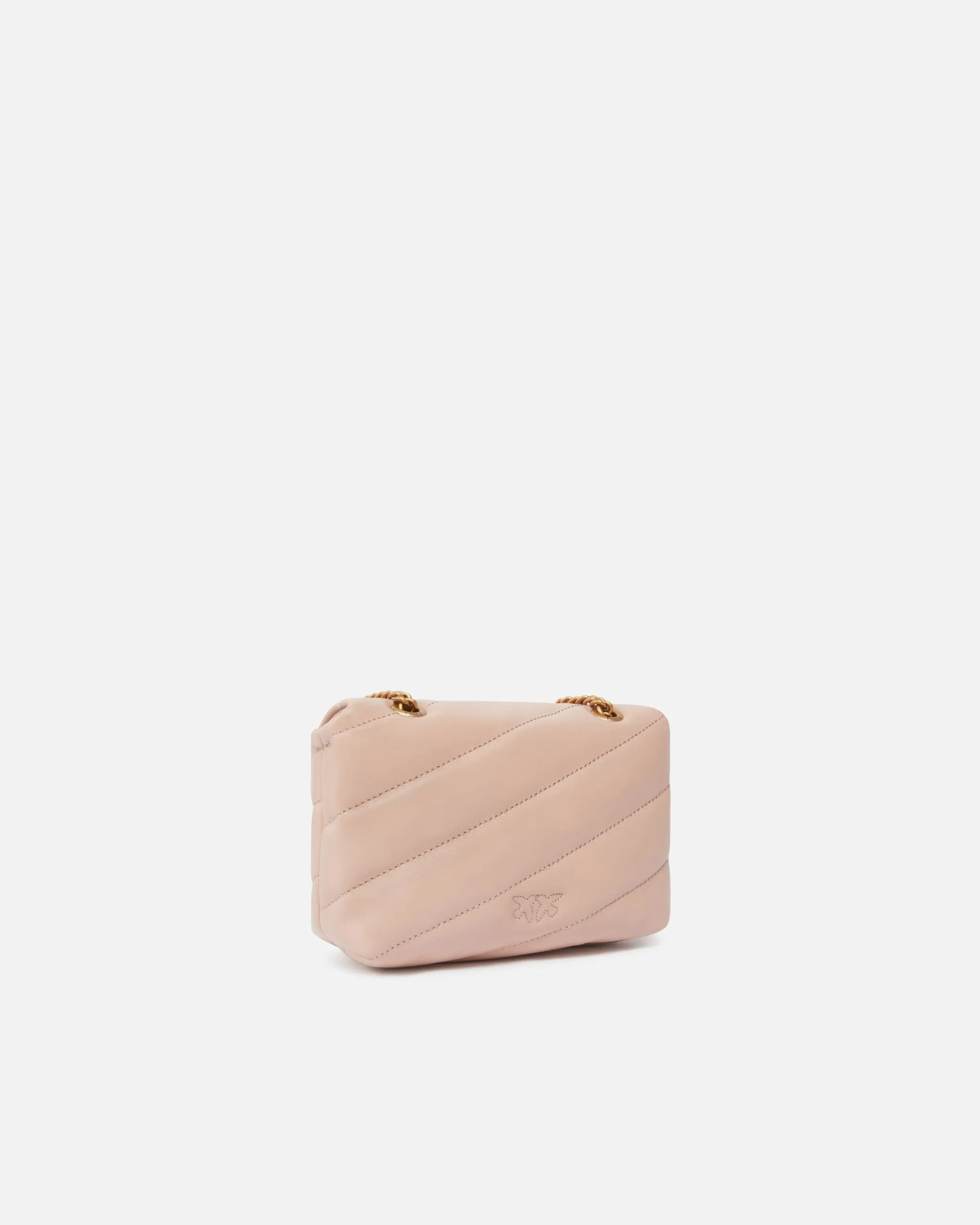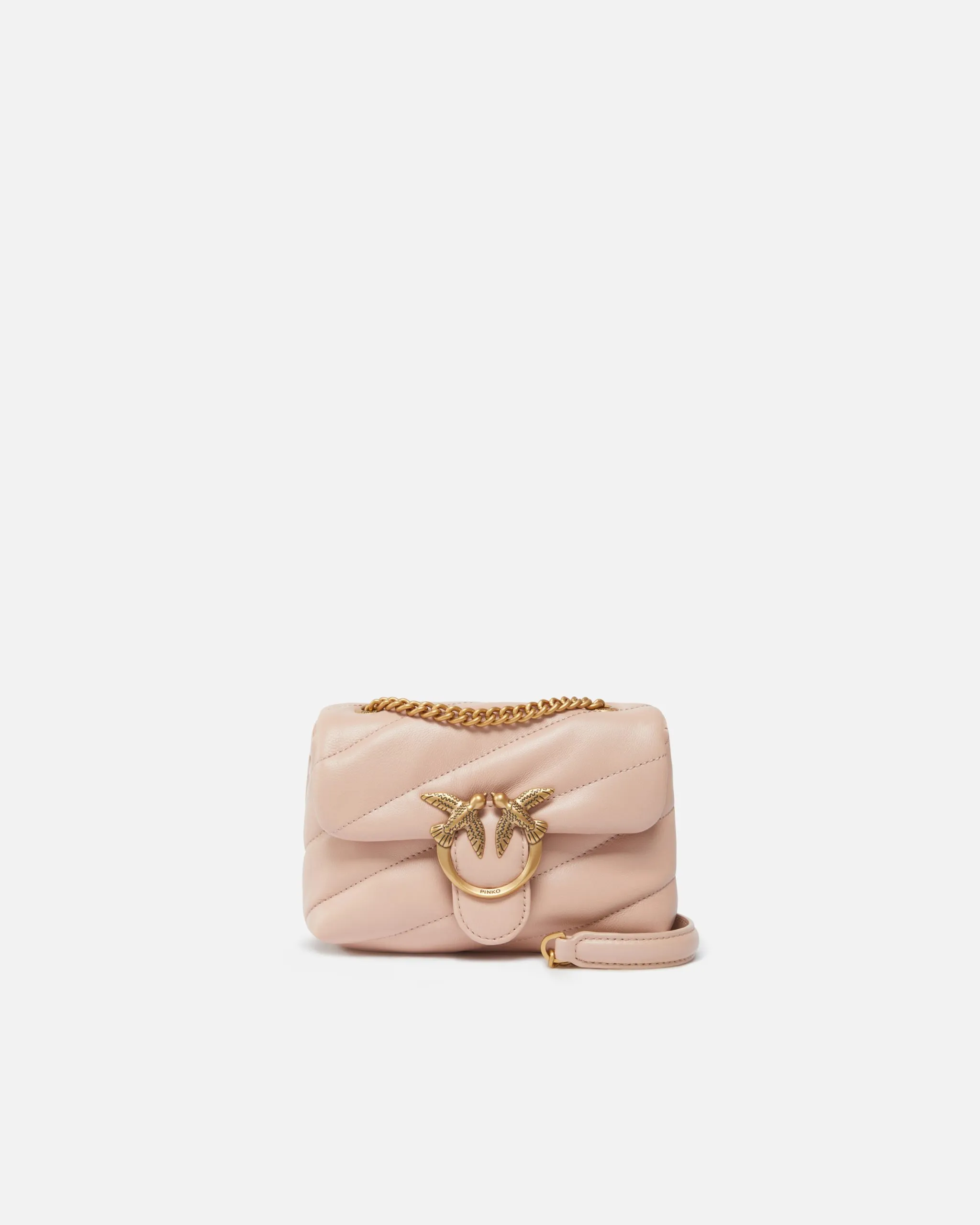 Baby Love Bag Puff in morbida nappa con maxi trapuntatura obliqua. La chiusura è completata dall’iconica fibbia in metallo Love Birds Diamond Cut. L’interno è foderato in microfibra scamosciata e comprende tasca a parete chiusa con zip. Completa di tracolla sottile a catena in metallo.
