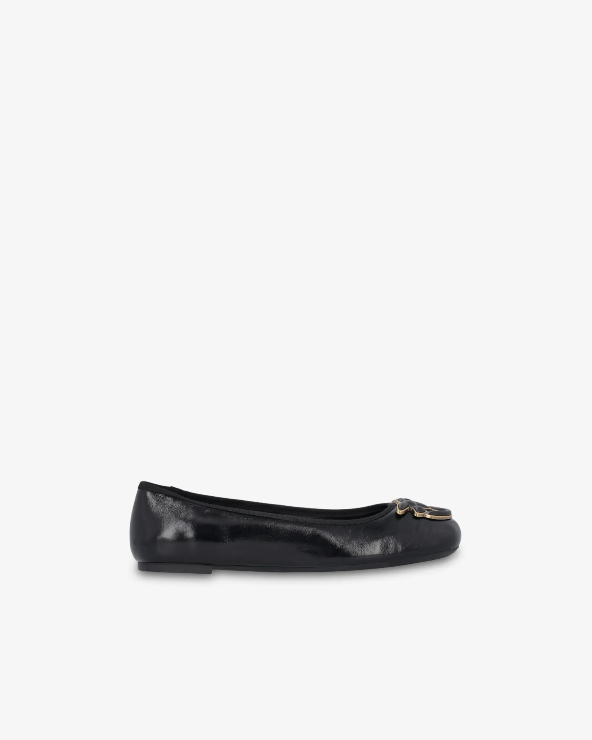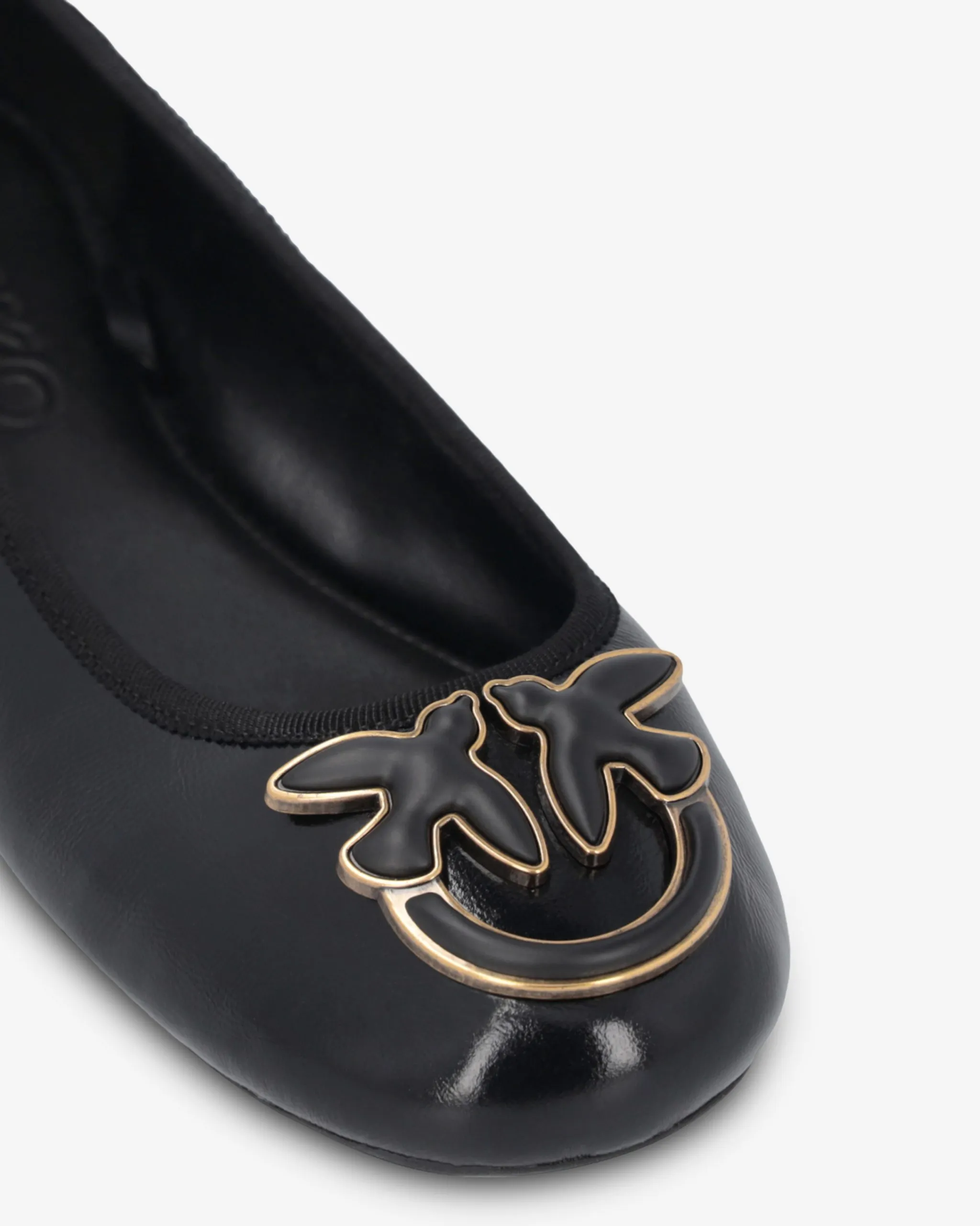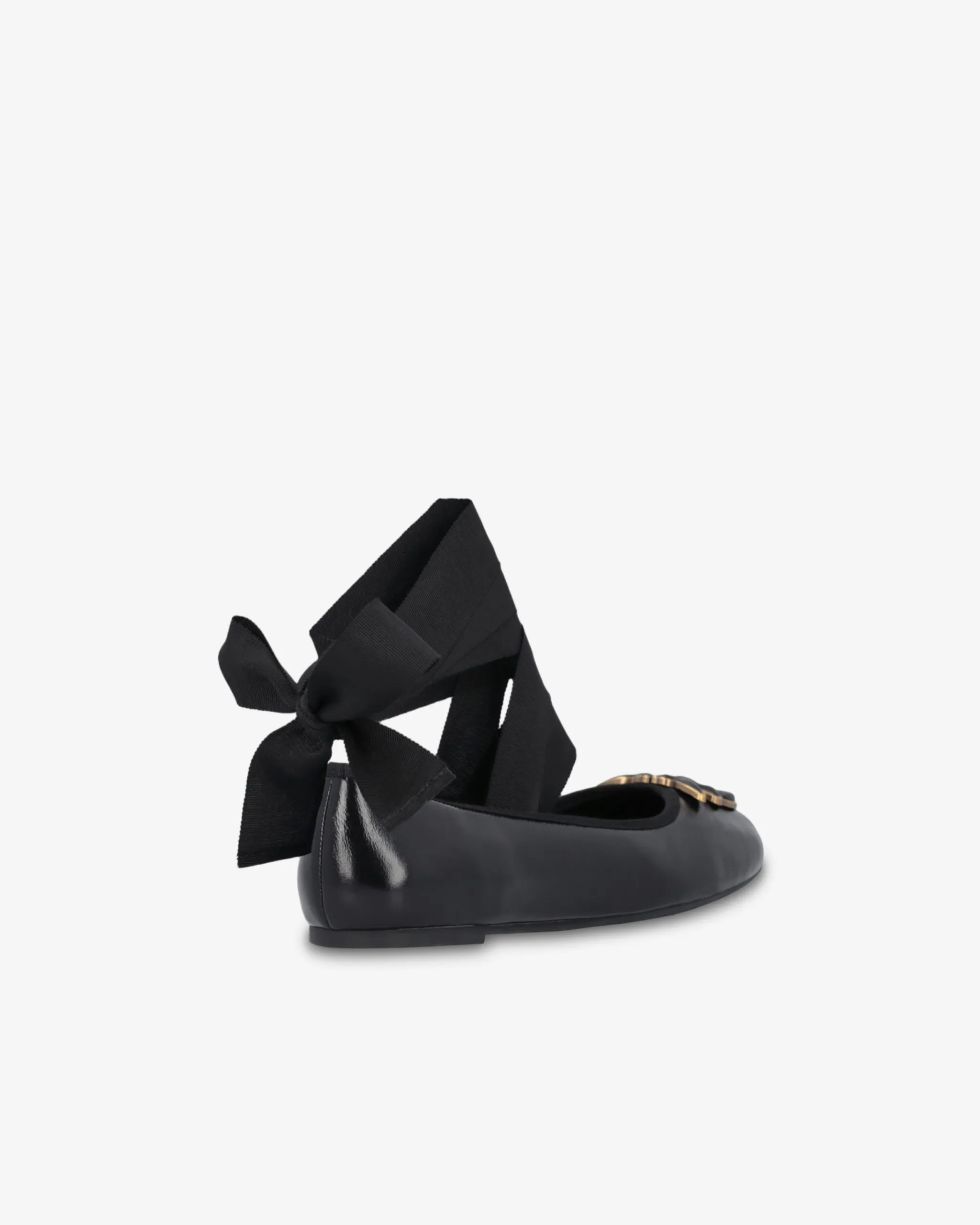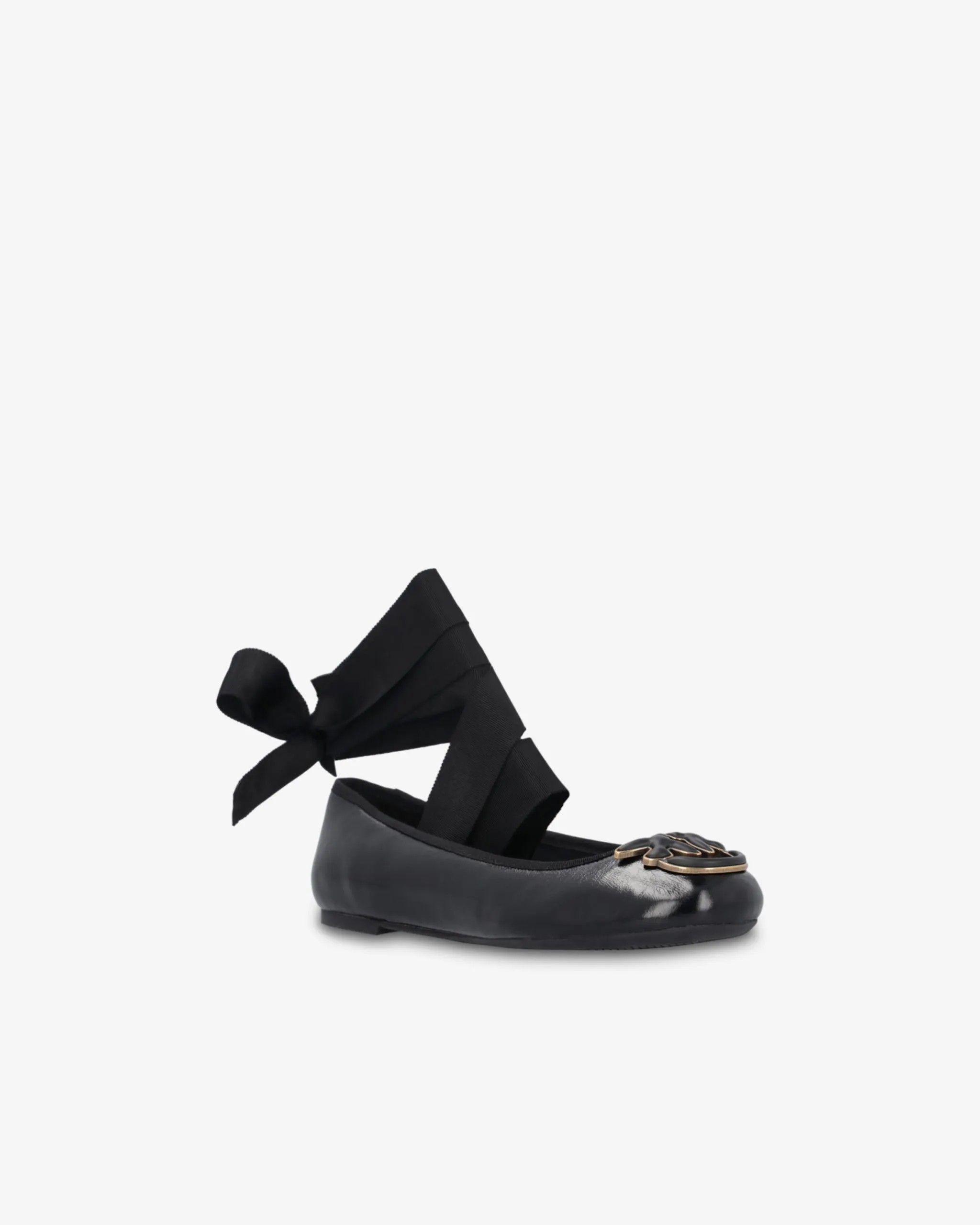 Ballerine in pelle laminata con nastri rimovibili, da allacciare alla caviglia. Punta stondata personalizzata con applicazione logo Love Birds smaltato. Fodera e soletta interna in pelle, suola in gomma con tacco flat 1,5cm.