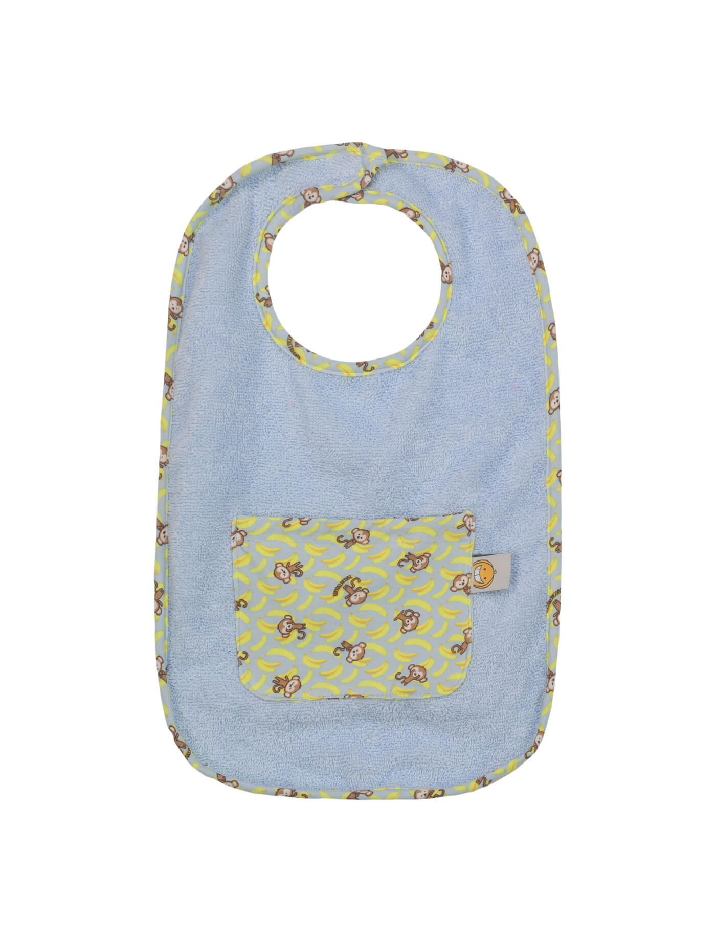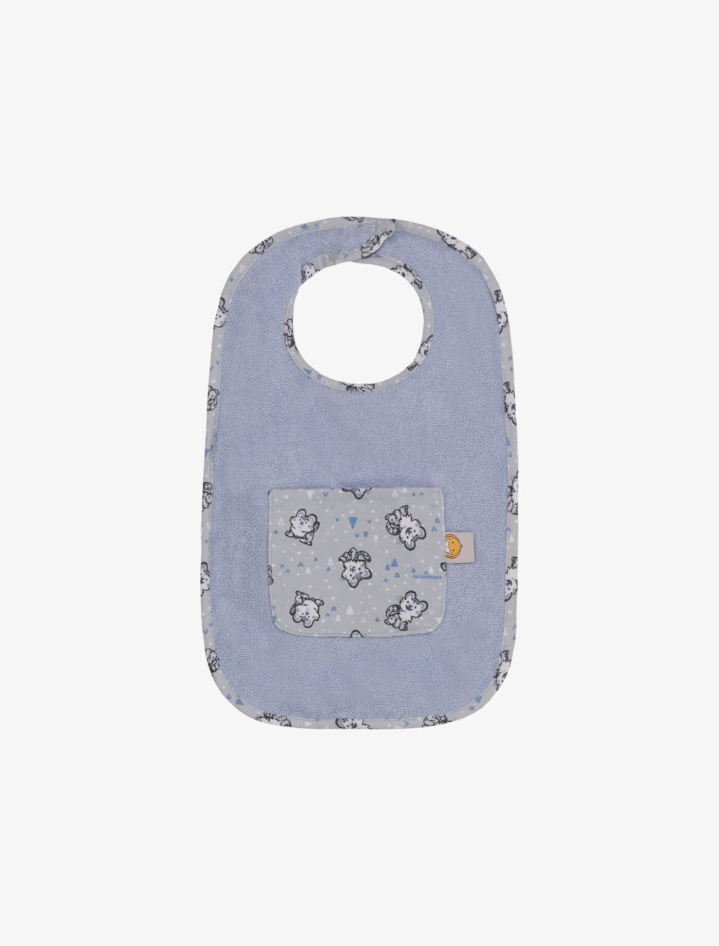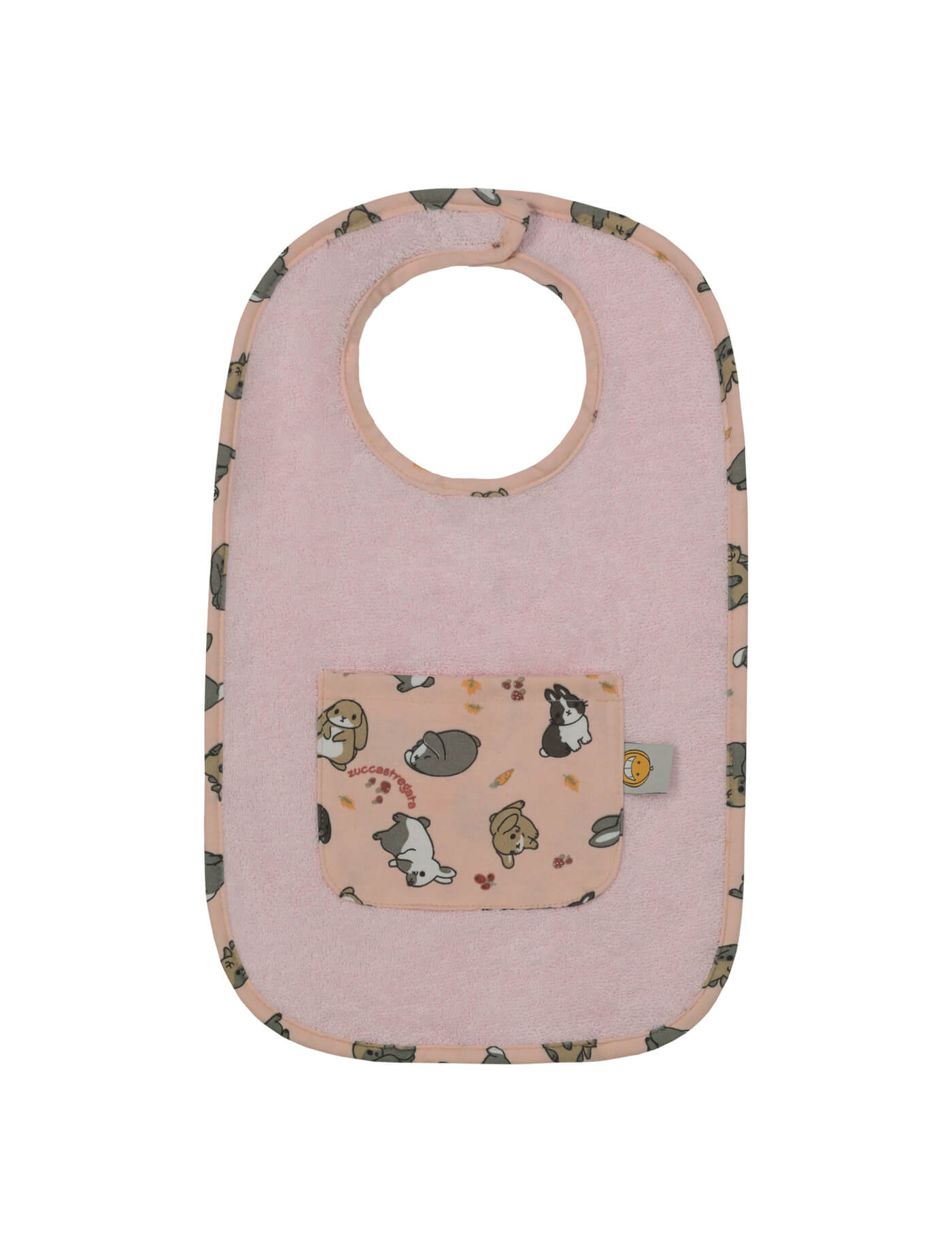Bavaglino grande in cotone fantasia e morbida spugna. Chiusura con velcro e taschina porta ciuccio.