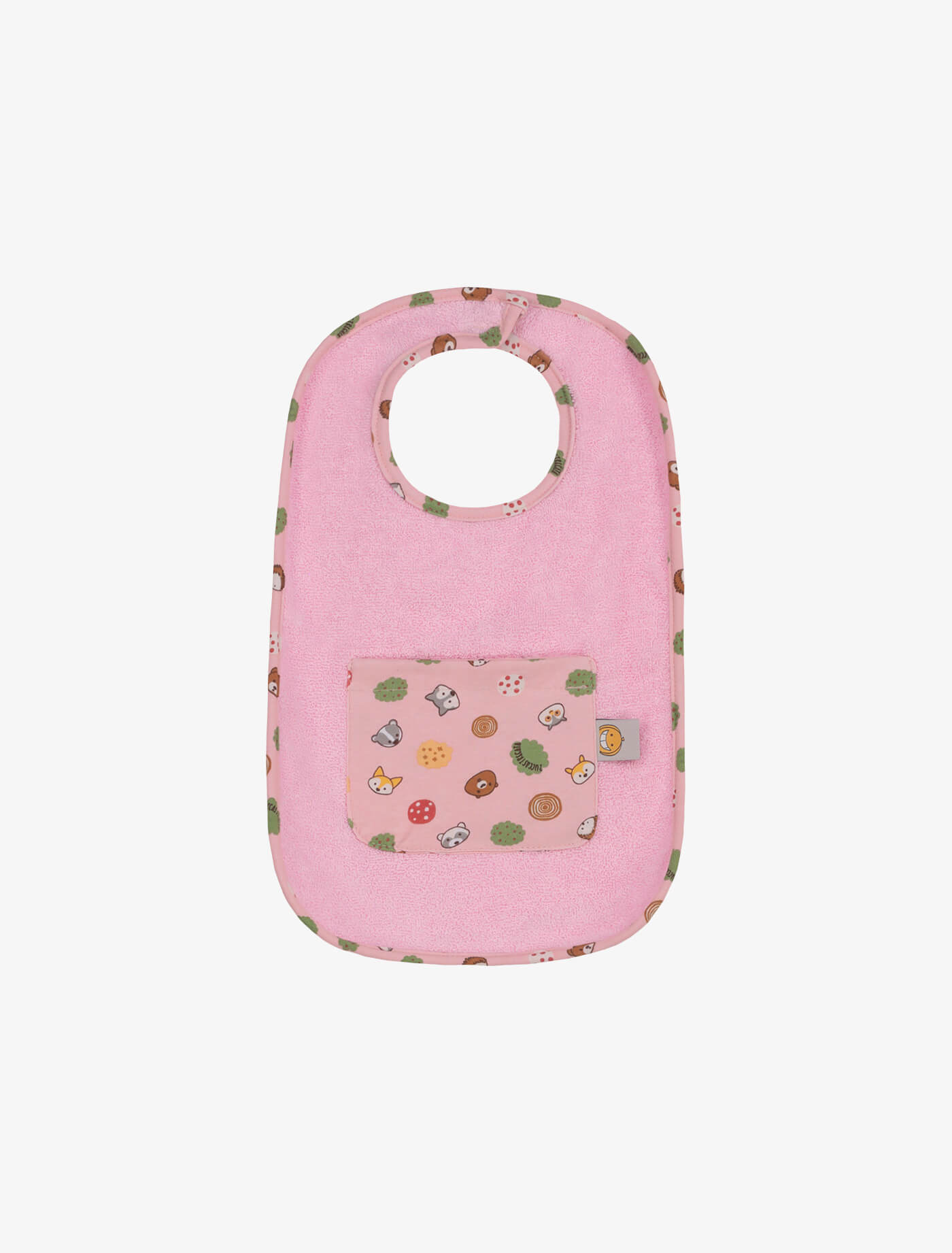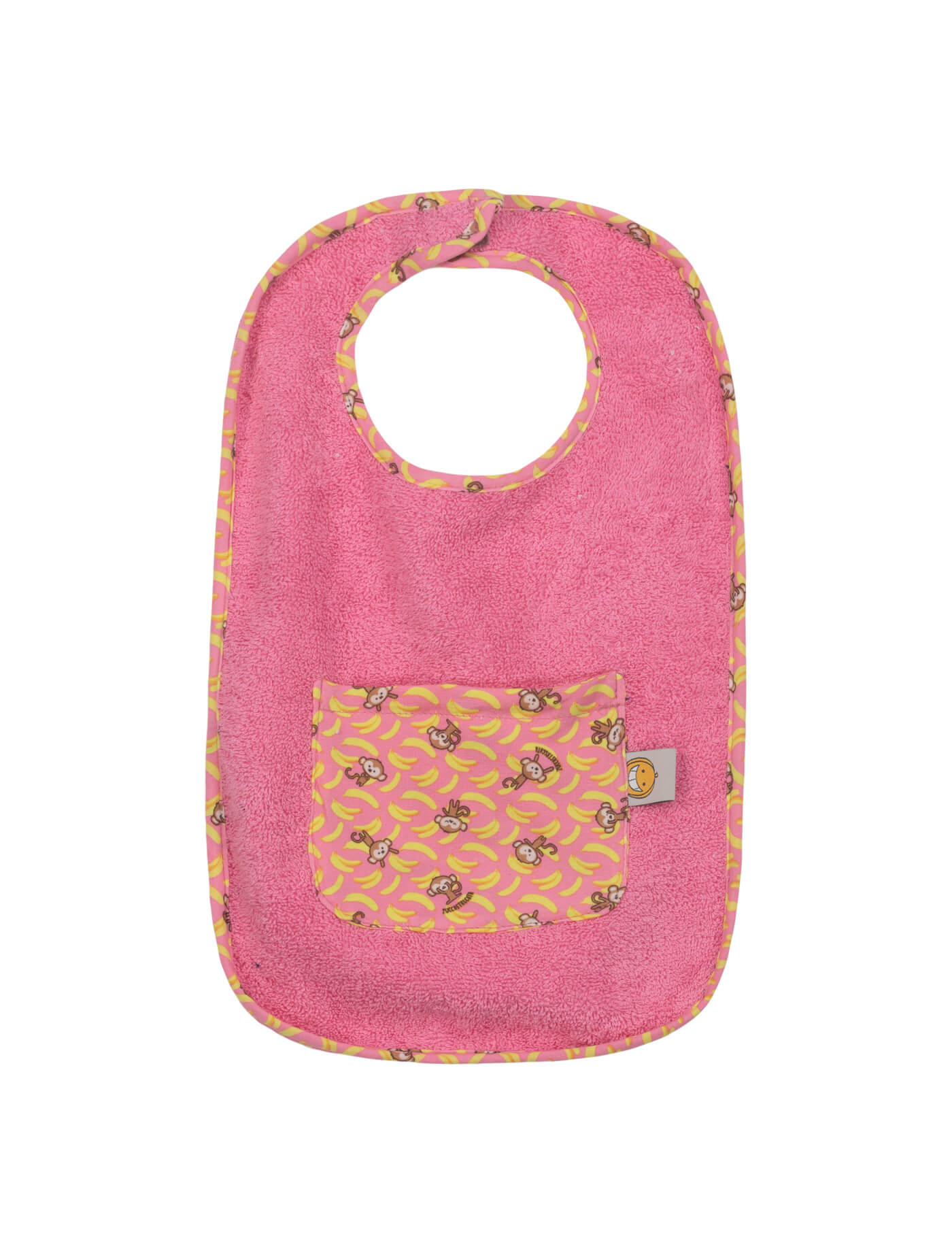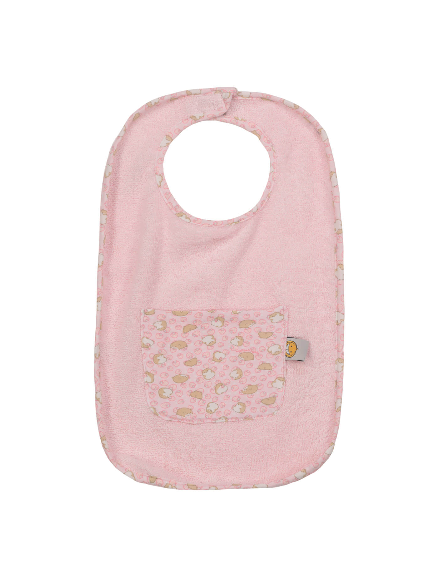 Bavaglino grande in cotone fantasia e morbida spugna. Chiusura con velcro e taschina porta ciuccio.