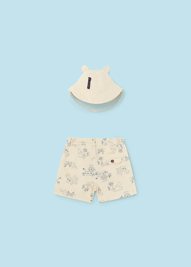 Esplora il mondo con stile con questo completo 2 pezzi composto da un cappellino reversibile e un bermuda in morbido cotone beige per il tuo bambino! Proteggi la sua testa dai raggi del sole durante le sue avventure estive e regalagli comfort e libertà di movimento con questo pratico e versatile set.