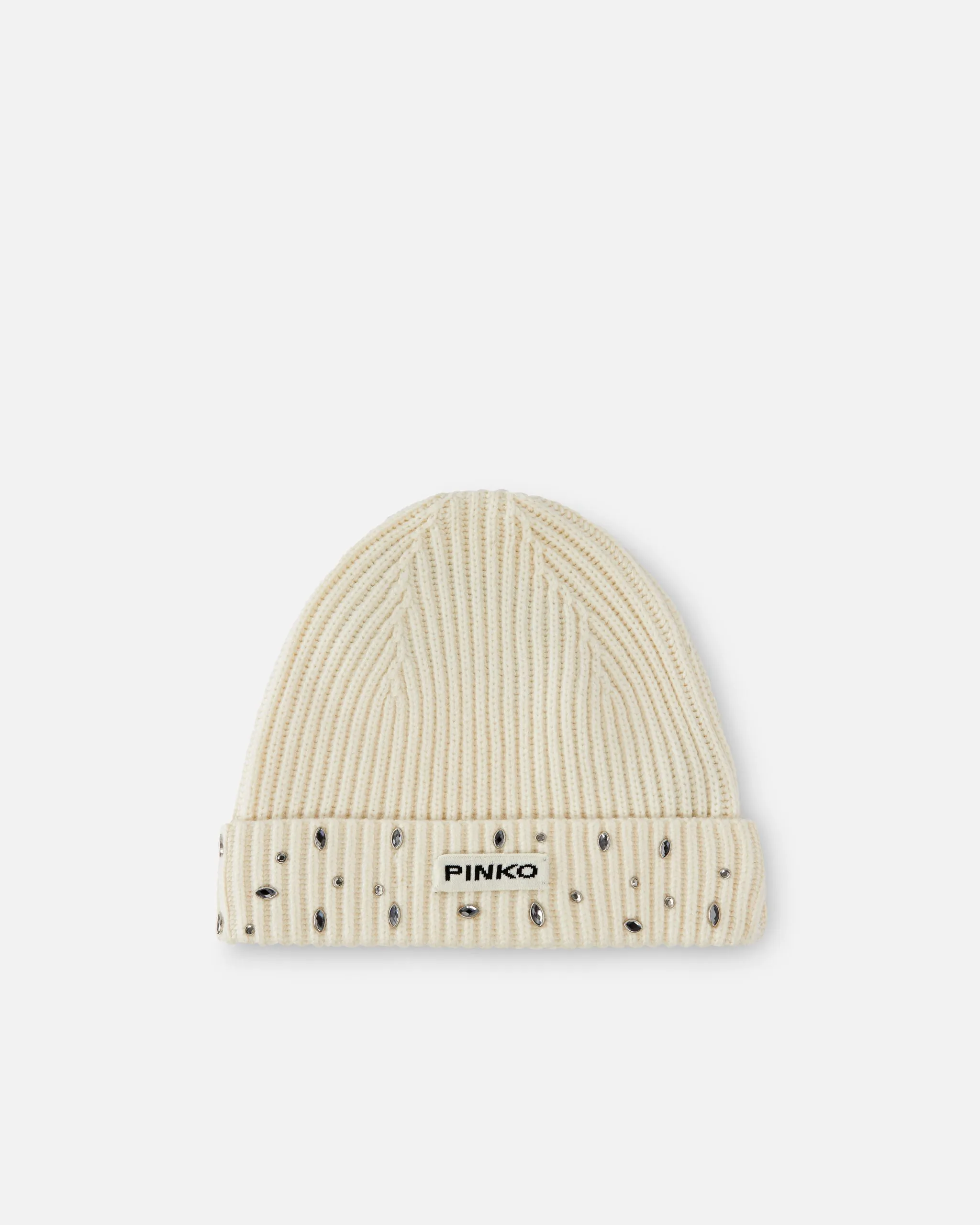 Berretto invernale stile cuffia realizzato in maglia di misto lana e cachemire lavorata a costa inglese con dettaglio prezioso di cristalli applicati sul risvolto alla base del berretto. La cuffia è personalizzata con etichetta logata PINKO davanti, ed è un accessorio perfetto per scaldare i look con un accento di stile.