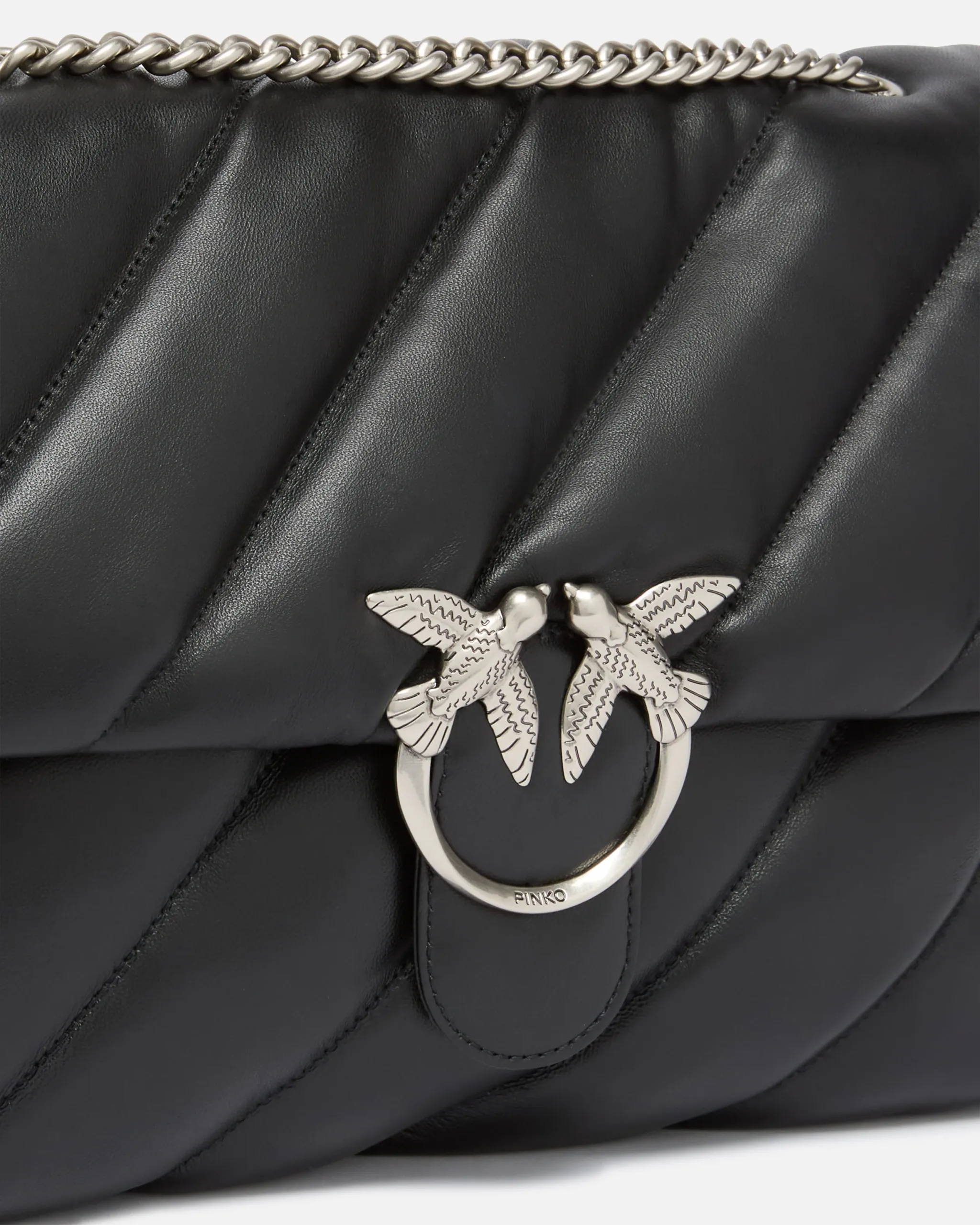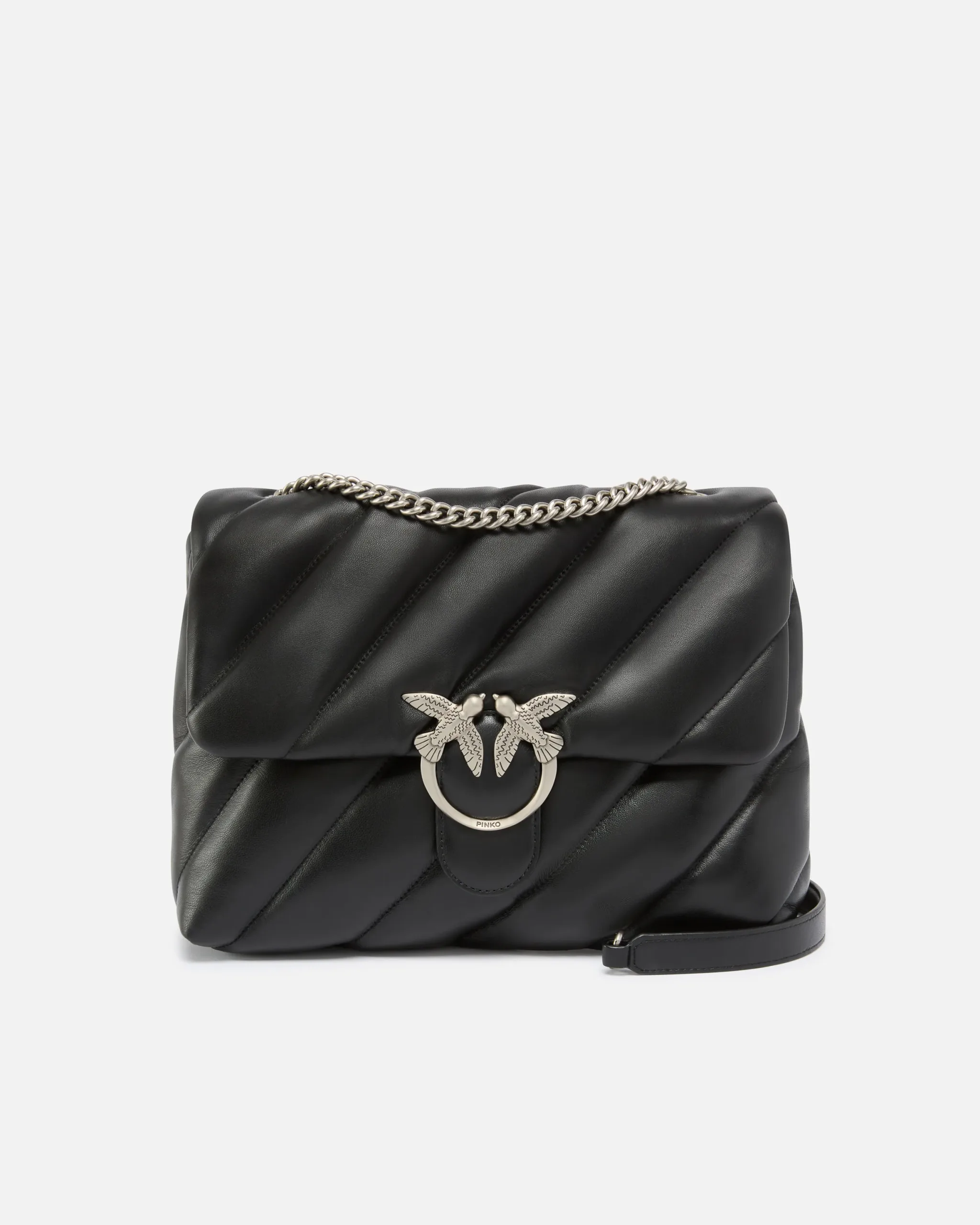 Big Love Bag Puff in morbida nappa con maxi trapuntatura obliqua. La chiusura è completata dall’iconica fibbia in metallo Love Birds Diamond Cut. L’interno è foderato in microfibra e comprende tramezza chiusa con zip e tasca a parete. La tracolla combina la classica catena metallica rotonda al pratico spallaccio in nappa. Verifica l’autenticità della tua Love Bag utilizzando lo speciale chip NFC oppure il codice Certilogo stampato sull’apposito cartellino a forma di cuore.