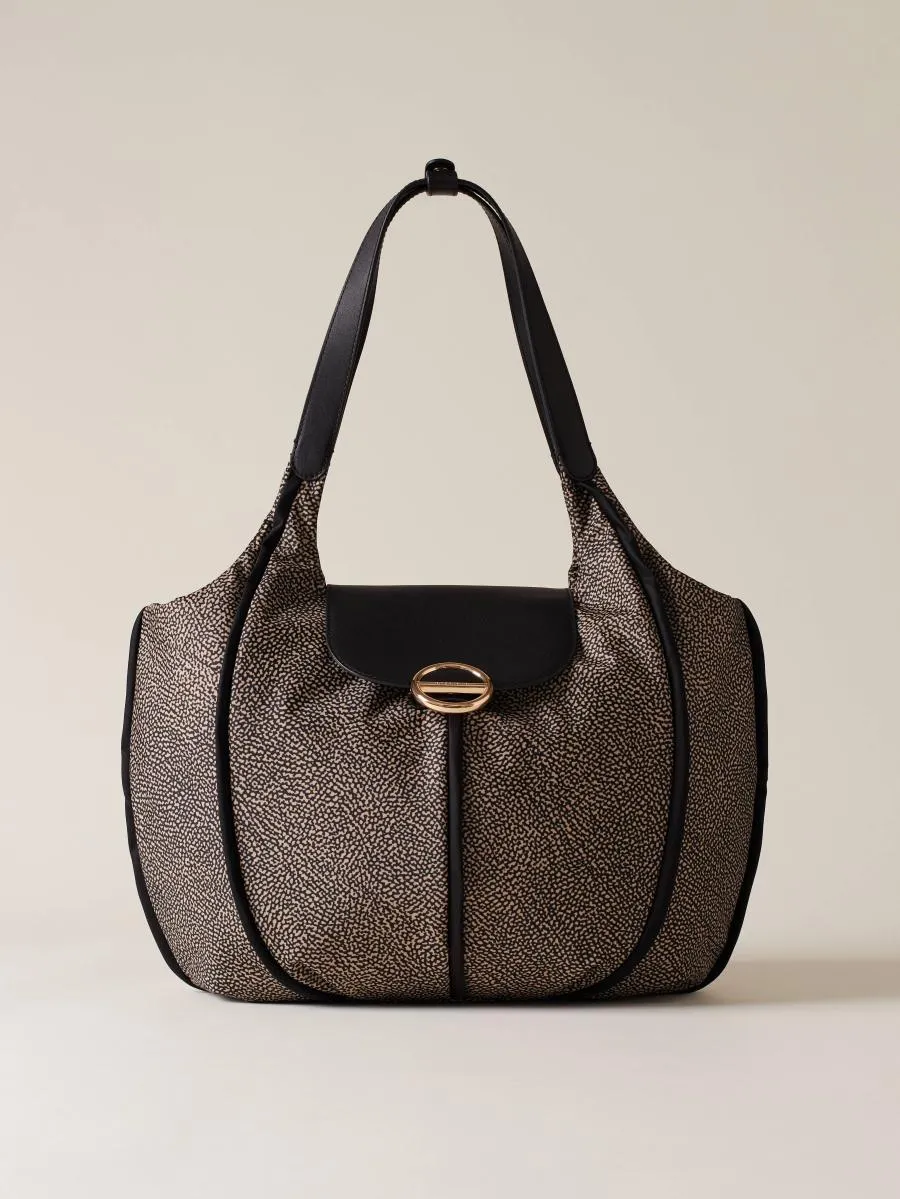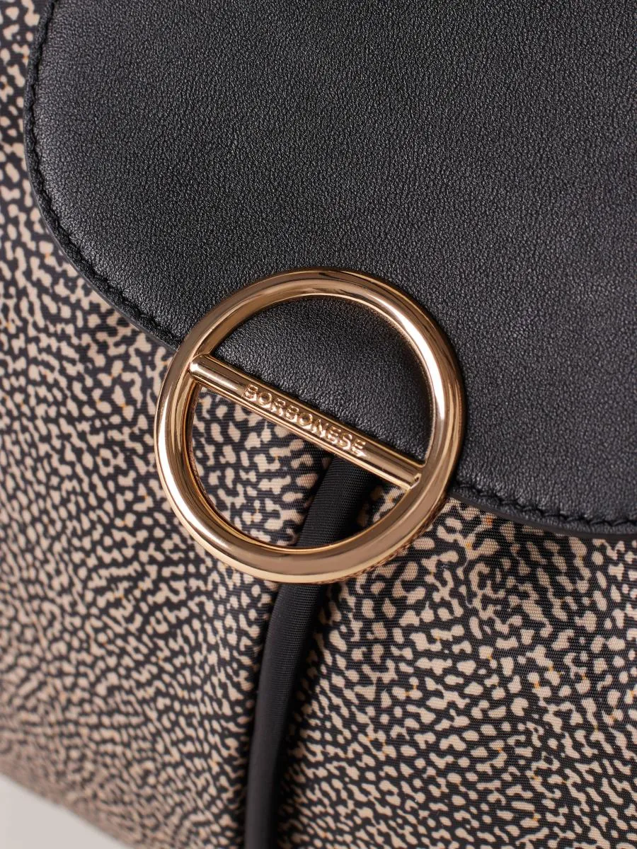 BORBONESE Borsa a spalla cottage in tessuto riciclato op naturale e pelle nero