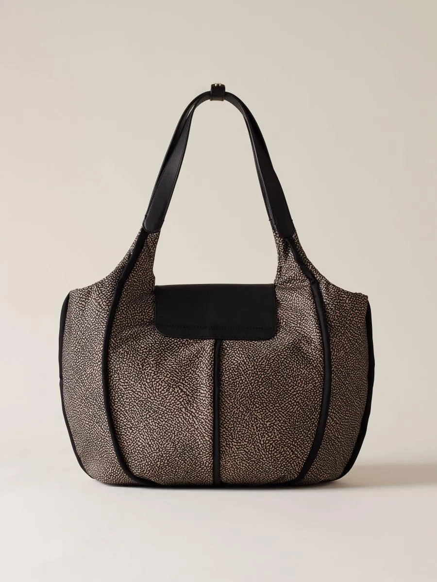 BORBONESE borsa a mano Bateau Medium in jet e pelle op naturale e nero