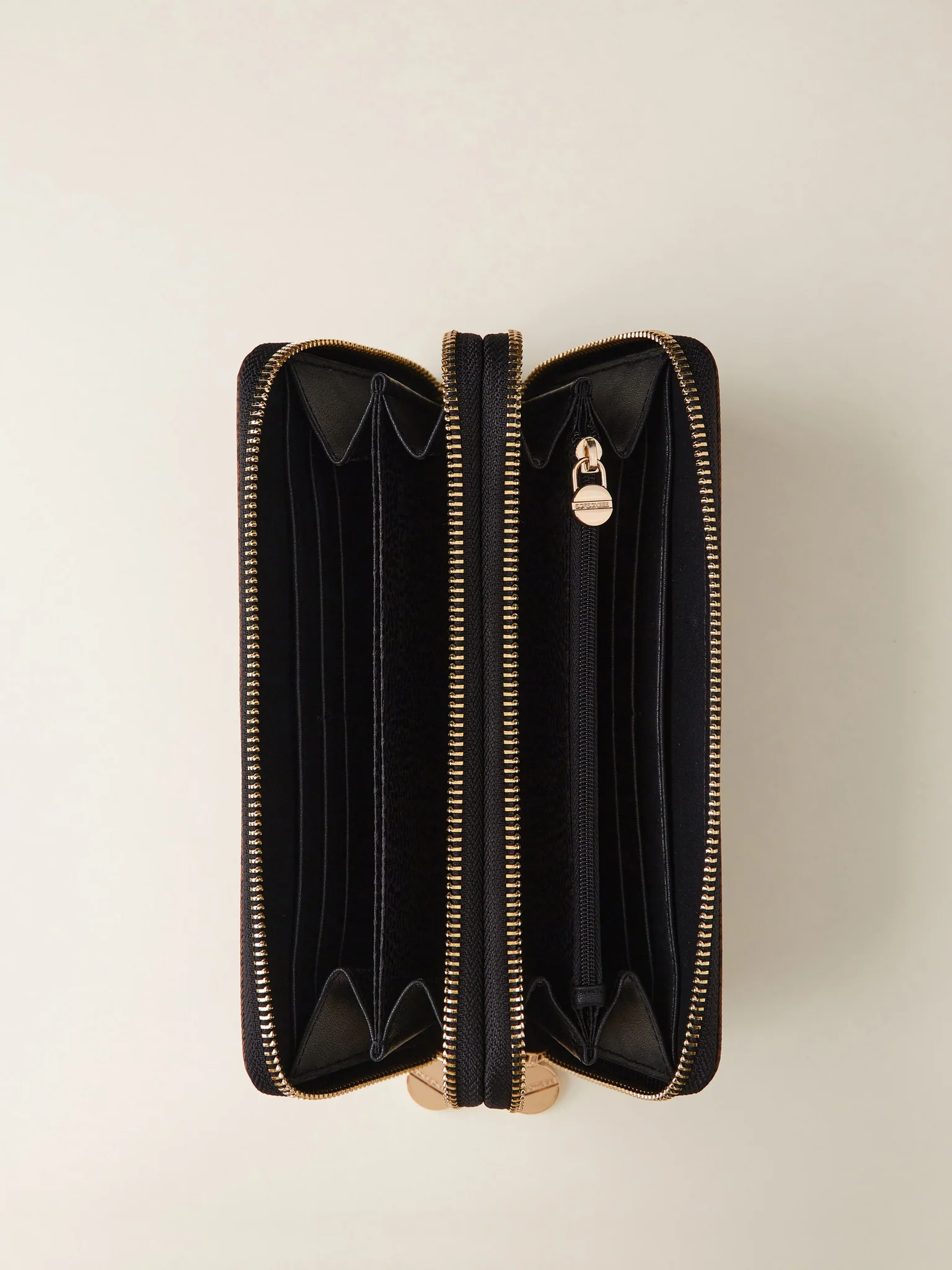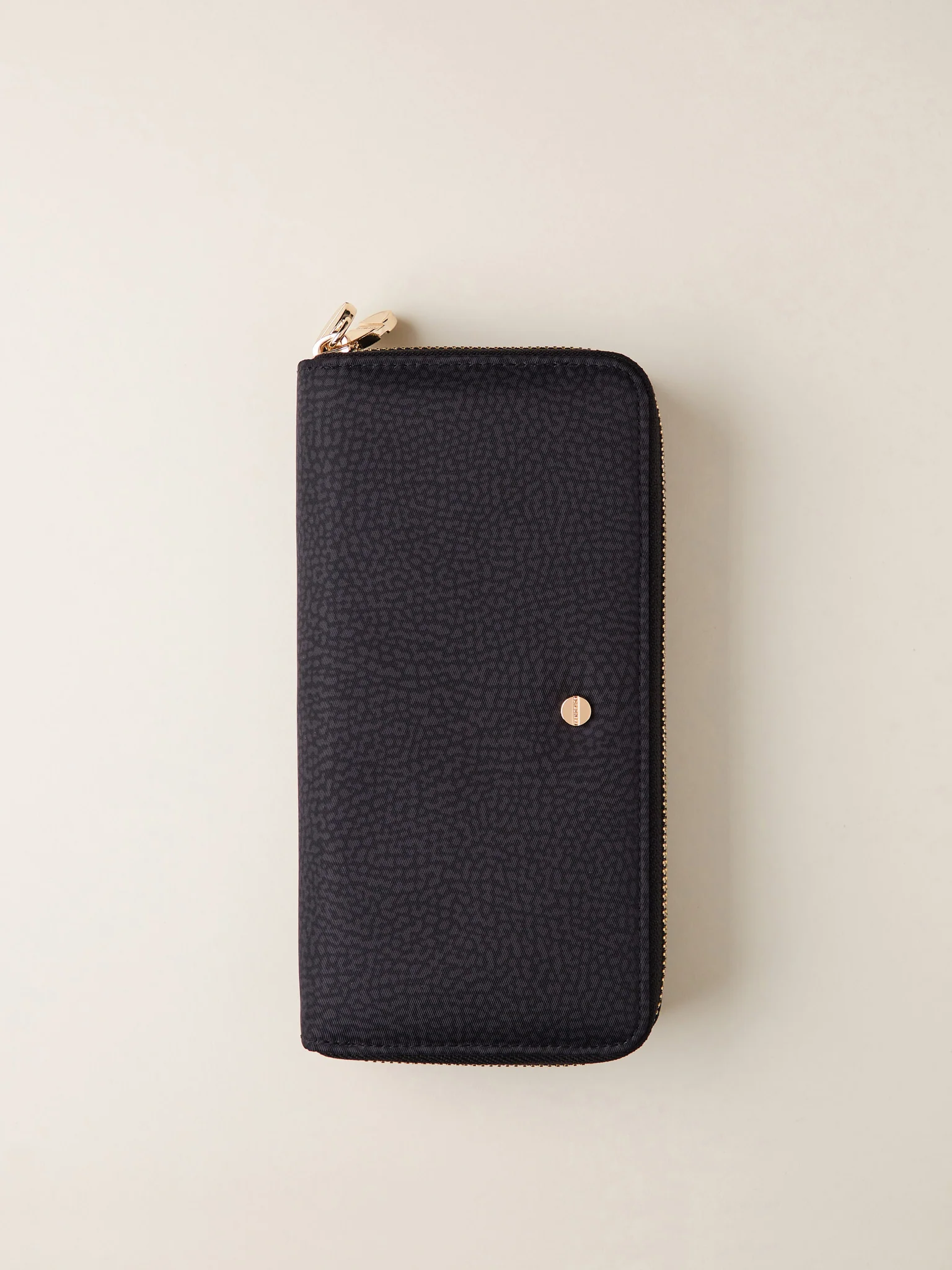 Portafoglio a doppia apertura zip around compatto, funzionale e dagli spazi ben organizzati. Il modello proposto da Borbonese è realizzato in tessuto OP riciclato e pelle. La vite stilizzata, icona del brand funge da tirazip e da motivo decorativo applicata sul fronte. L’interno, foderato in tessuto jacquard con schermo anti-clonazione carte, ha portamonete con zip ed è ricco di scomparti e portatessere. Le metallerie sono in galvanica oro chiaro.
