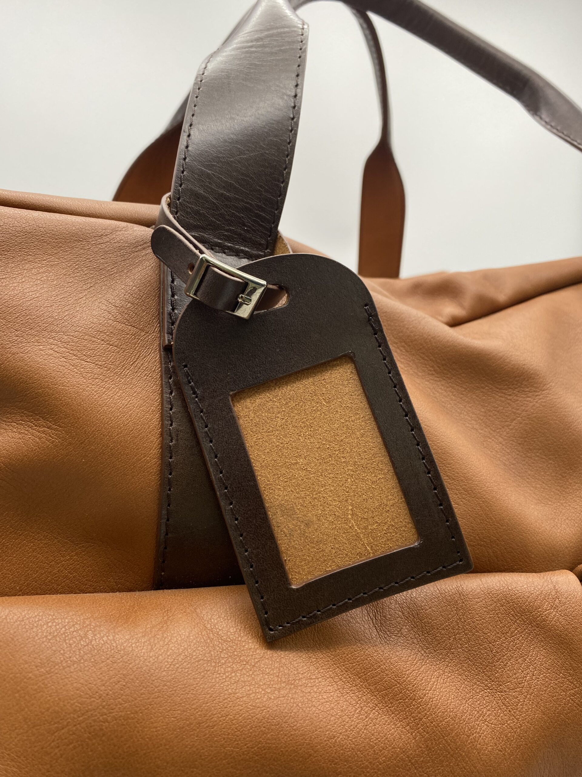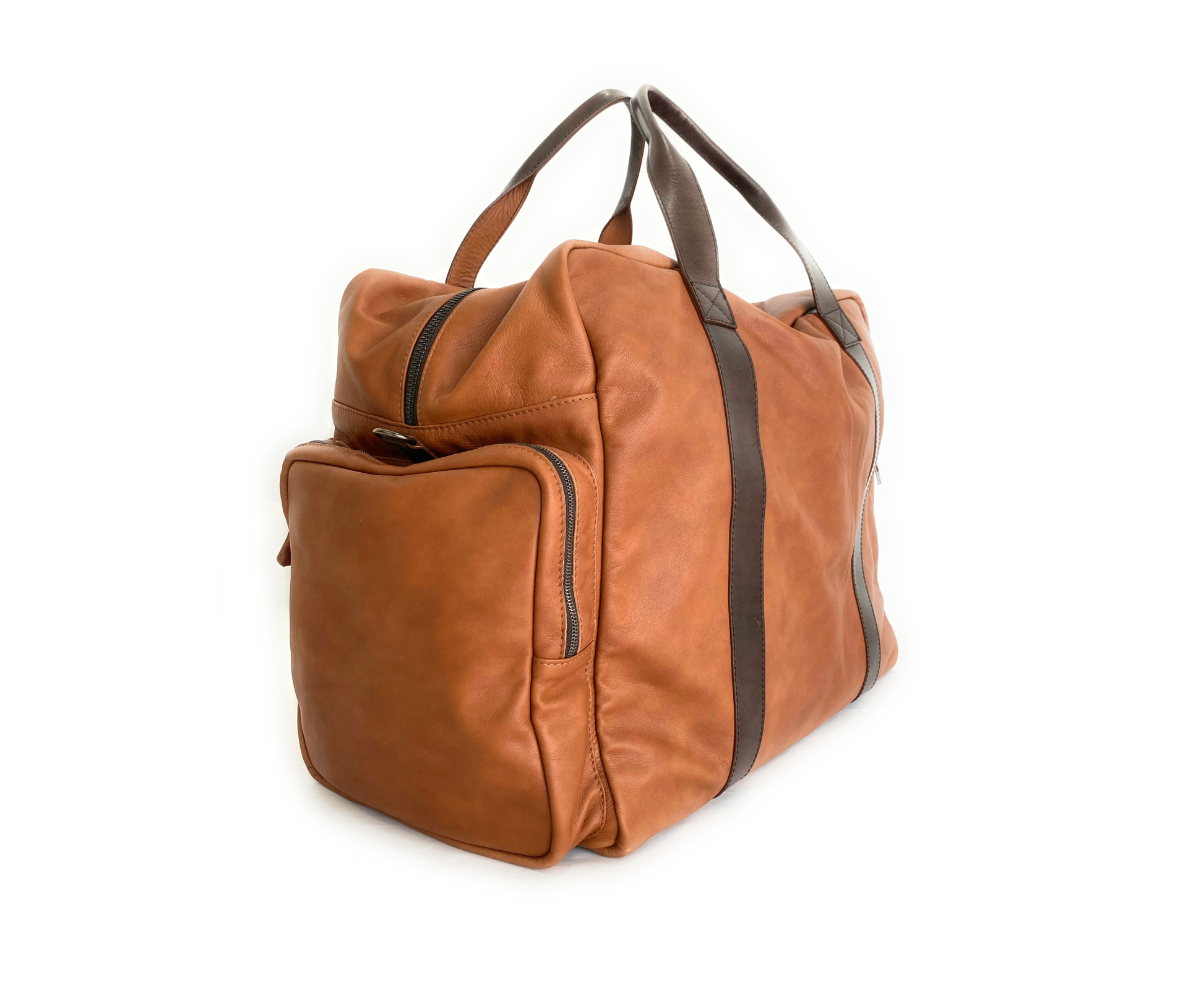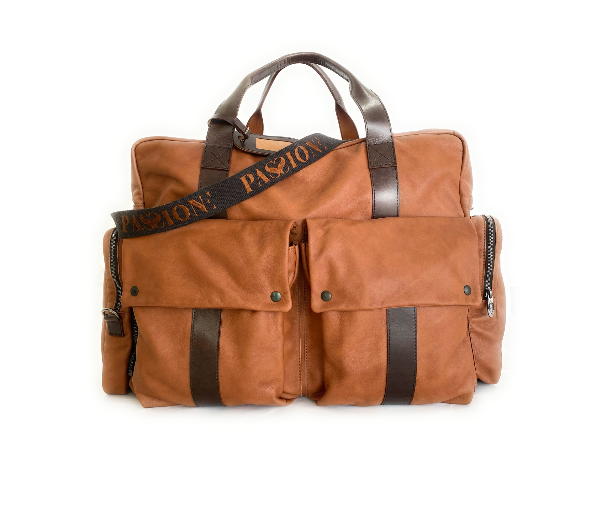 Borsa da viaggio unica realizzata in vera pelle morbida colore cuoio con inserti in cuoio testa moro.