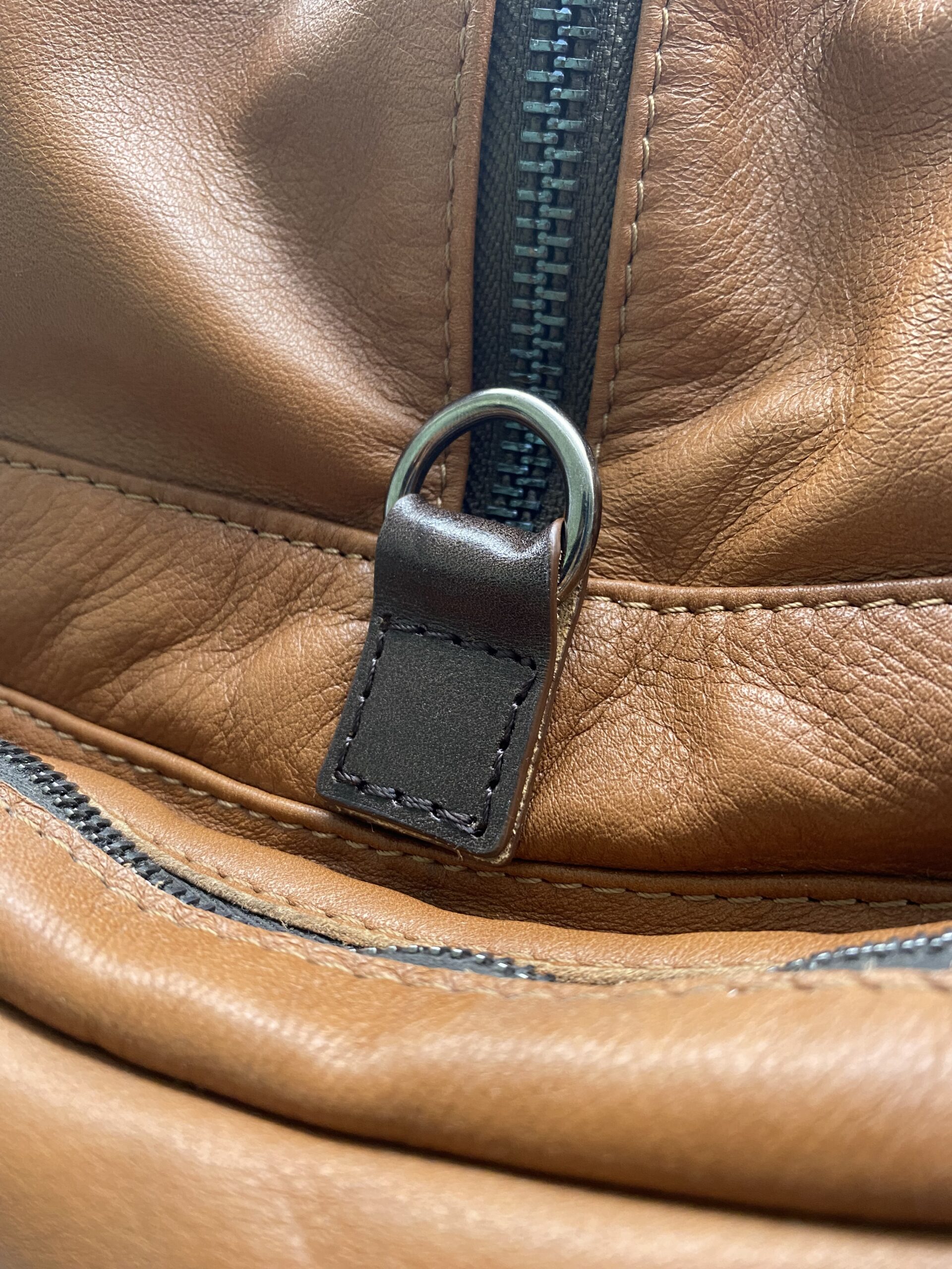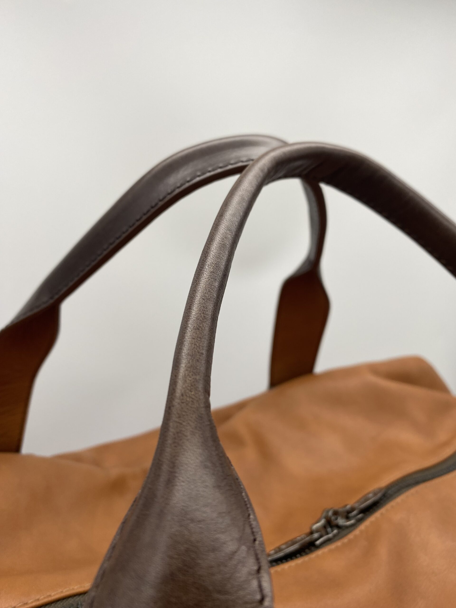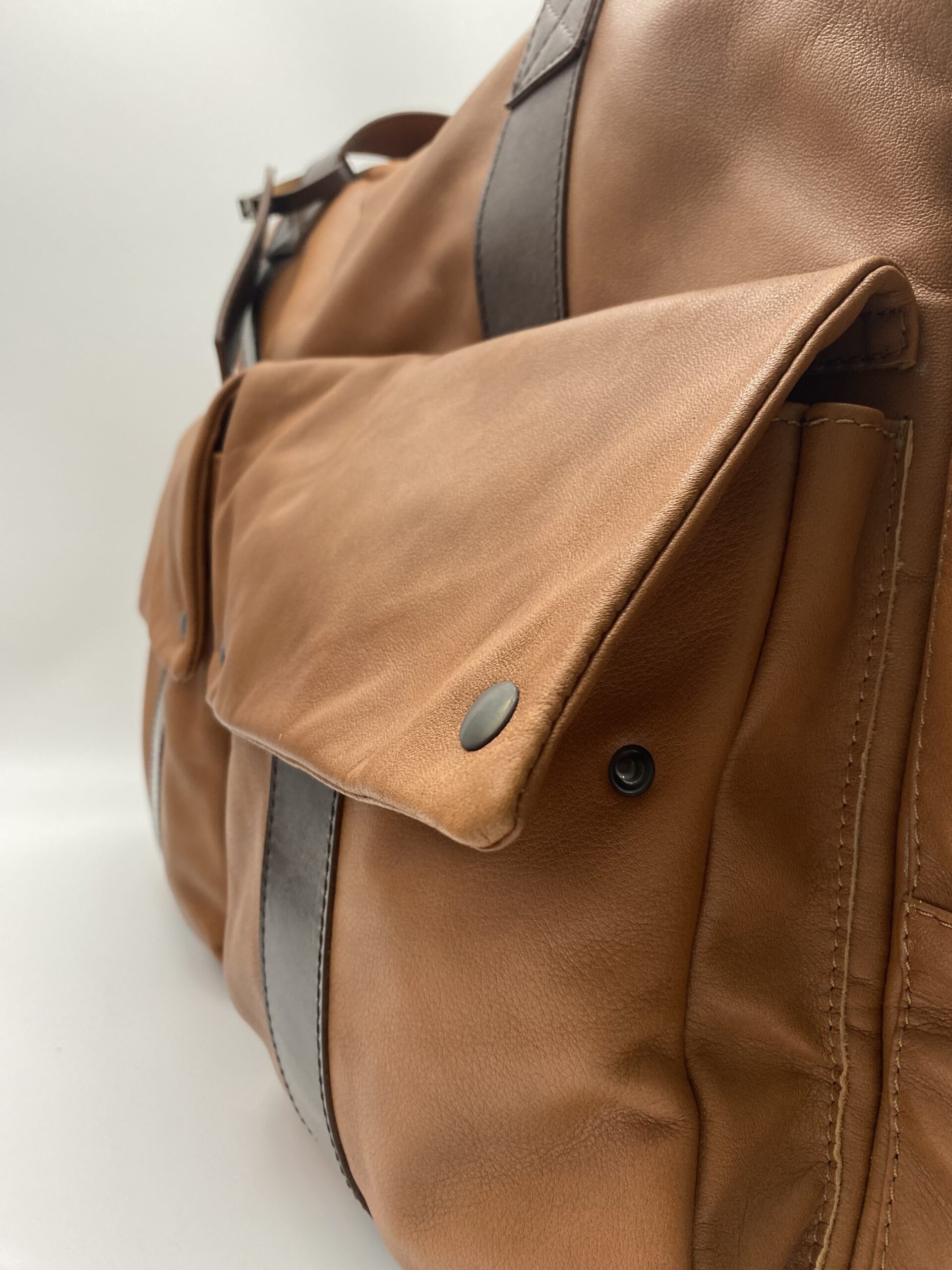 Borsa da viaggio unica realizzata in vera pelle morbida colore cuoio con inserti in cuoio testa moro.