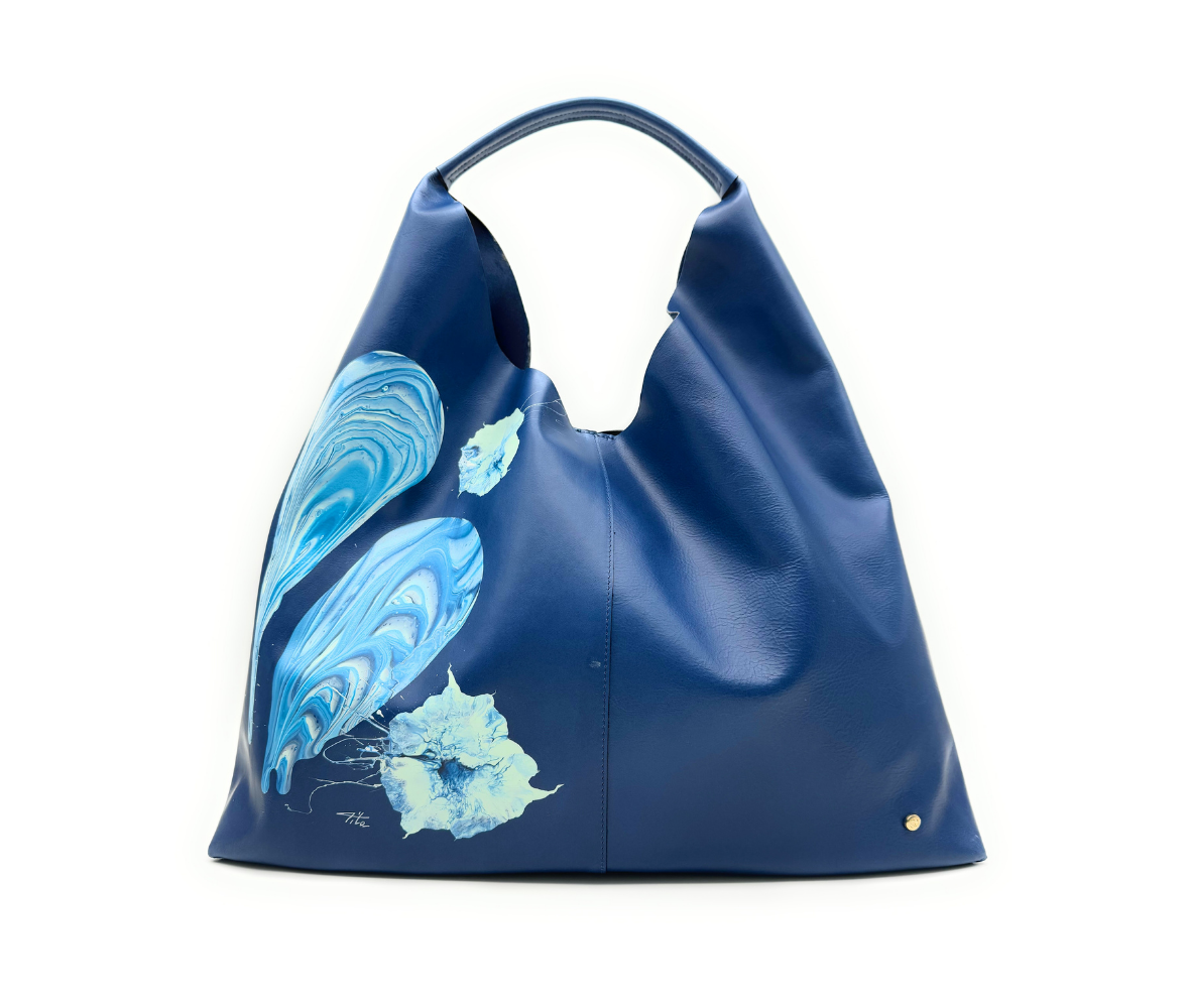 Sacca capiente in pelle blu impreziosita dalla Fluid Art.