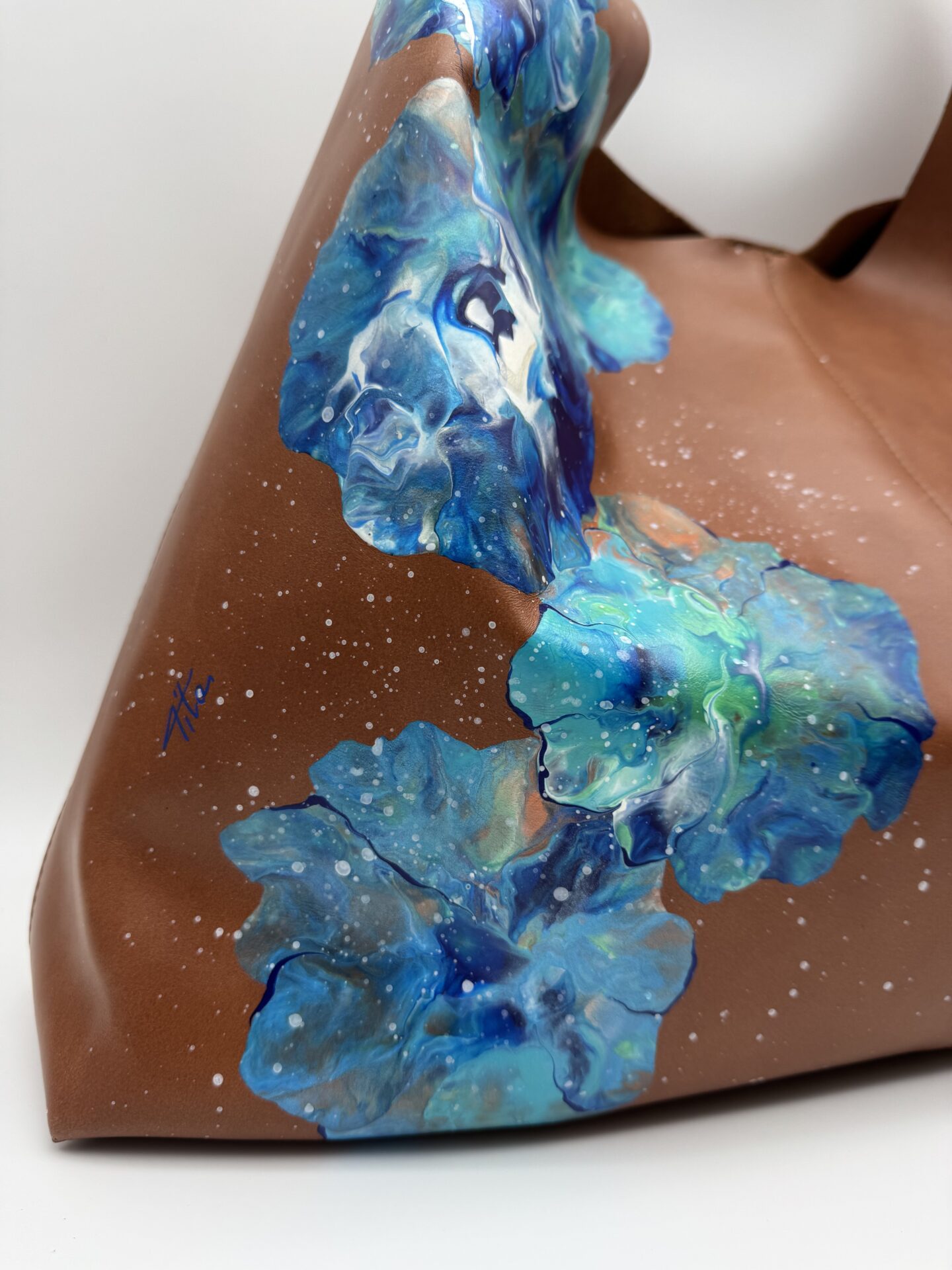 Una borsa morbida resa unica attraverso la tecnica artistica della Fluid Art che copre un lato della borsa.