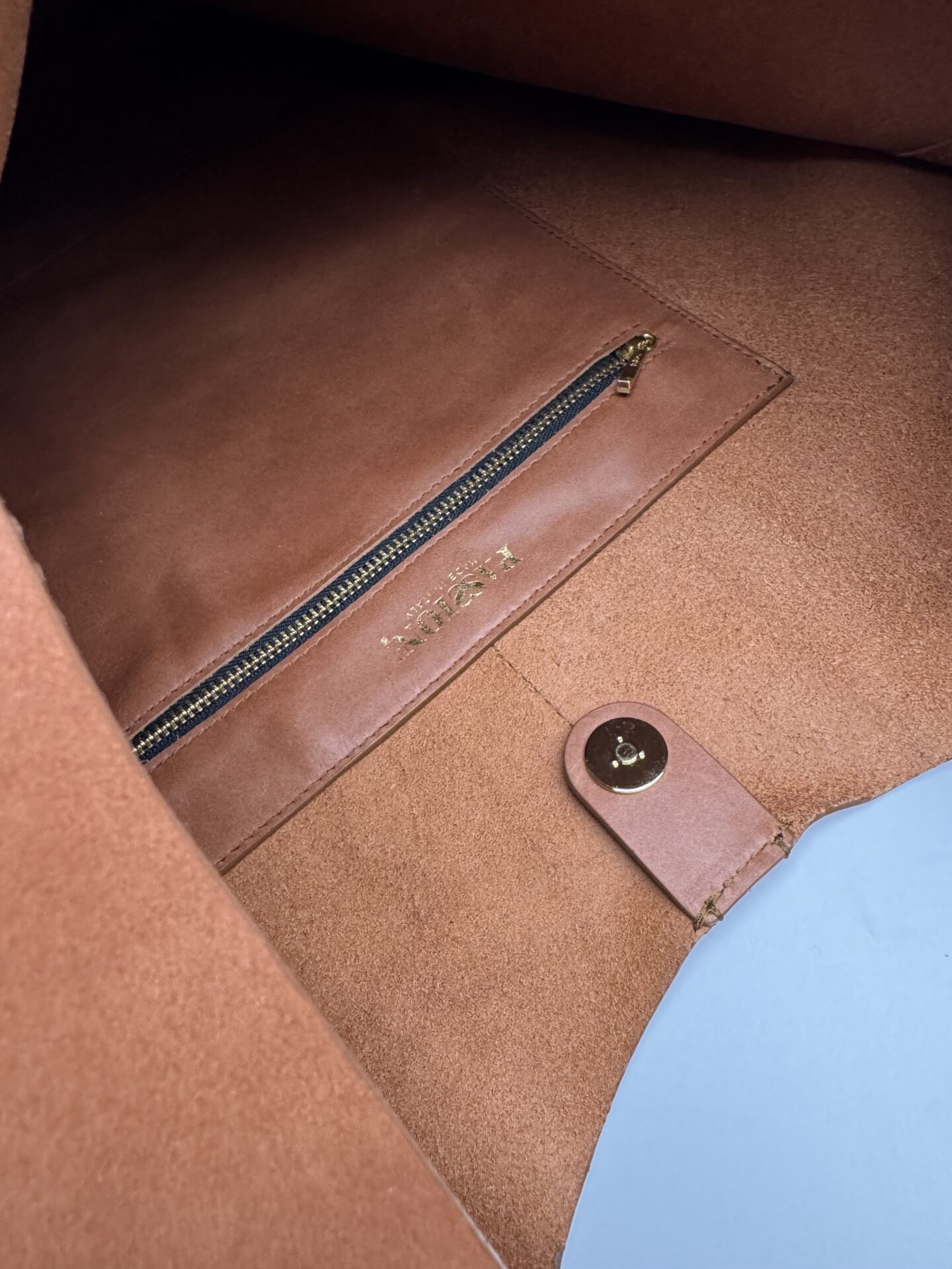 L’interno è sfoderato e presenta una tasca in pelle con chiusura a zip. Questo permette di contenere in modo sicuro ciò a cui sei più affezionato.