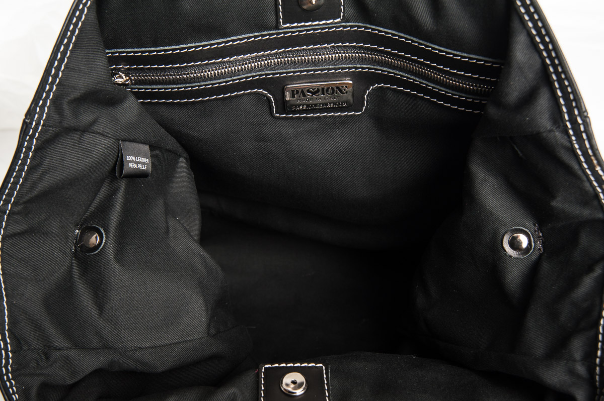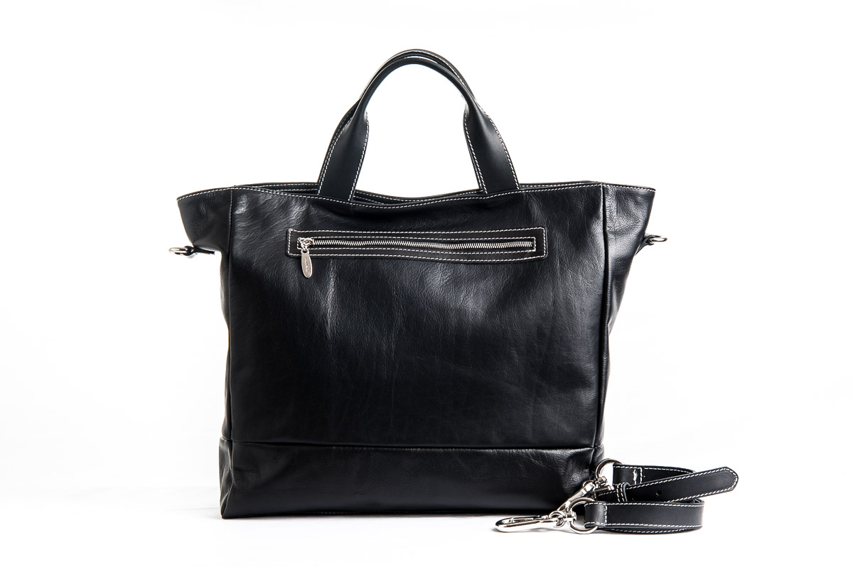 Realizzata in pelle nera con cuciture a contrasto. Doppio manico e tracolla in cuoio nero, regolabile e removibile. Si può indossare a mano o a tracolla.