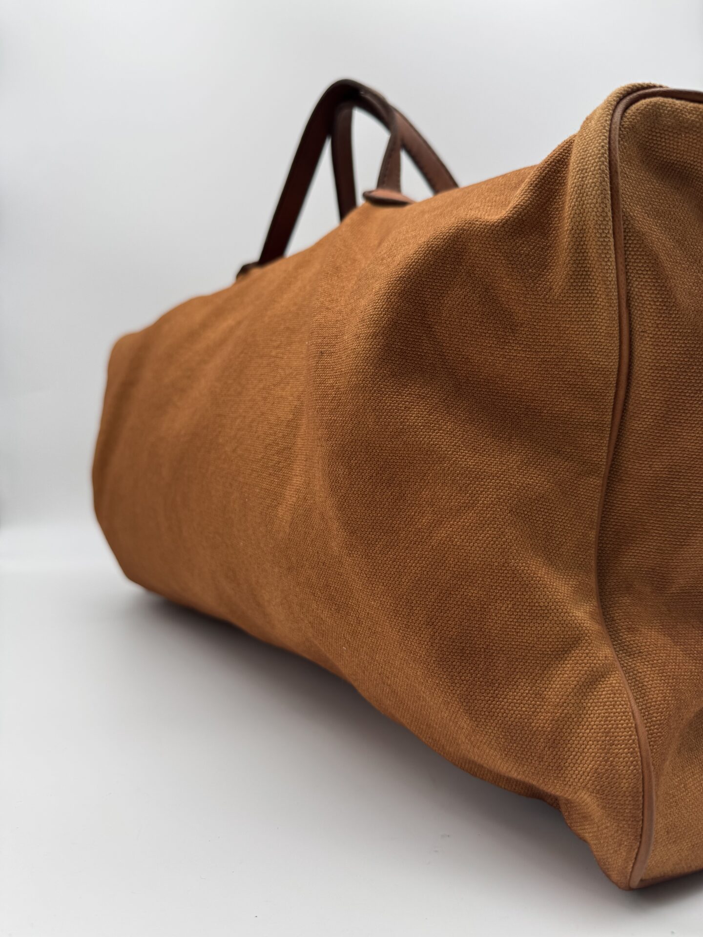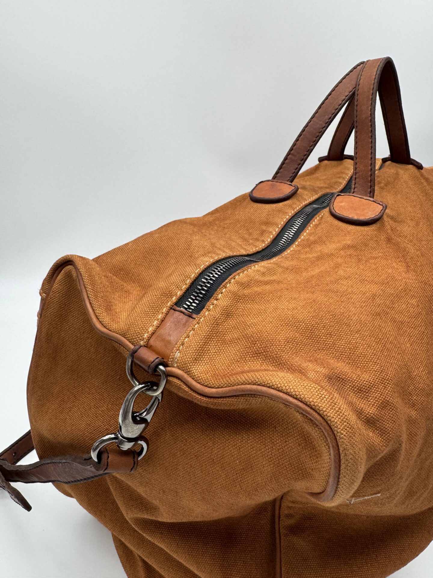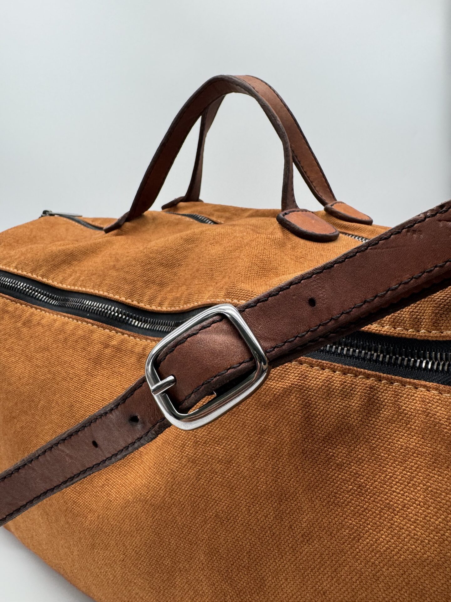 Borsone morbido dalla forma squadrata, realizzato in tessuto e con dettagli in vera pelle.
