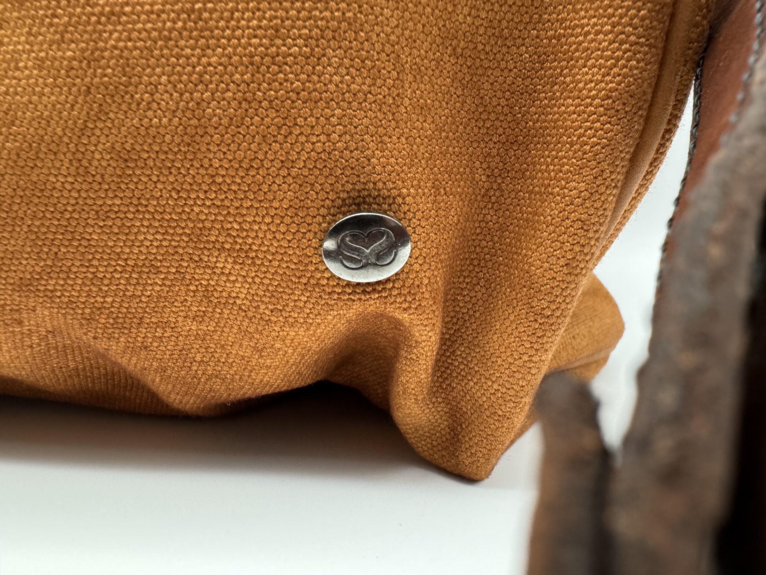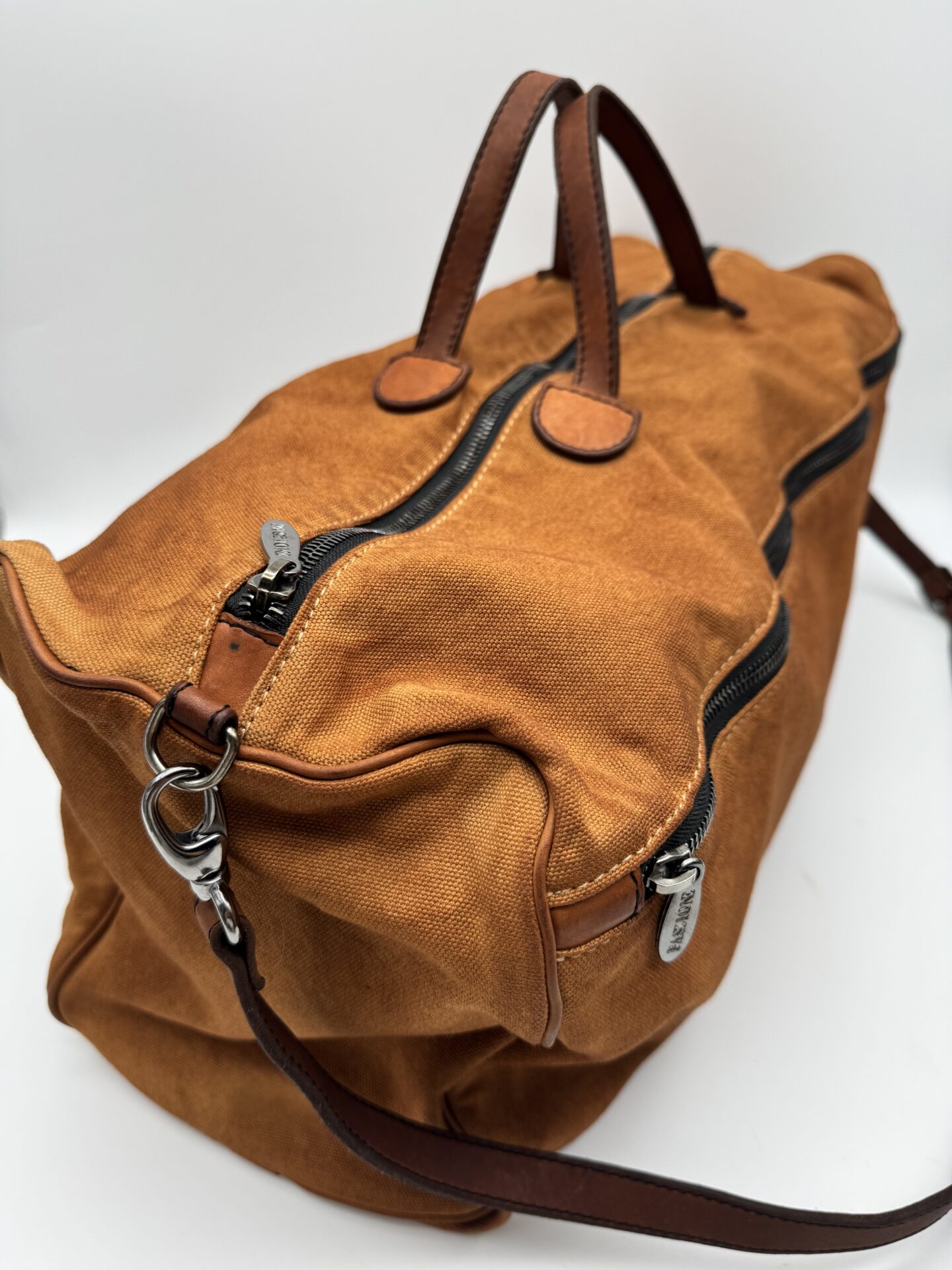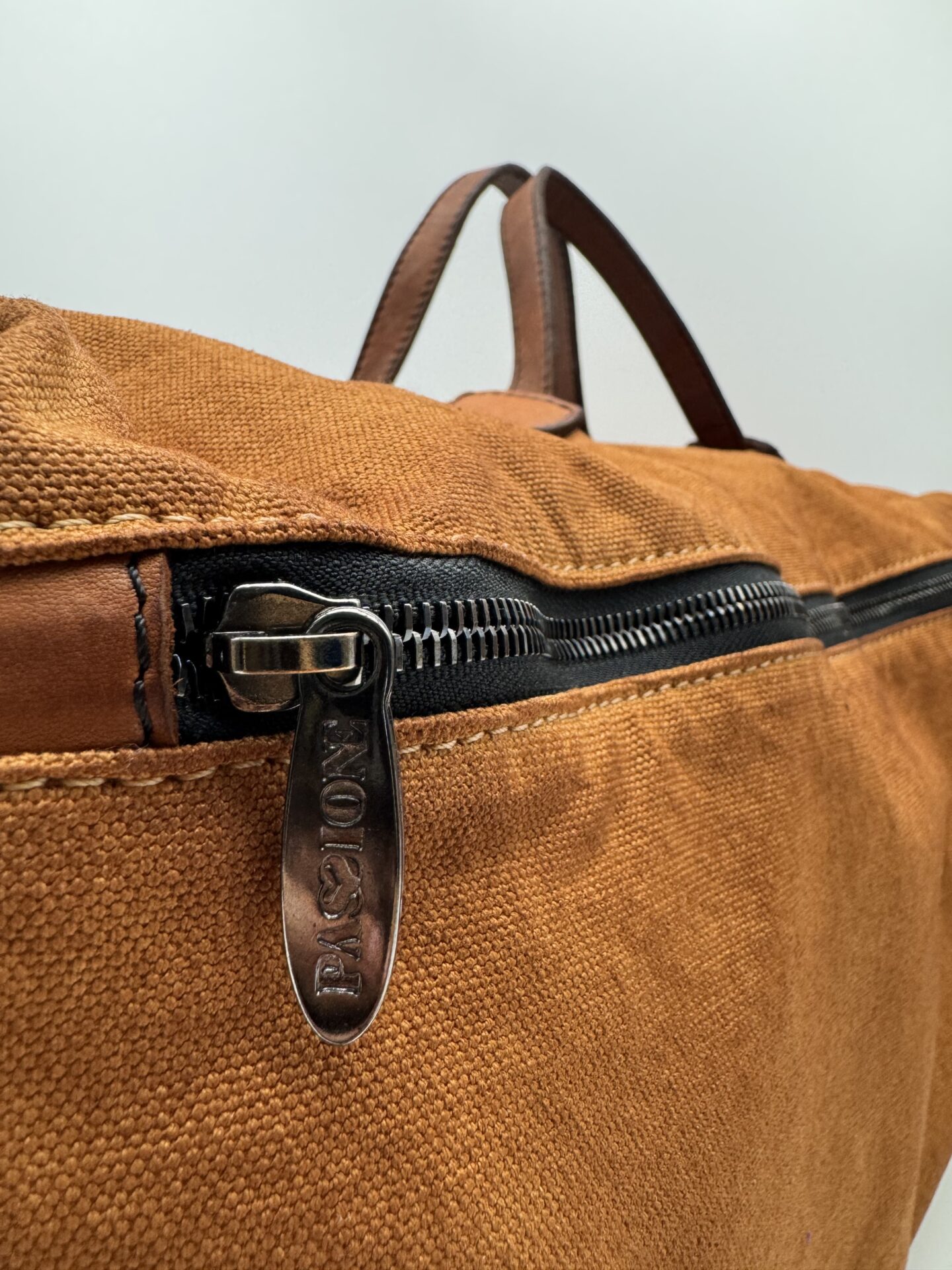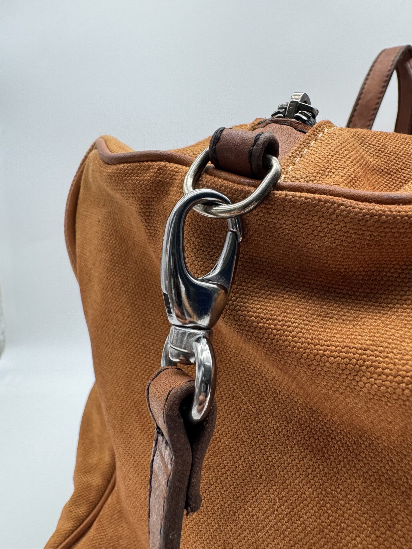 Borsone morbido dalla forma squadrata, realizzato in tessuto e con dettagli in vera pelle.