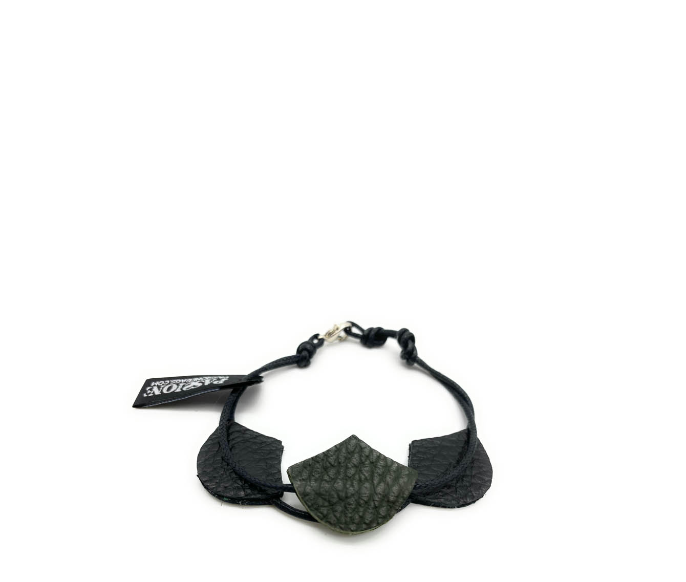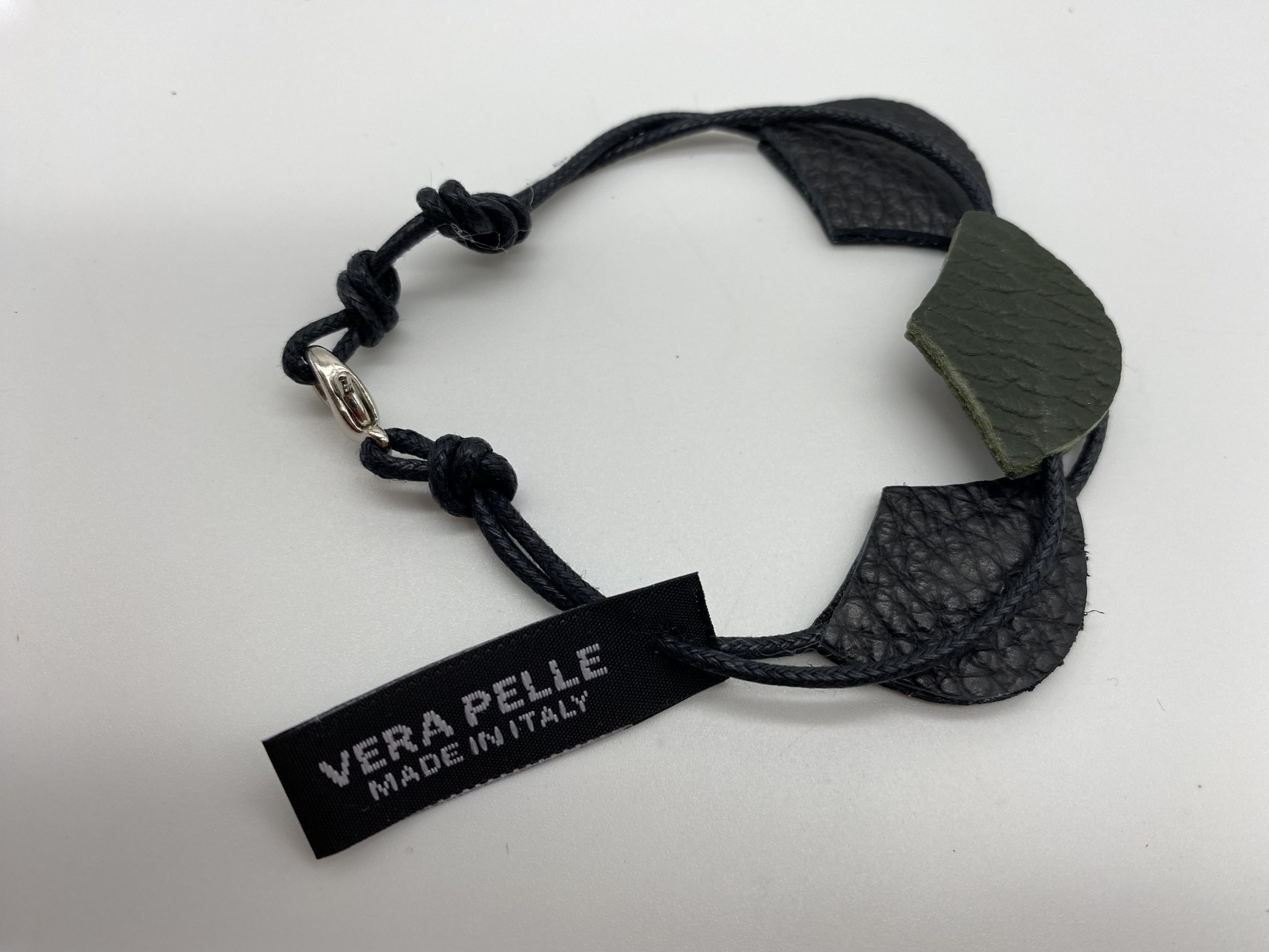 I piccoli spicchi (dimensioni 3 cm per 2,5 cm ognuno) sono realizzati in vera pelle colore nero e verde militare.