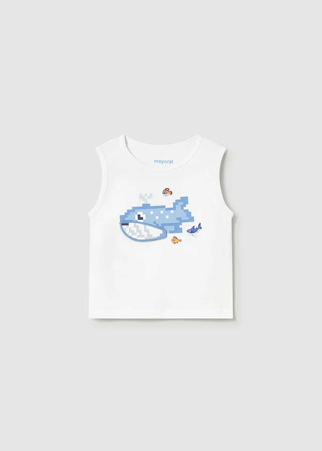 Canotta in cotone morbido per neonato e bambino, con stampa grafica esclusiva Mayoral. Design pratico e confortevole, perfetto per le giornate calde. Tessuto traspirante che garantisce libertร  di movimento. Ideale da indossare da solo o in abbinamento con altri capi della collezione estiva. Art 1018-011 – – Mayoral