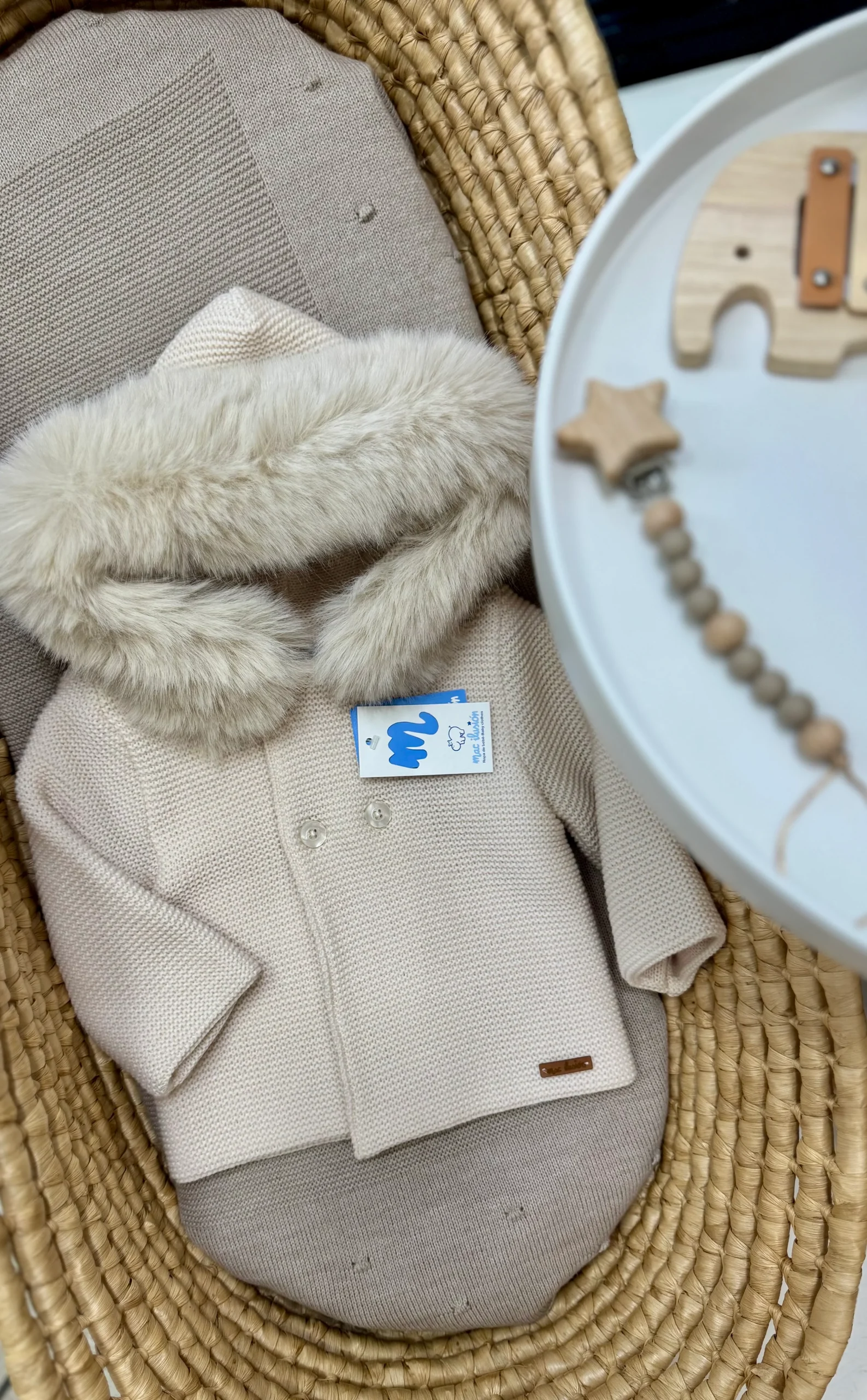 Cappotto beige unisex Mac Ilusion in 100% lana pettinata, dotato di bottoni e cappuccio con pelliccia di volpe originale removibile tramite bottoni. Ideale per l’inverno, rappresenta un elemento essenziale nel guardaroba stagionale.