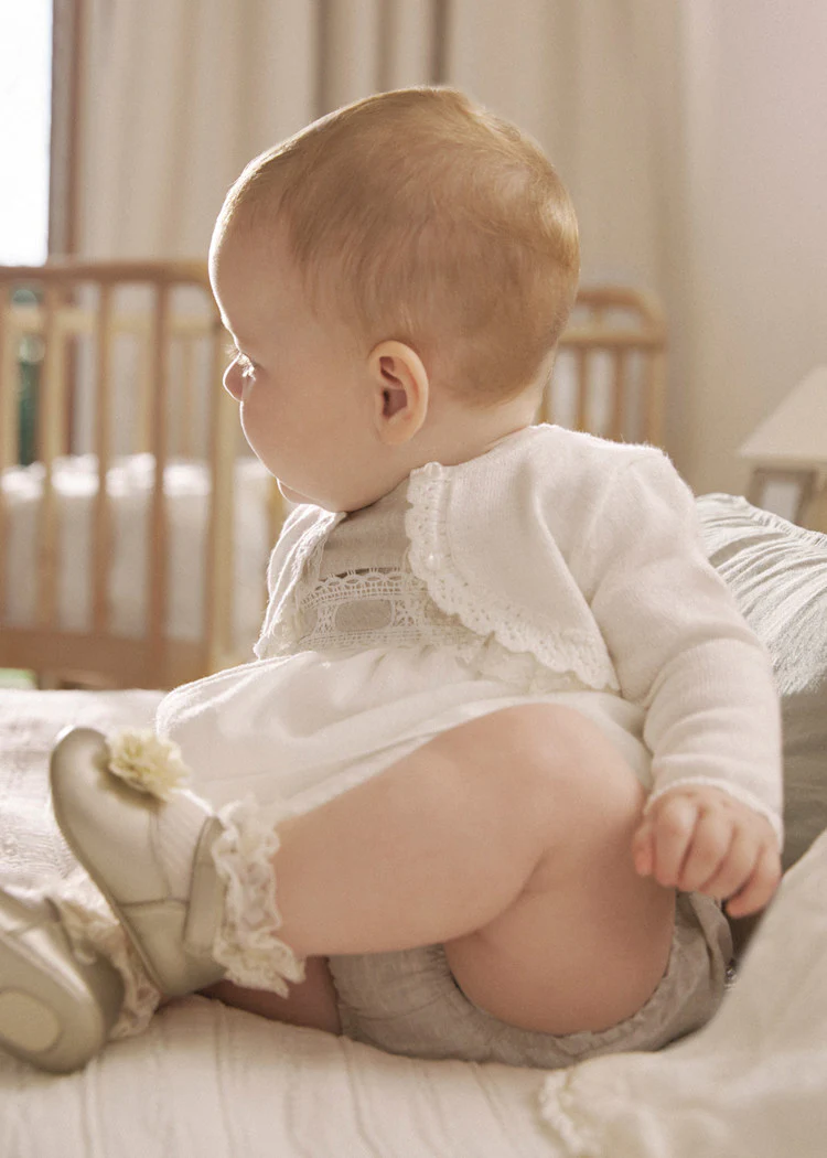 Cardigan color naturale per la sua cerimonia. Morbido ed elegante, รจ perfetto per battesimi e occasioni speciali.