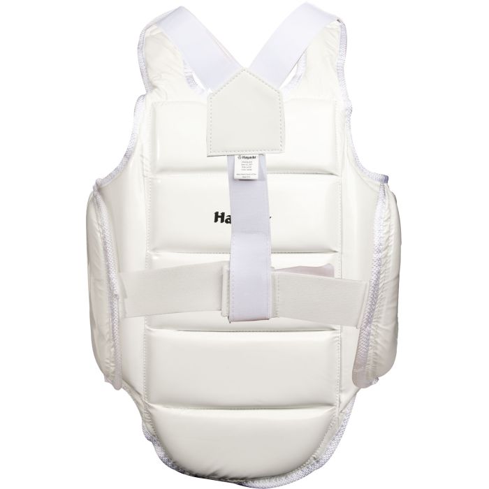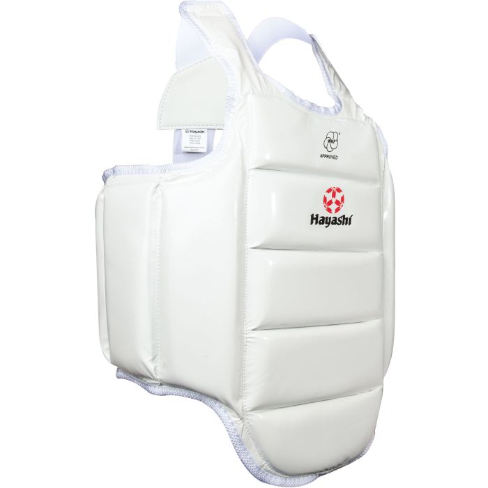 Young karateka in the U 14 category get more security in the competition area. Because the children’s chest protector WKF U14 is tailored precisely to their needs in Kumite Karate. The vest’s fit allows full mobility of the upper body while simultaneously protecting the chest and abdomen with the divided padding on the front. Lateral foam pads maximize the safety performance of the U14 children’s chest protector, while the braces system makes it easy to don and doff the protective gear. The WKF-approved label is clearly visible on the white imitation leather surface and the Hayashi brand print. Additional advantages:…