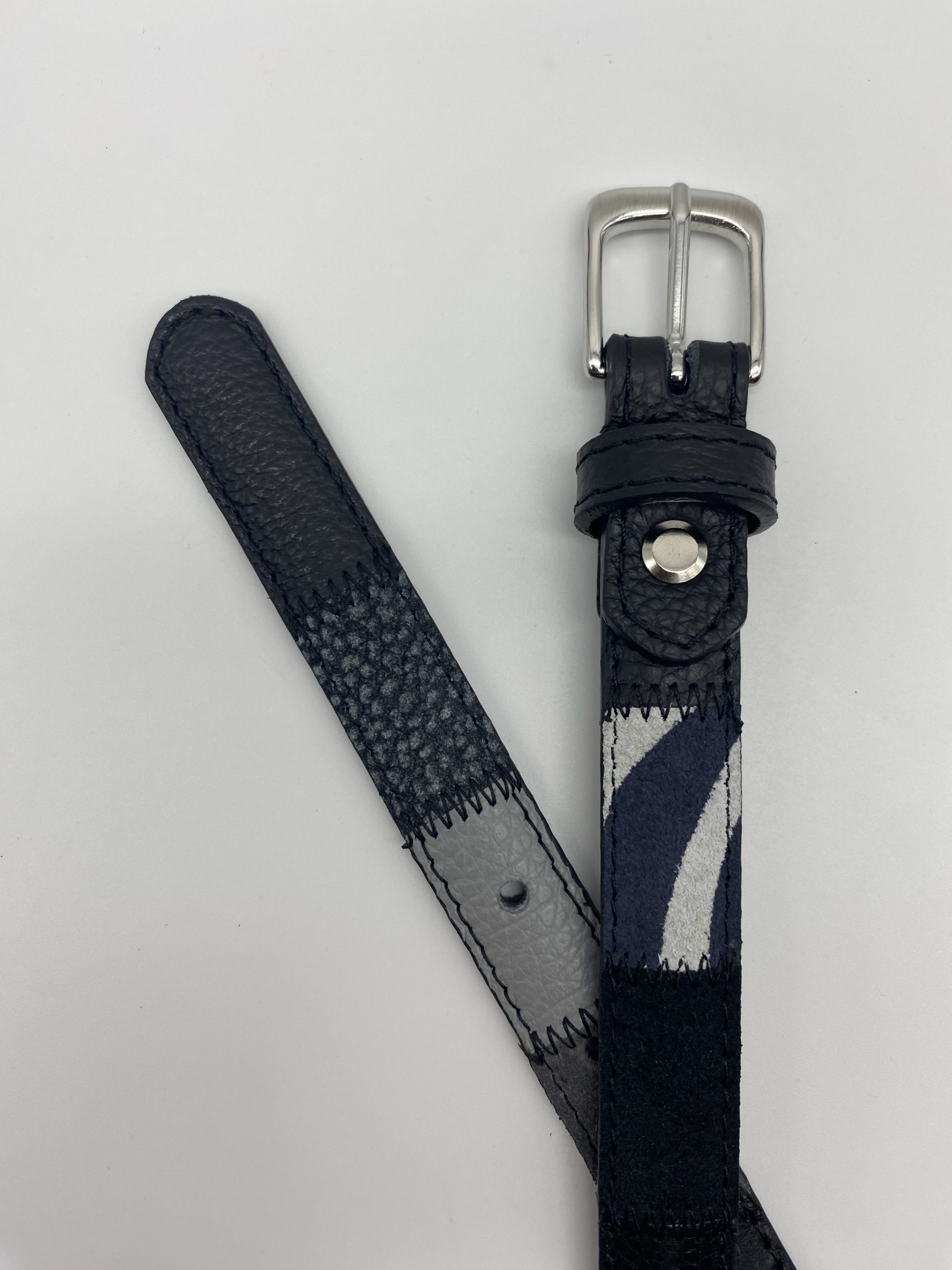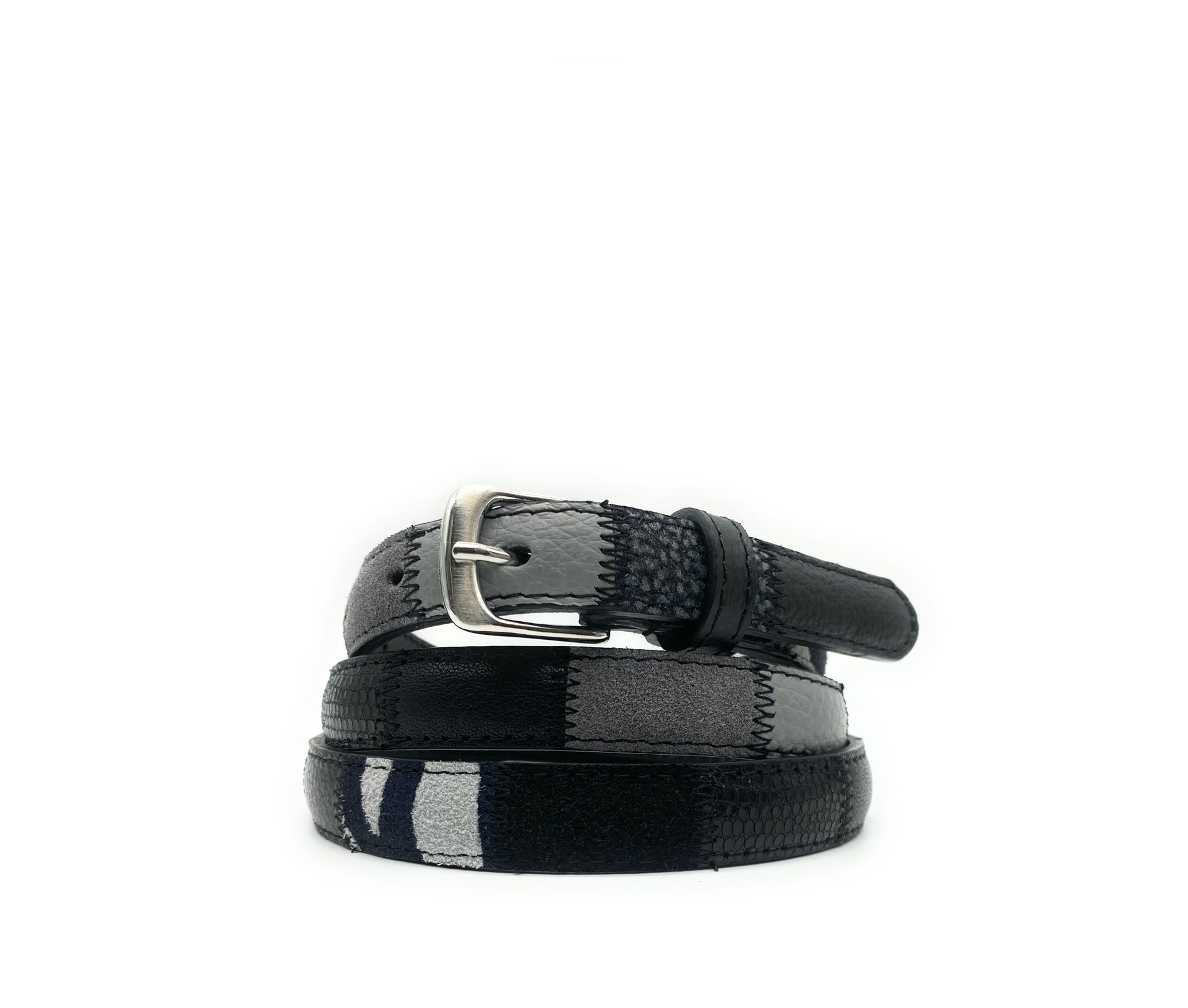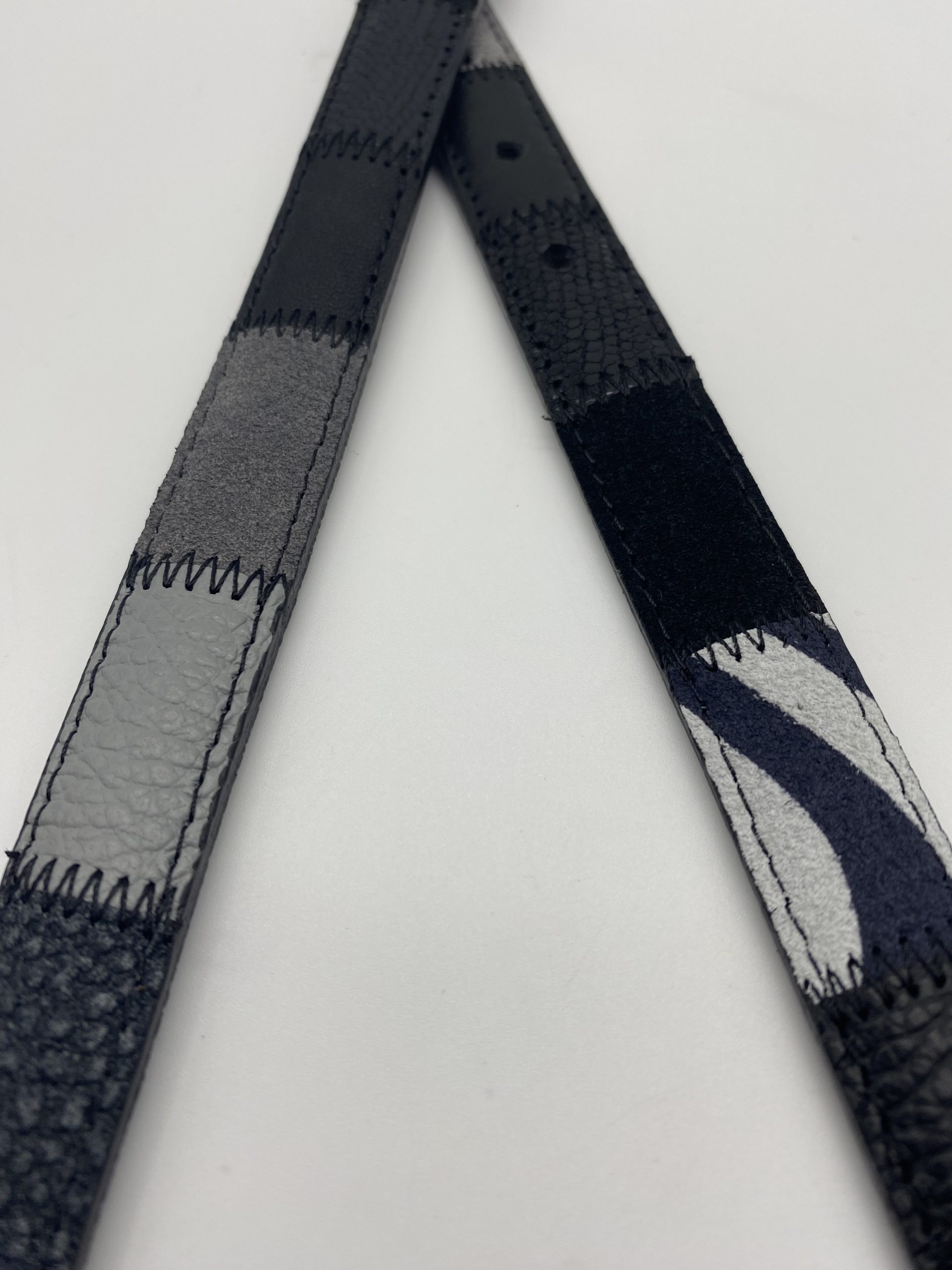 Cintura patchwork alta 20 mm realizzata accostando vari tipi di pelle dalle sfumature di nero, grigio.