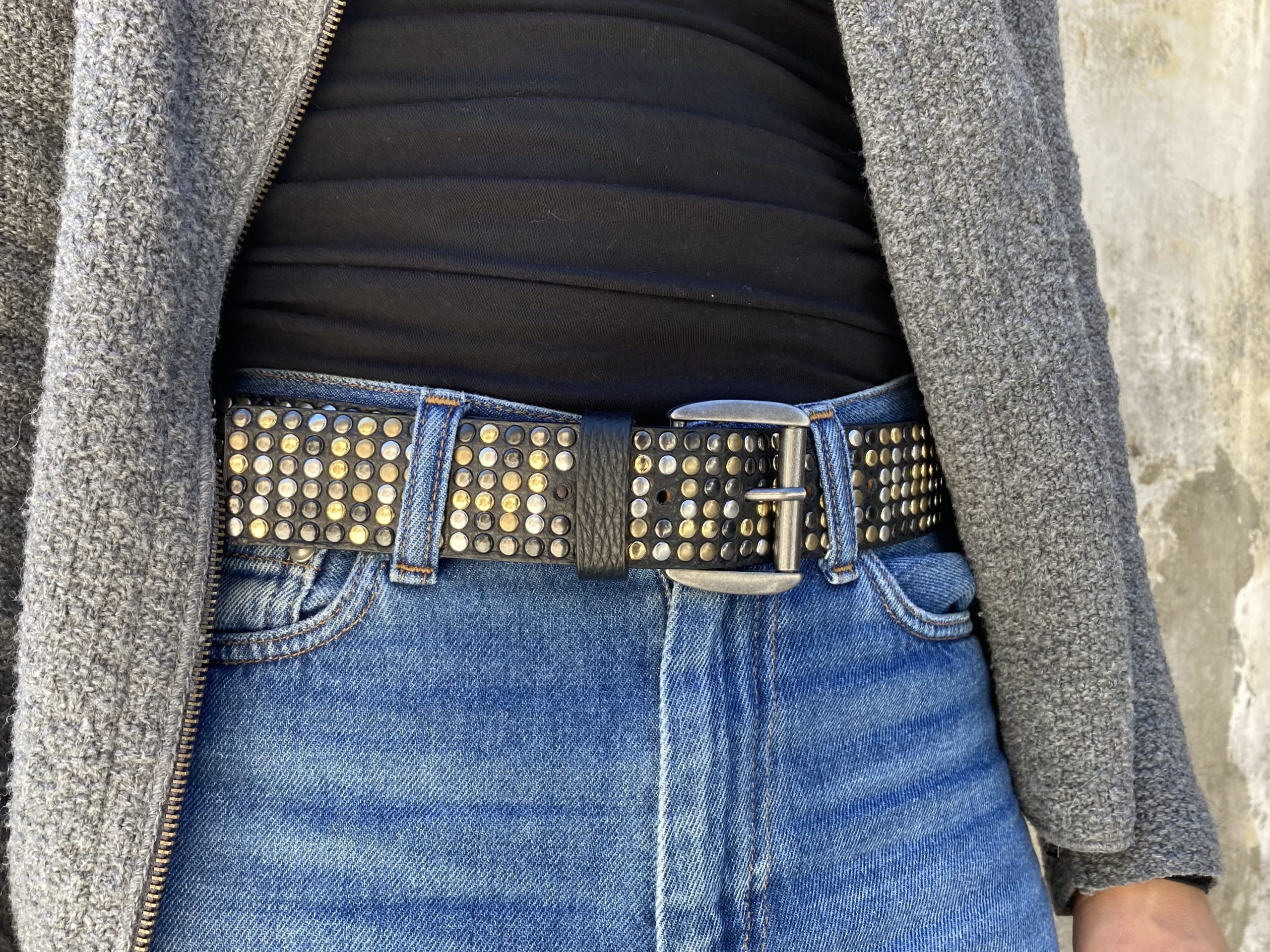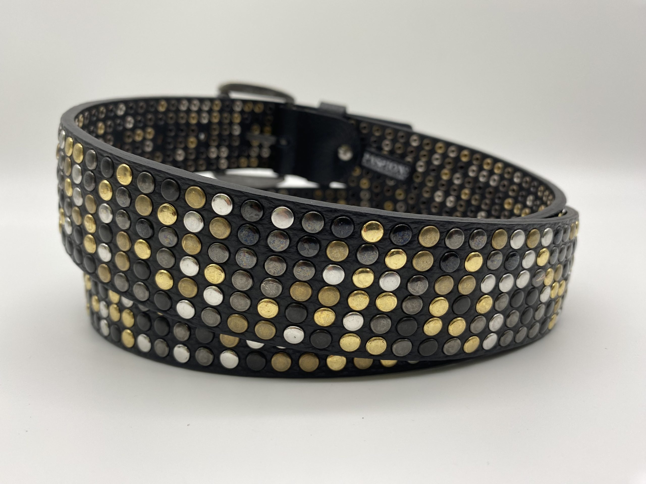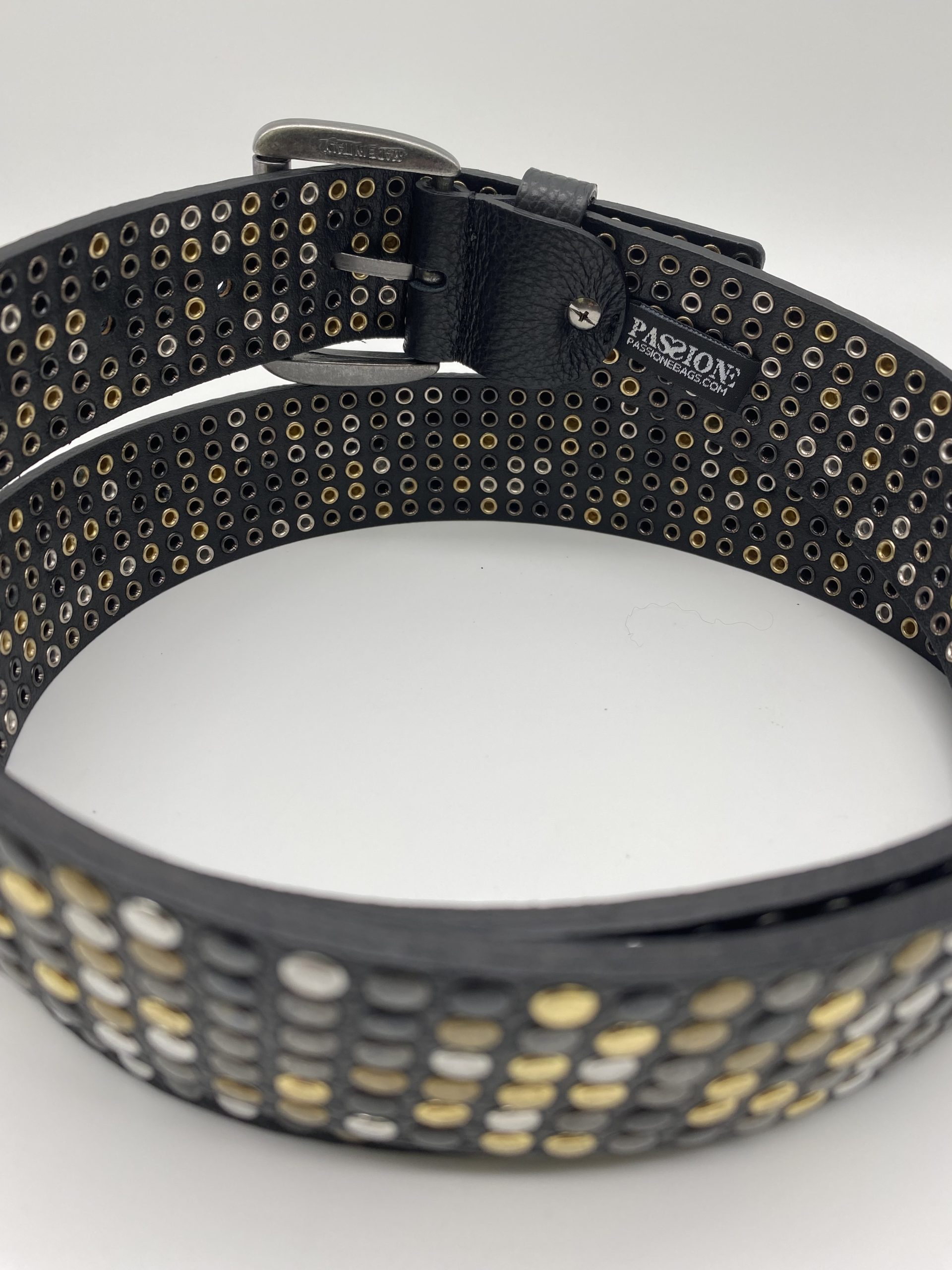 Cintura fashion creata applicando 6 FILE DI BORCHIE colore oro, argento, ottone vecchio e canna di fucile.