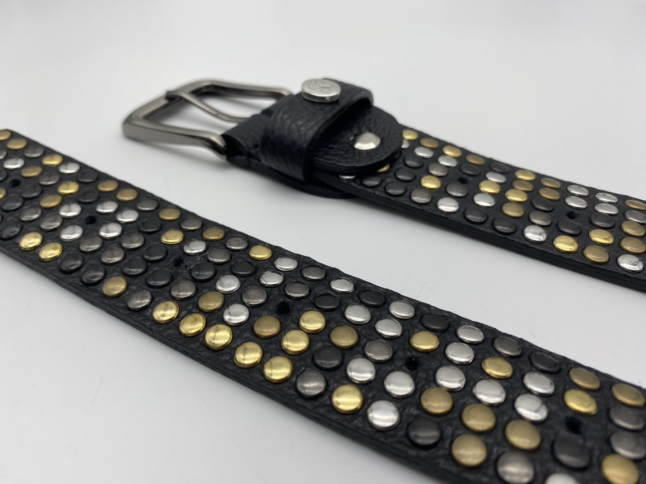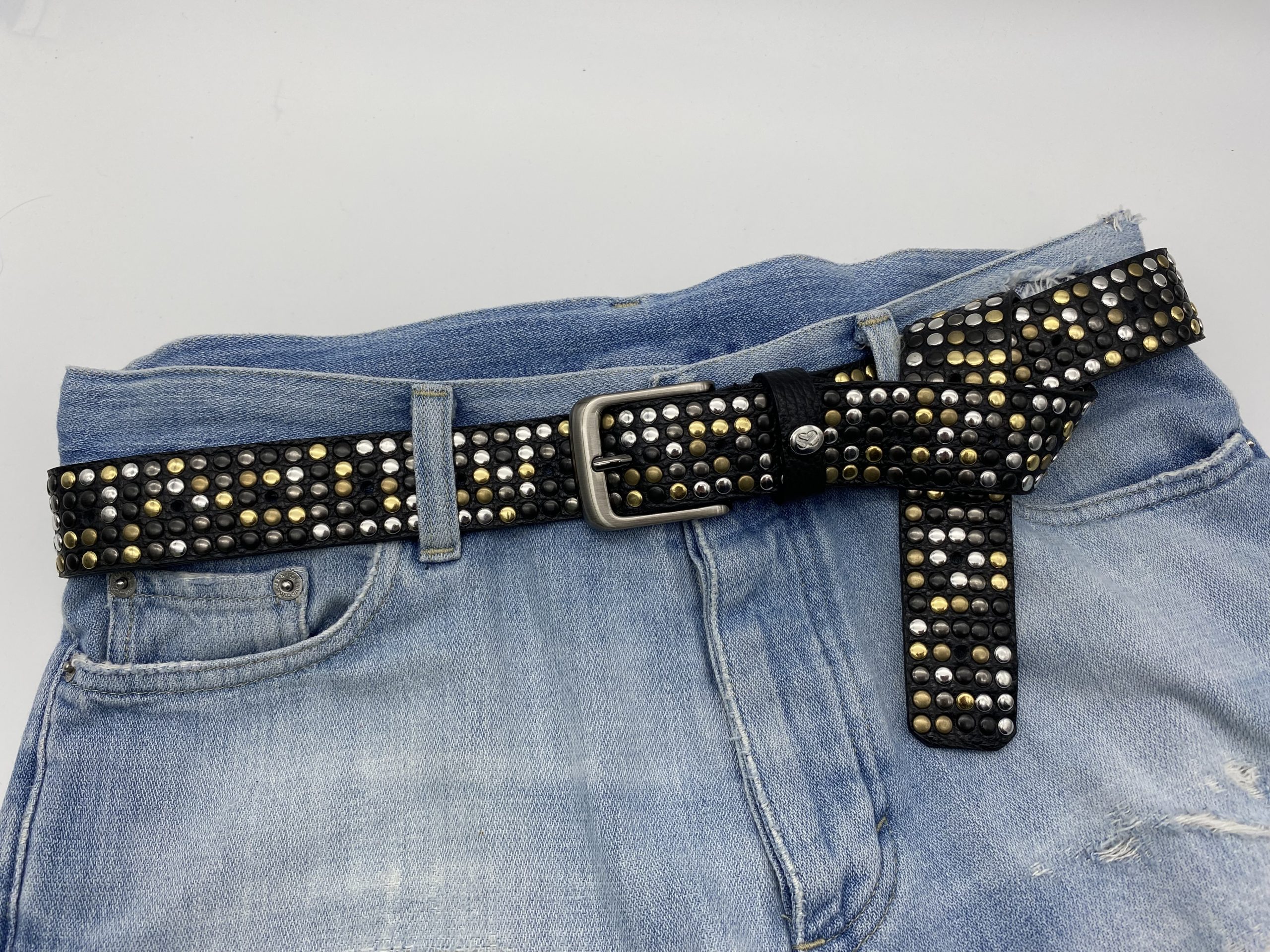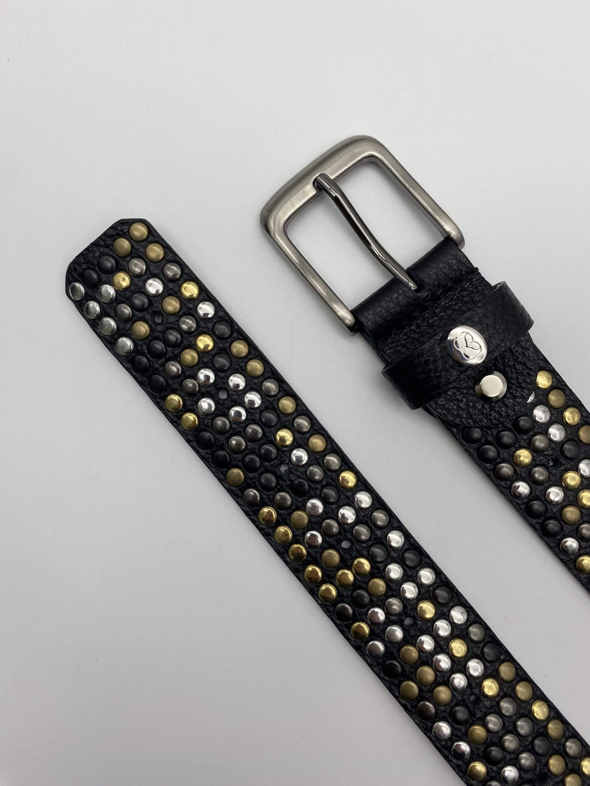 La cintura presenta borchie colore oro, argento, ottone, canna fucile e nero disposte in maniera casuale. Questa tecnica rende ogni cintura un pezzo unico.