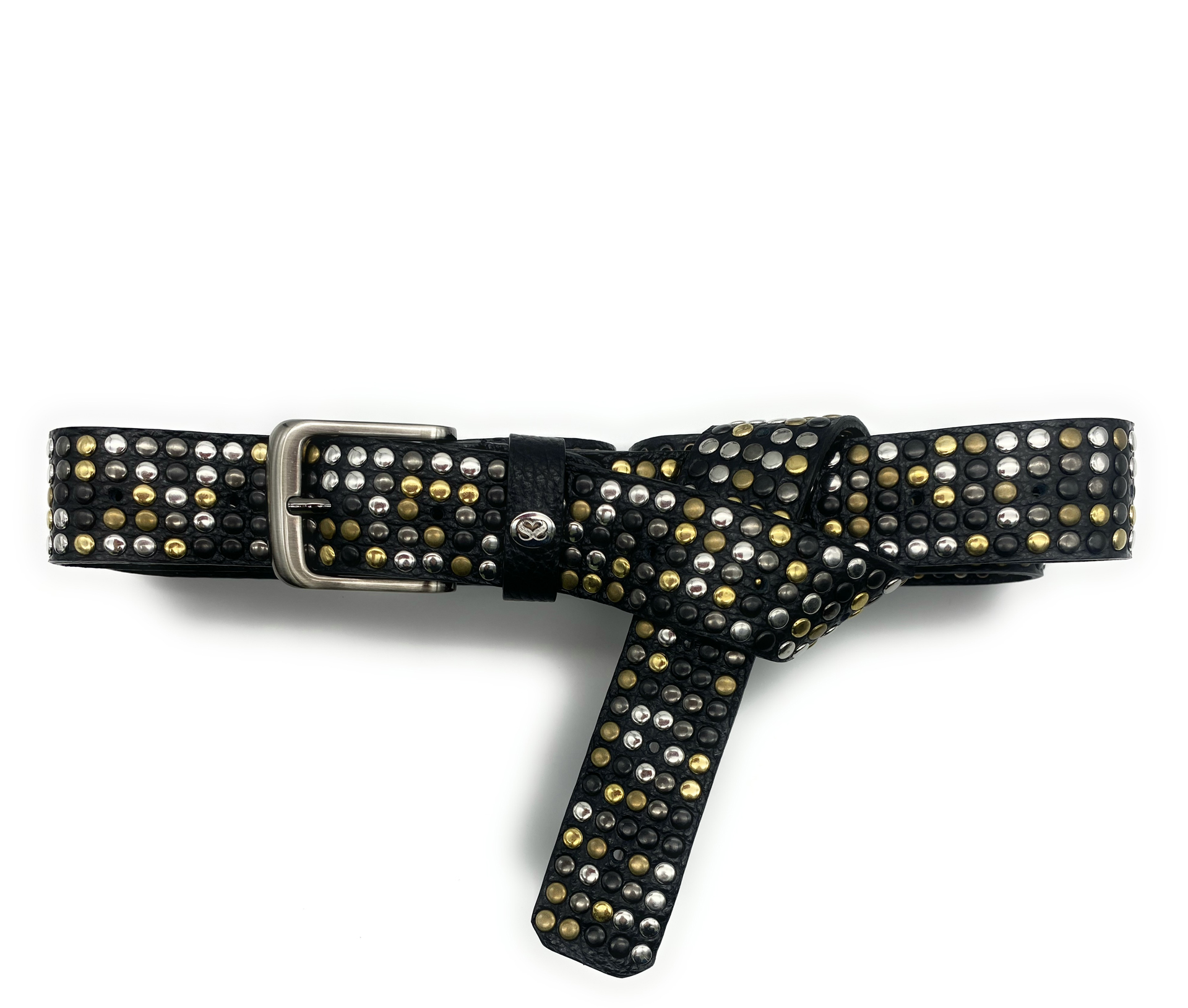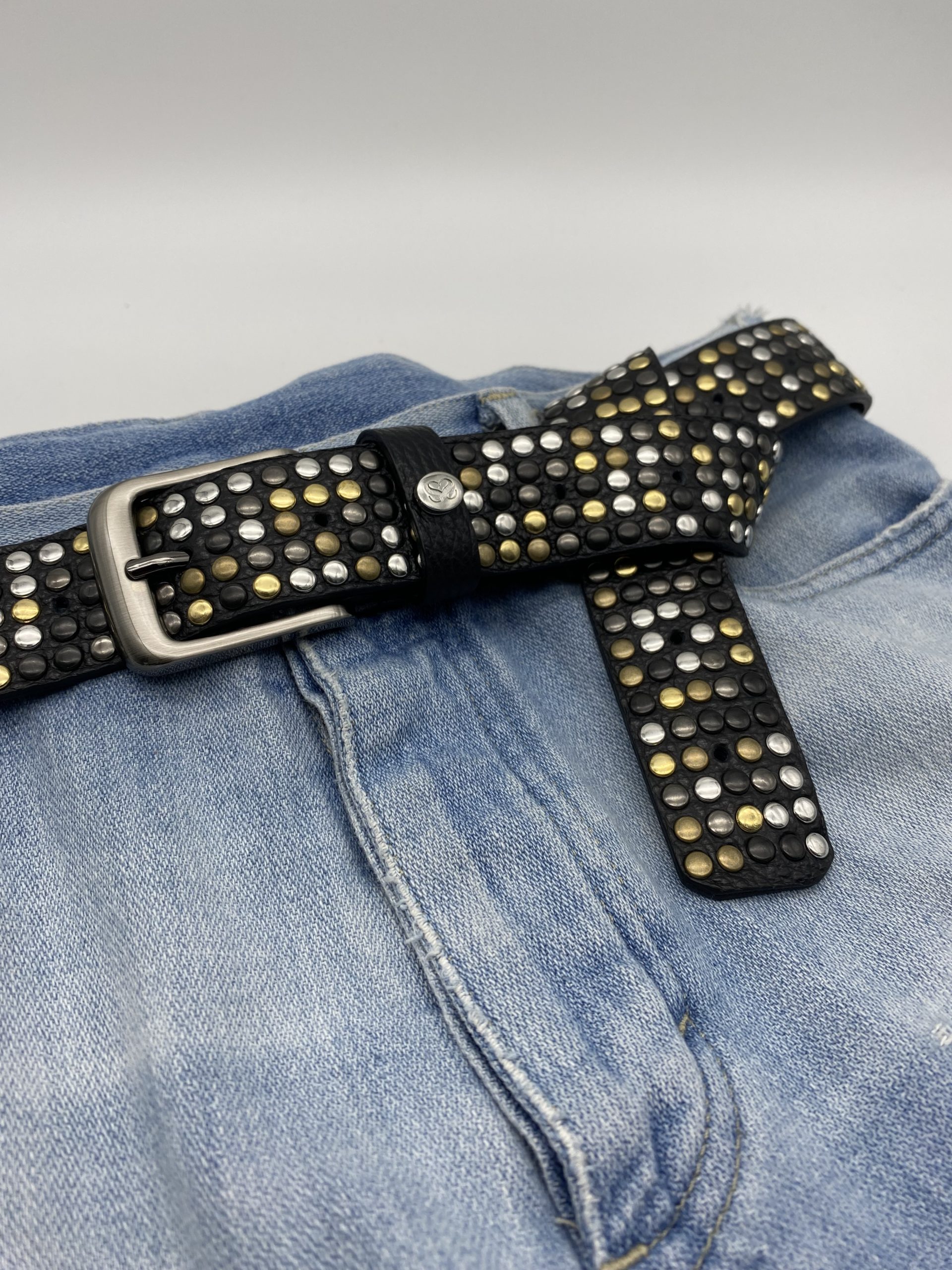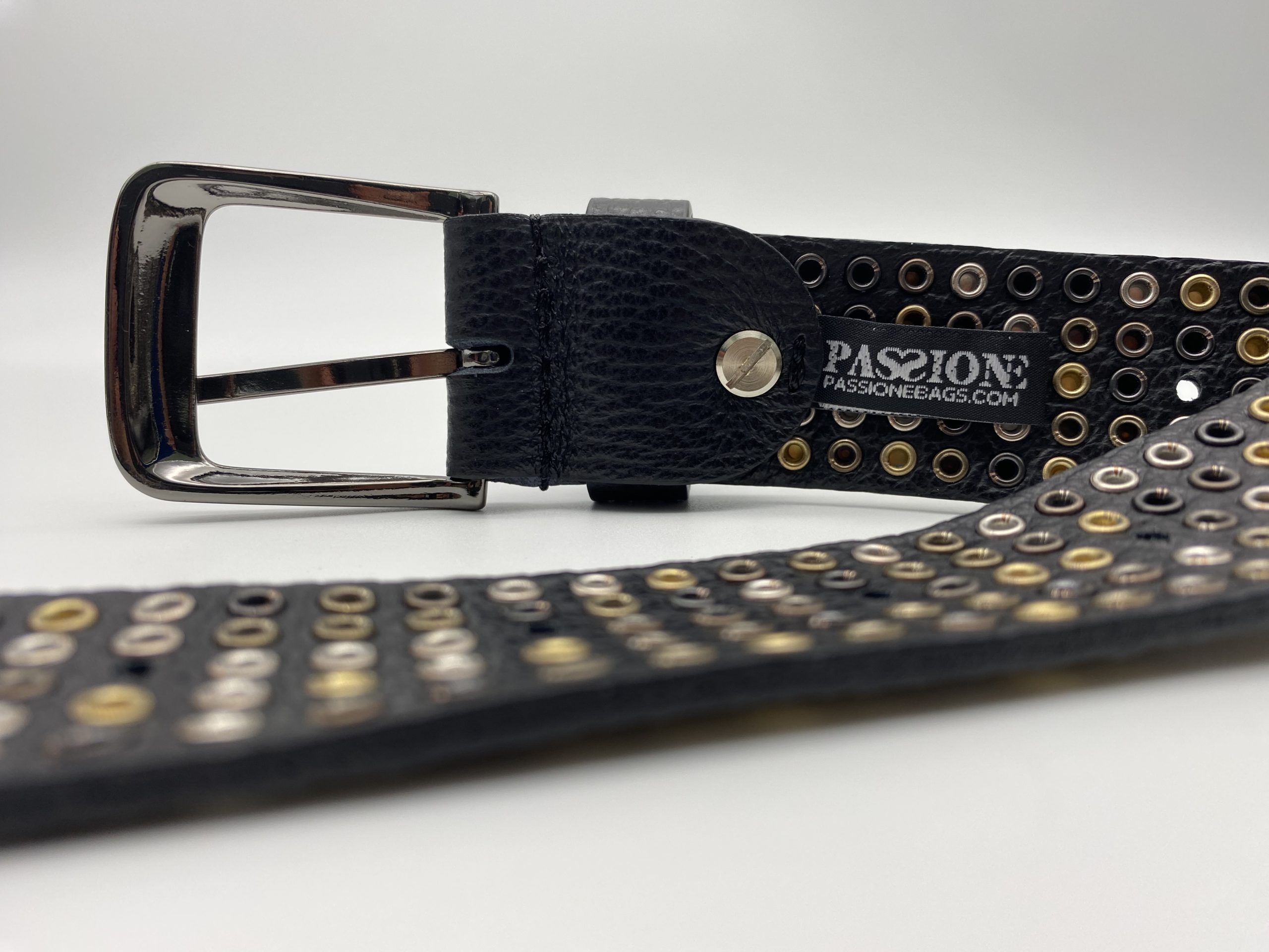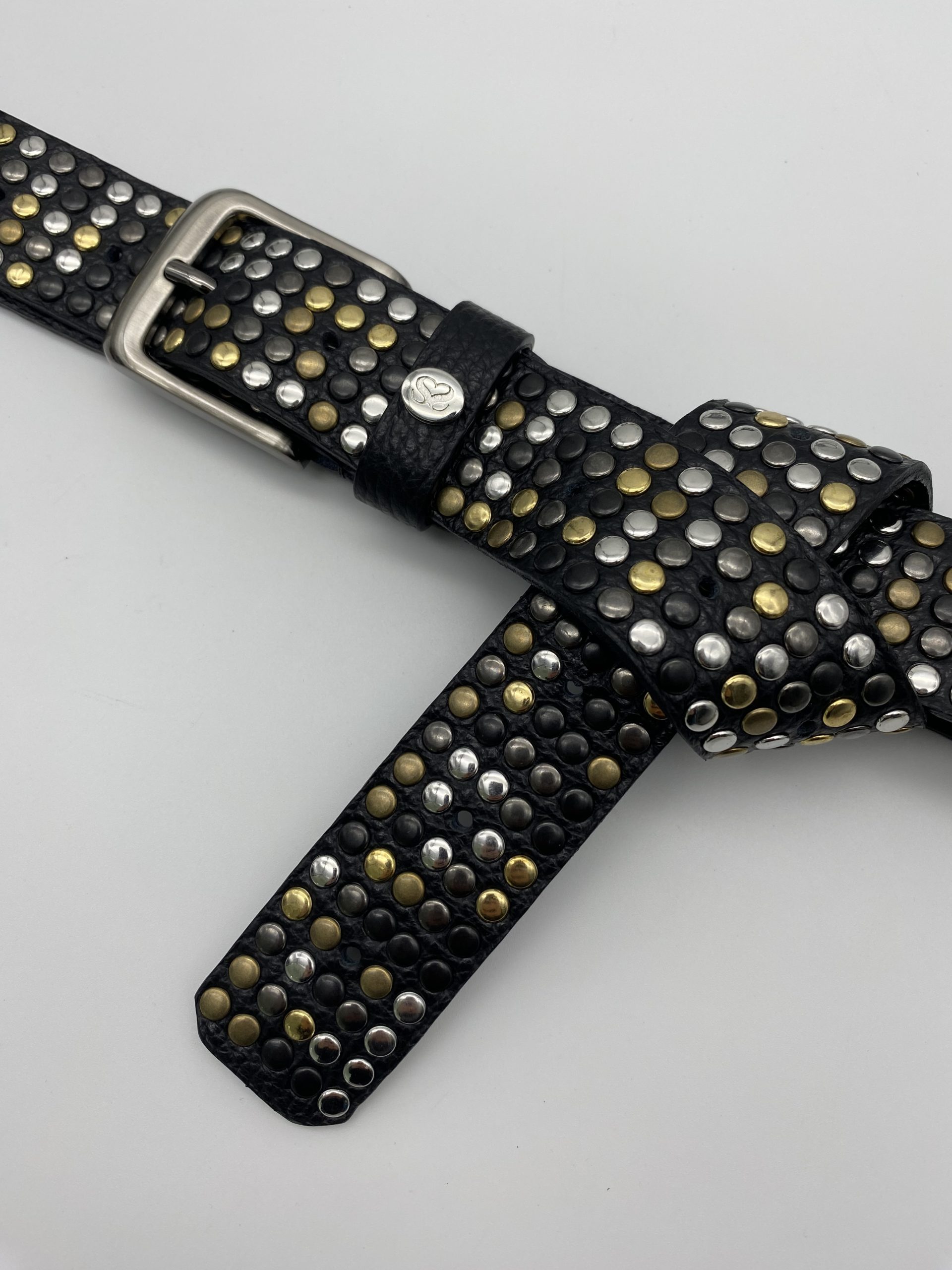 La cintura presenta borchie colore oro, argento, ottone, canna fucile e nero disposte in maniera casuale. Questa tecnica rende ogni cintura un pezzo unico.