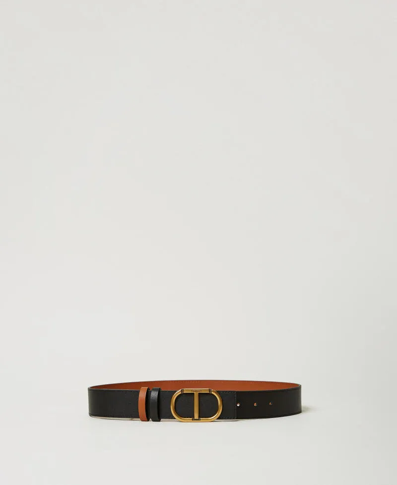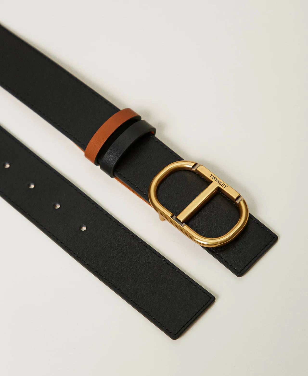Cinturareversibile a vita bassa in pelle ed effetto pelle, con fibbia Oval T in galvanica ottone anticato, passanti bicolore.