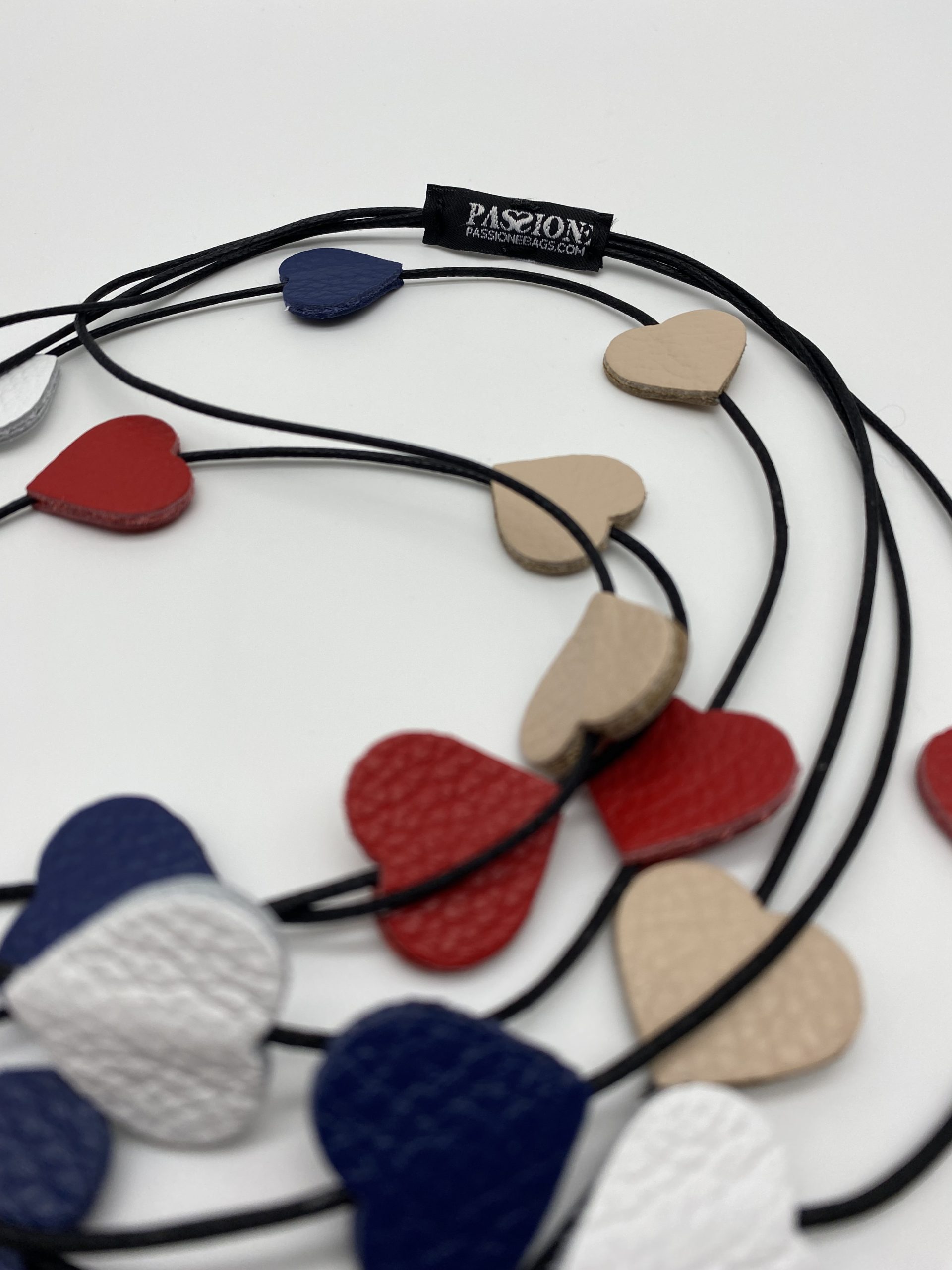 Lungo la corda sono disposti piccoli cuori (dimensioni 2,5 cm per 2,5 cm ognuno) in vera pelle.
