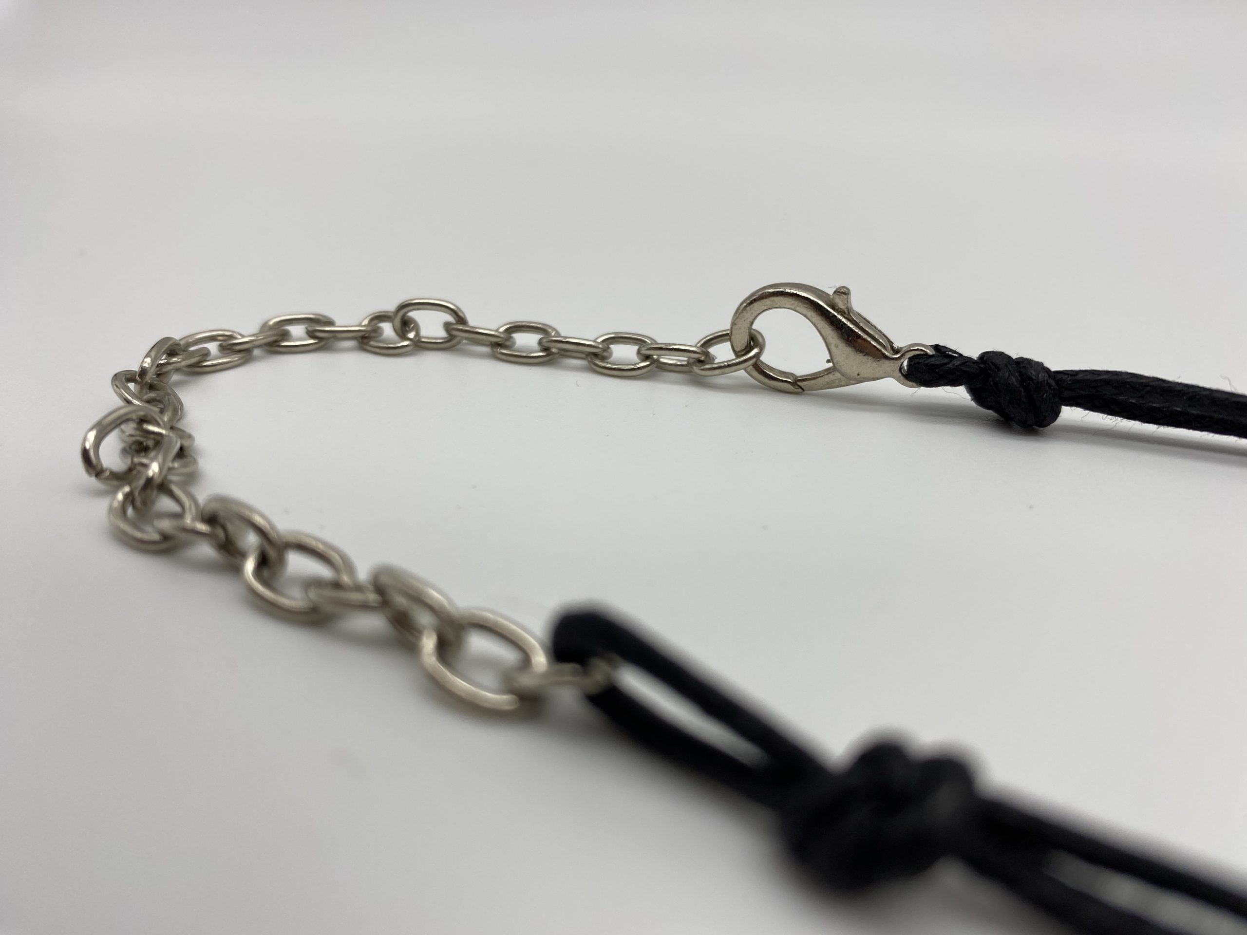 Nella parte che poggia sul collo invece è stato predisposto un moschettone con catena lunga 15 cm che permette di regolare a piacimento la posizione della collana.
