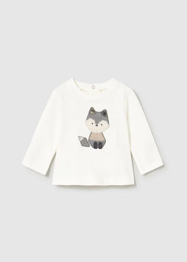 Maglietta manica lunga per neonata. Girocollo. Chiusura con bottoni a pressione nella parte posteriore. Elementi decorativi: applicazione decorativa, Serigrafia (print)