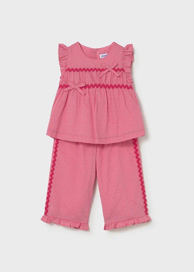 Completo due pezzi in cotone per neonata e bambina firmato Mayoral. Pantalone lungo con vita elasticizzata e top coordinato, perfetti per un look comodo e raffinato. Tessuto morbido e traspirante, ideale per la pelle delicata. Design pratico e versatile, adatto a ogni occasione dalla quotidianitร alle uscite speciali. 1514-010 – – Mayoral
