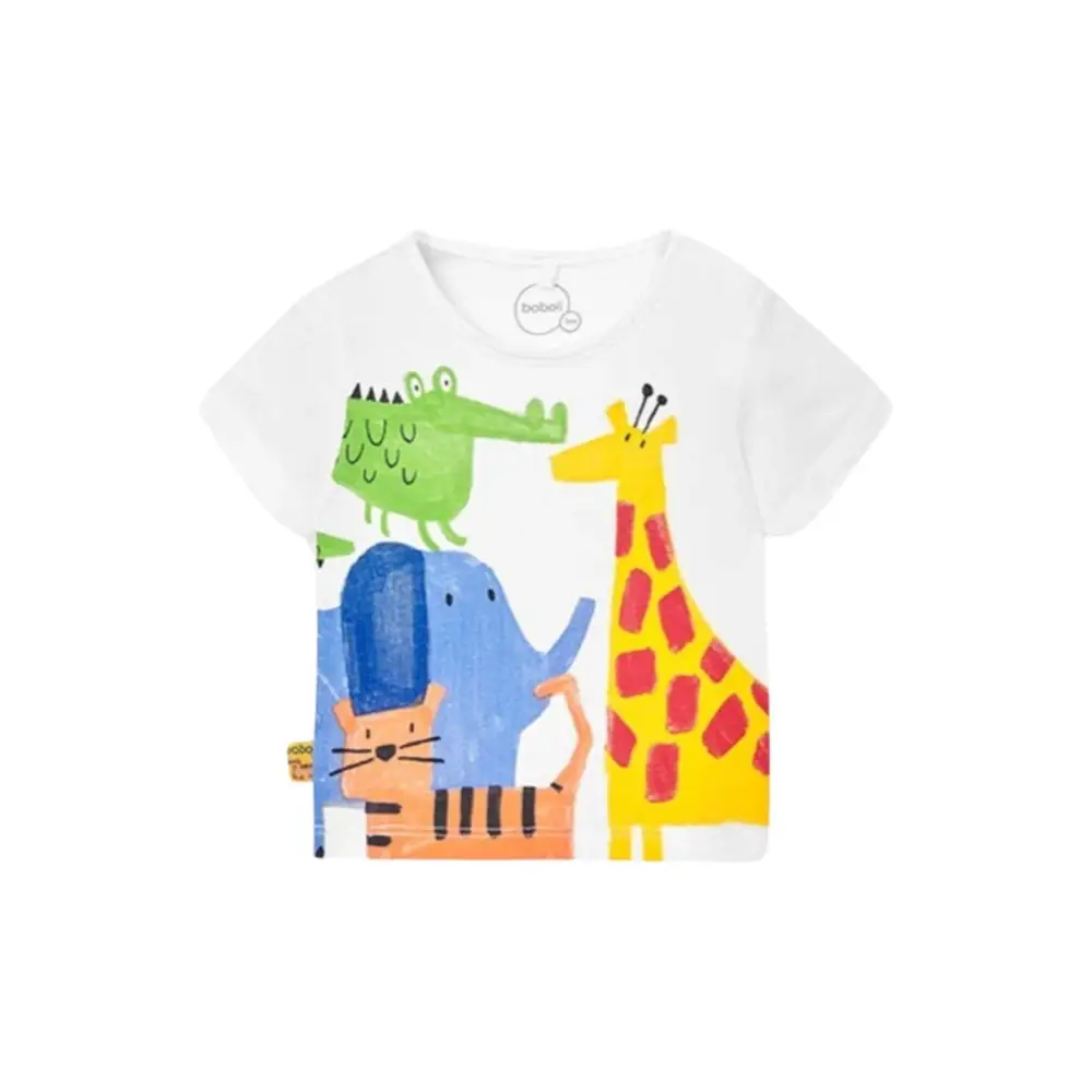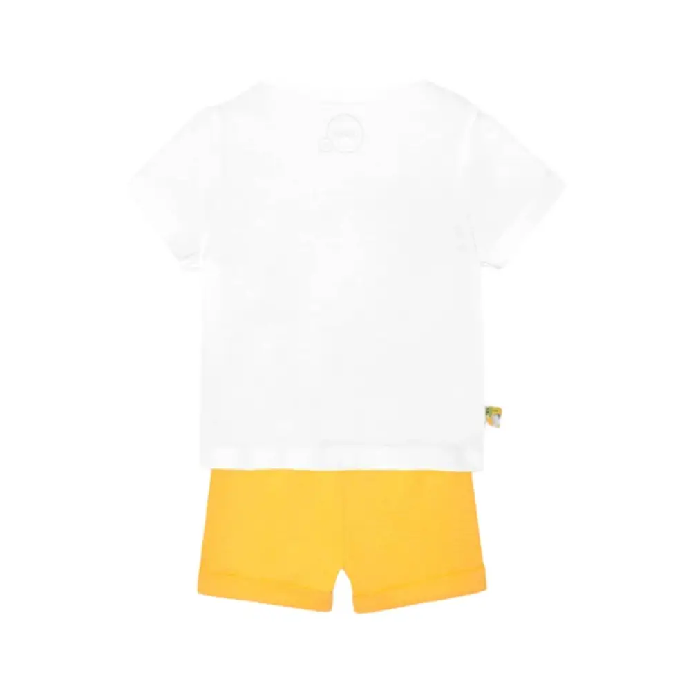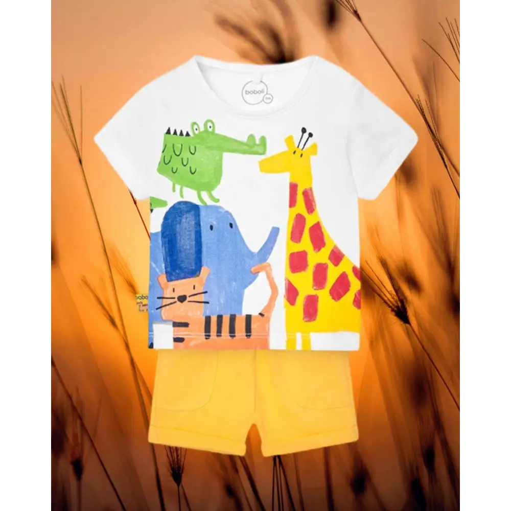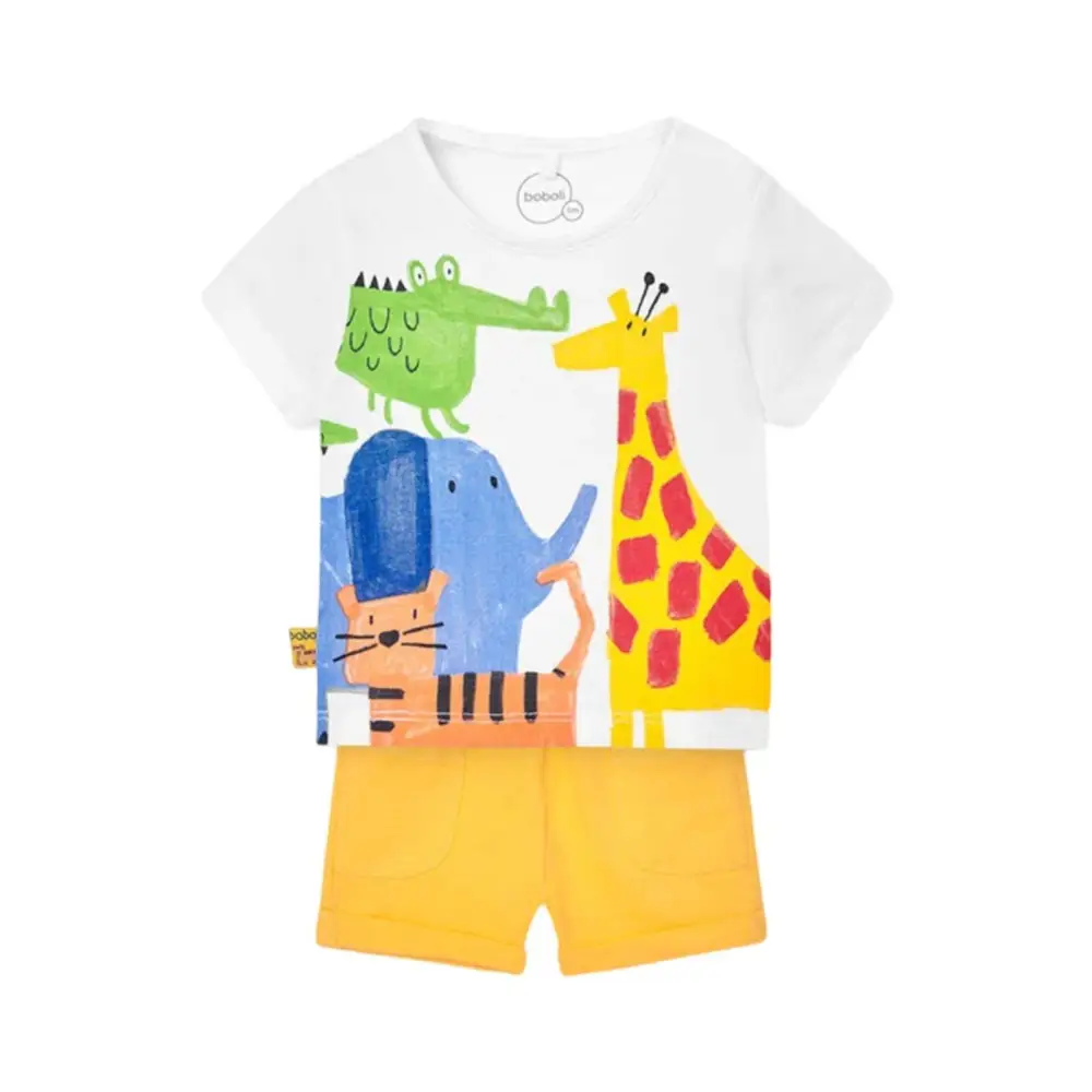 Questo è un completo corto coloreato 2 pezzi per neonati maschi, firmato Boboli, codice 128168, un grazioso set ideale per vestire il tuo bambino con stile e comfort. Disponibile nelle taglie da 0 mesi a 2 anni, questo abbigliamento bambini è realizzato in tessuto di maglia leggero e traspirante, perfetto per la stagione estiva. Il colore bianco puro conferisce un aspetto pulito e versatile, adatto a qualsiasi occasione, dalle uscite quotidiane agli eventi speciali. La simpatica stampa aggiunge un tocco di allegria e vivacità al look del tuo piccolo. Il collo rotondo assicura il massimo comfort, mentre le maniche corte sono ideali per le giornate più calde. Questo set firmato Boboli combina praticità e stile, rendendolo un’ottima scelta per il guardaroba del tuo bambino.