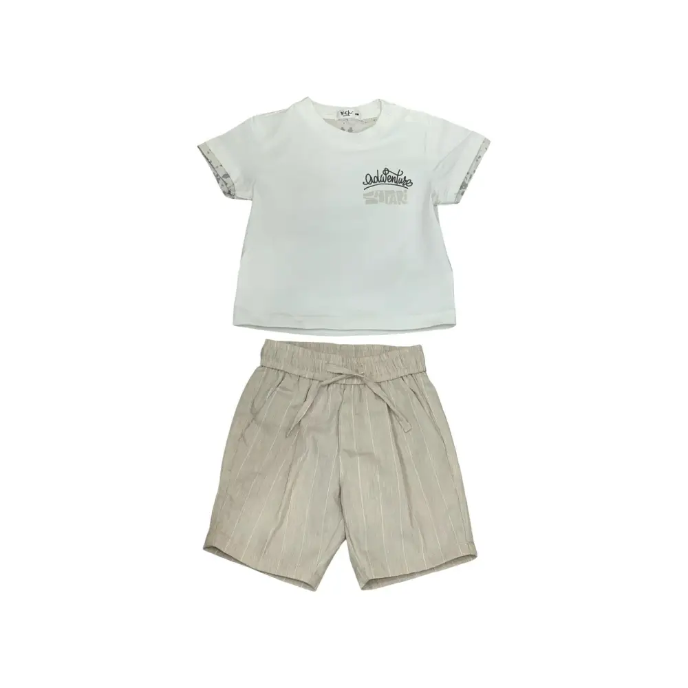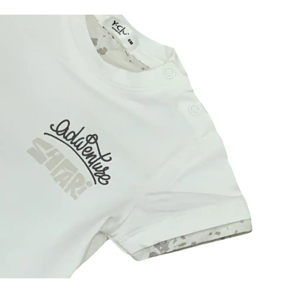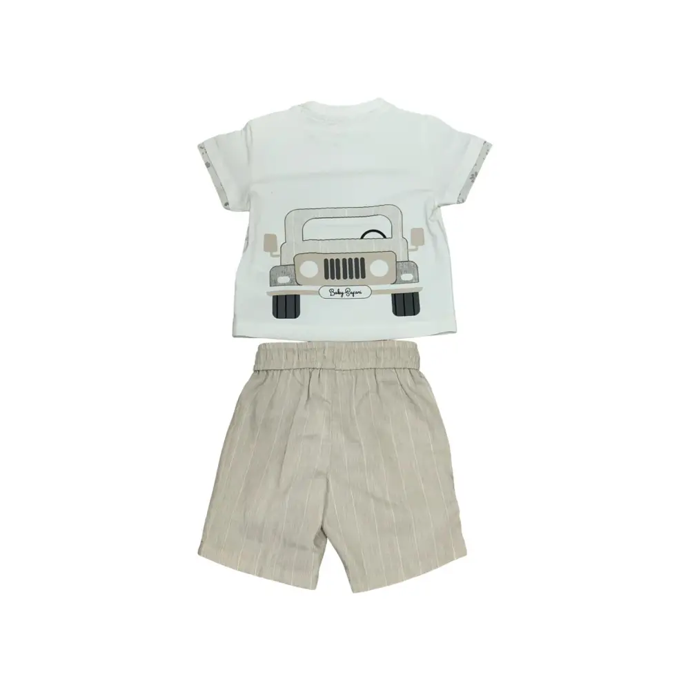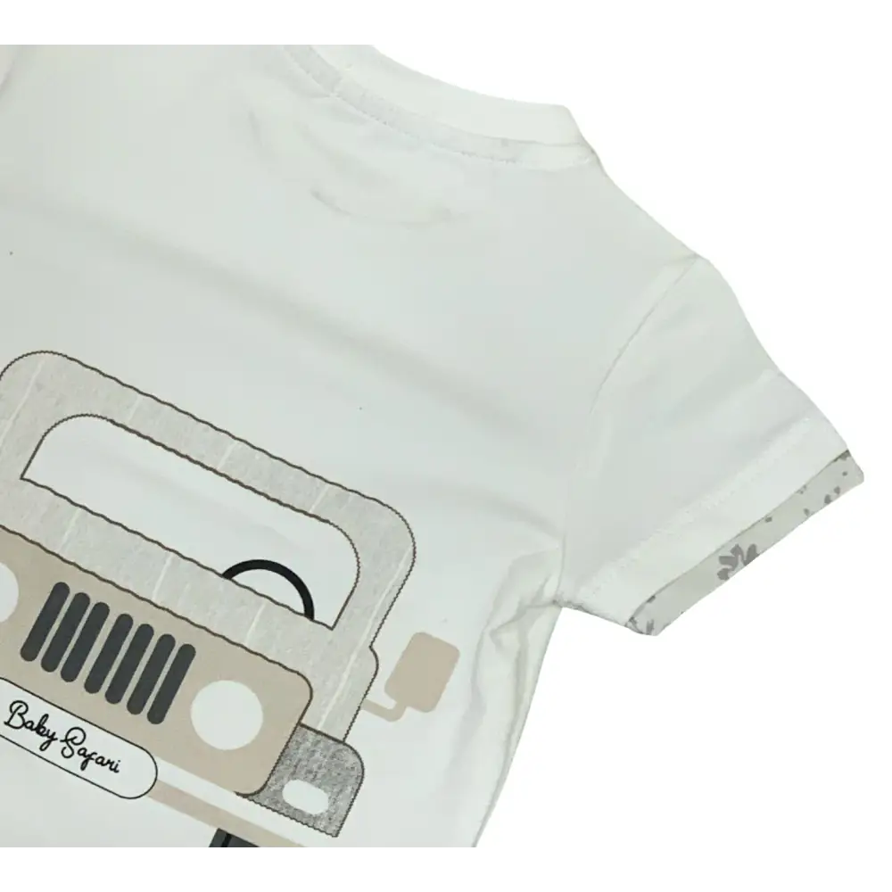 Questo simpatico completo corto è perfetto per i tuoi neonati da 6 mesi a 24 mesi. Il completo include una maglietta a maniche corte con una vivace stampa fiorita a rifinire le maniche. Sul retro della maglietta, un divertente motivo dello Jeep “safari” aggiunge un tocco avventuroso. La stampa riprende il motivo gessato dei pantaloni corti beige, che presentano un comodo elastico in vita. Un capo ideale per l’abbigliamento bambini.
