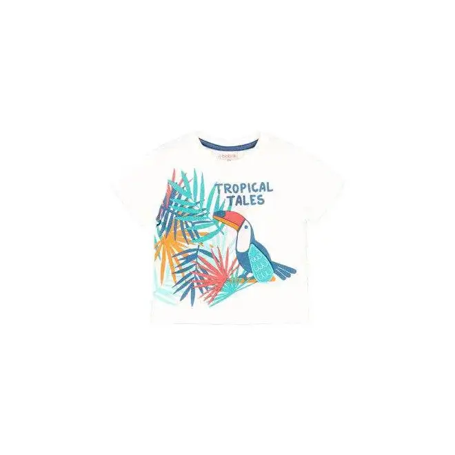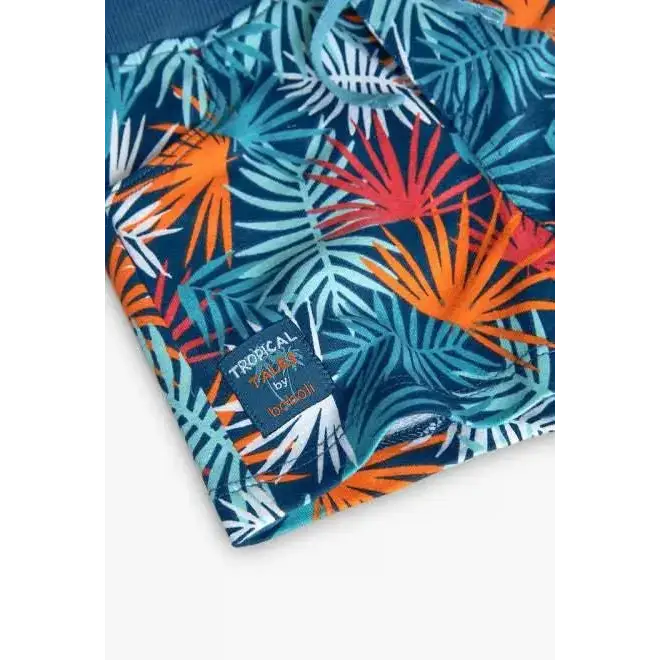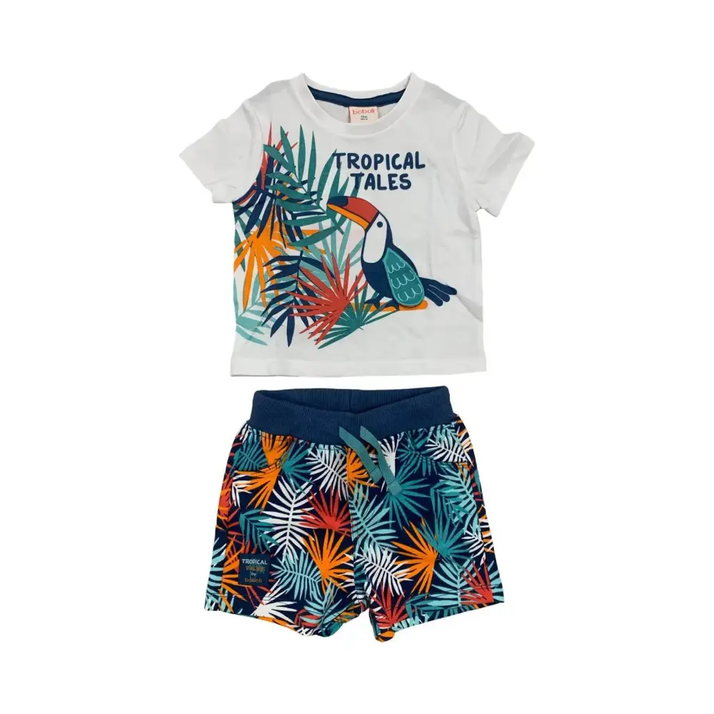 Il Completo corto 2 pezzi per Bambino di Boboli offre uno stile fresco per la stagione estiva. Questo set comprende una maglietta leggera e dei pantaloncini coordinati. La maglietta bianca mostra una stampa vivace con foglie tropicali e un tucano colorato. I pantaloncini sono elastici in vita e decorati con lo stesso tema.