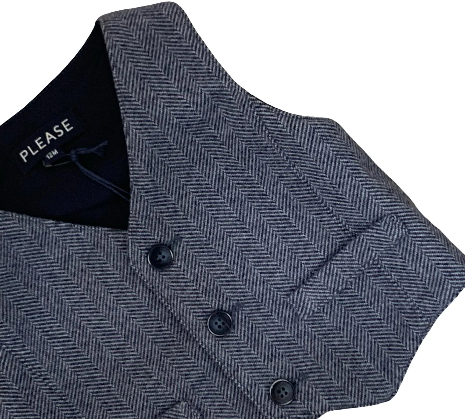 ✔️ Gilet in morbido tweed blu, con 3 bottoni coordinati e 2 finte tasche frontali.