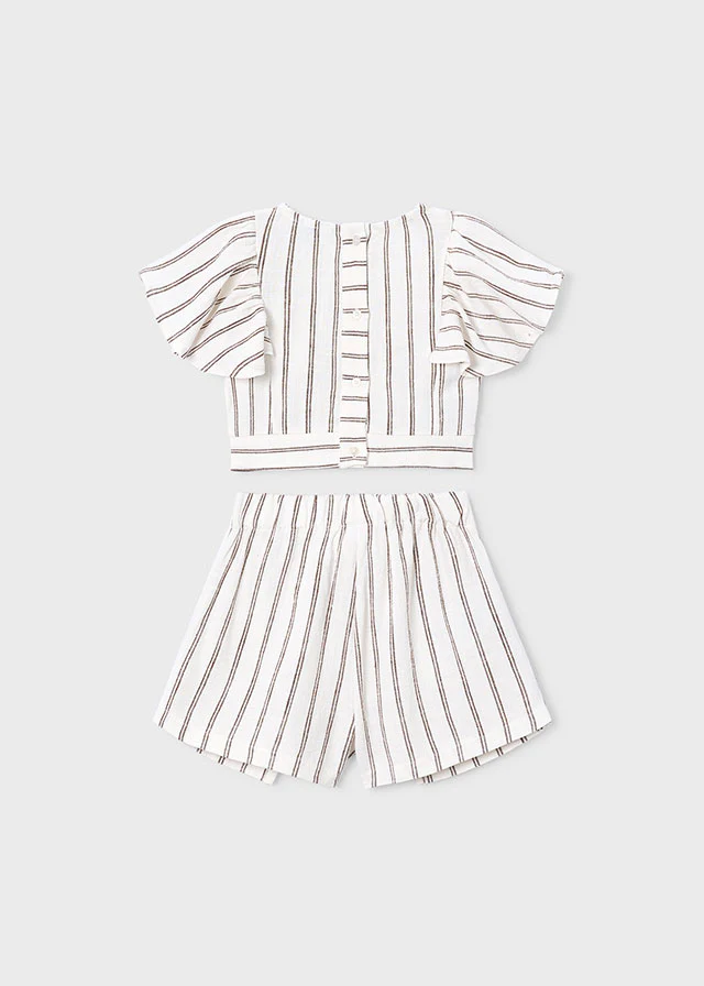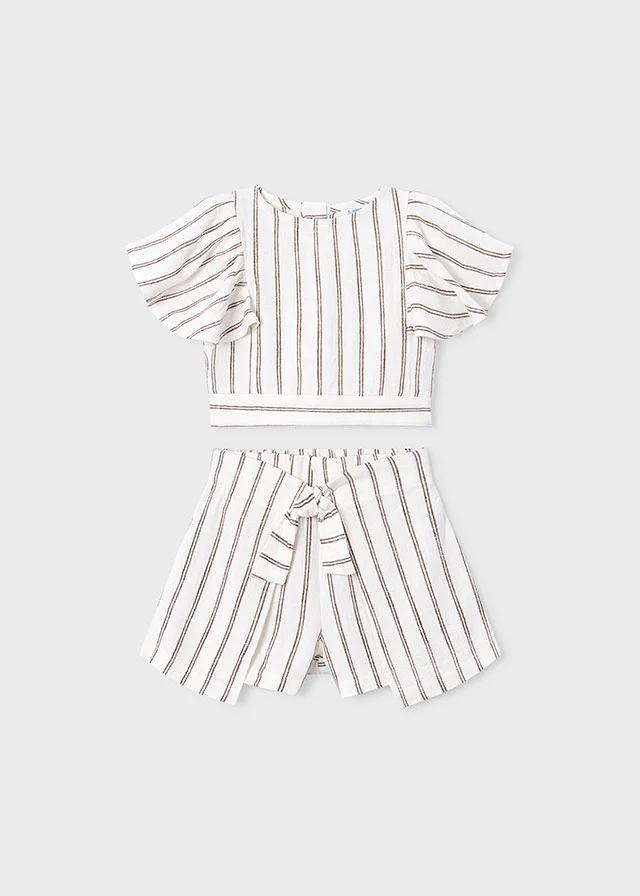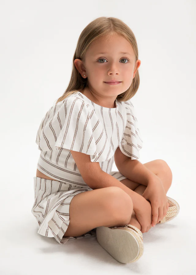 Coordinato a righe Mayoral in cotone naturale per bambina. Design classico con righe delicate, perfetto per la stagione primaverile. Tessuto morbido e traspirante, ideale per il comfort tutto il giorno. Abbinamento versatile che si coordina facilmente con altri capi del guardaroba. Dettagli curati e finiture di qualitร per uno stile elegante e pratico. Art. 3949-024