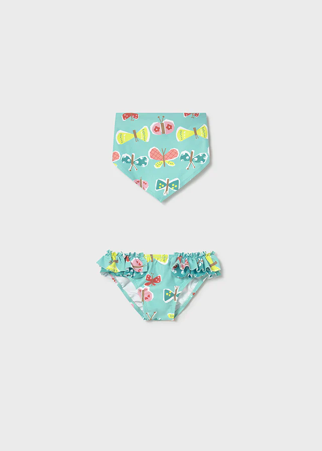 Costume slip coordinato con bandana per neonata e bambina, firmato Mayoral. Design elegante e pratico che combina comfort e stile, perfetto per le giornate al mare o in piscina. Realizzato con materiali di qualitร , garantisce libertร di movimento e una vestibilitร sicura. La bandana abbinata aggiunge un tocco di personalitร al look estivo della piccola. Art. 1657-078