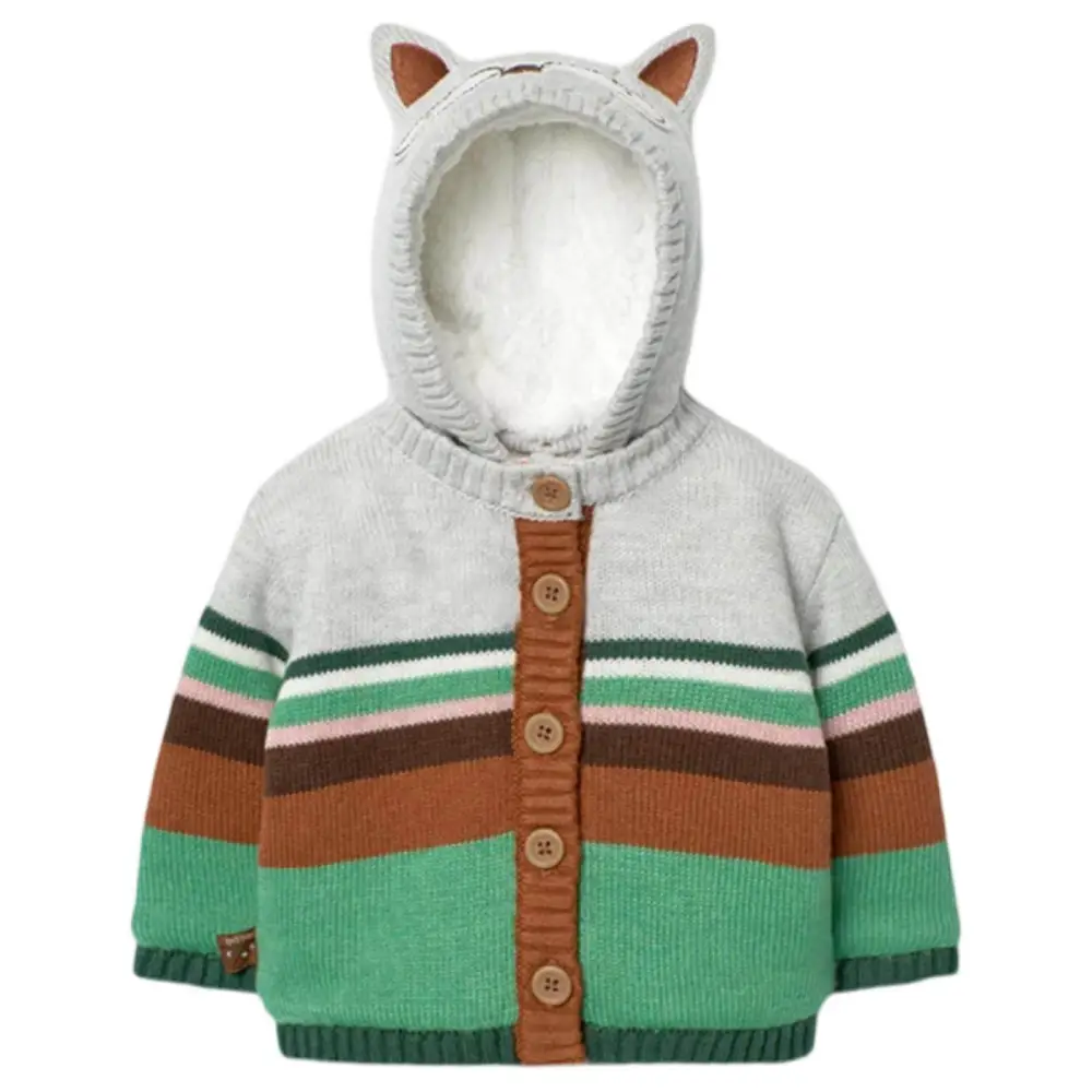 Questa giacca è progettata pensando alla praticità e al comfort. Il cappuccio staccabile offre una protezione extra durante le giornate invernali più fredde, mentre le maniche lunghe e il morbido tessuto a maglia assicurano calore e una sensazione piacevole sulla pelle delicata del bambino. La chiusura frontale con bottoni rende la vestizione semplice e veloce, facilitando la vita ai genitori.
