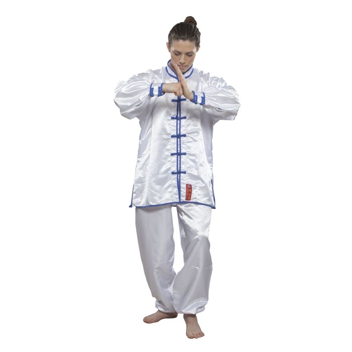 Uniforme cinese originale, realizzata al 100% in poliestere/satin. I pantaloni dal design confortevole sono dotati di una fascia speciale in satin. Le estremità delle maniche sono regolabili con una fascia in velcro. Vantaggi aggiuntivi: pratico completo in due pezzi composto da pantaloni e giacca satin di poliestere leggero tradizionali chiusure a occhiello cintura extra confortevole