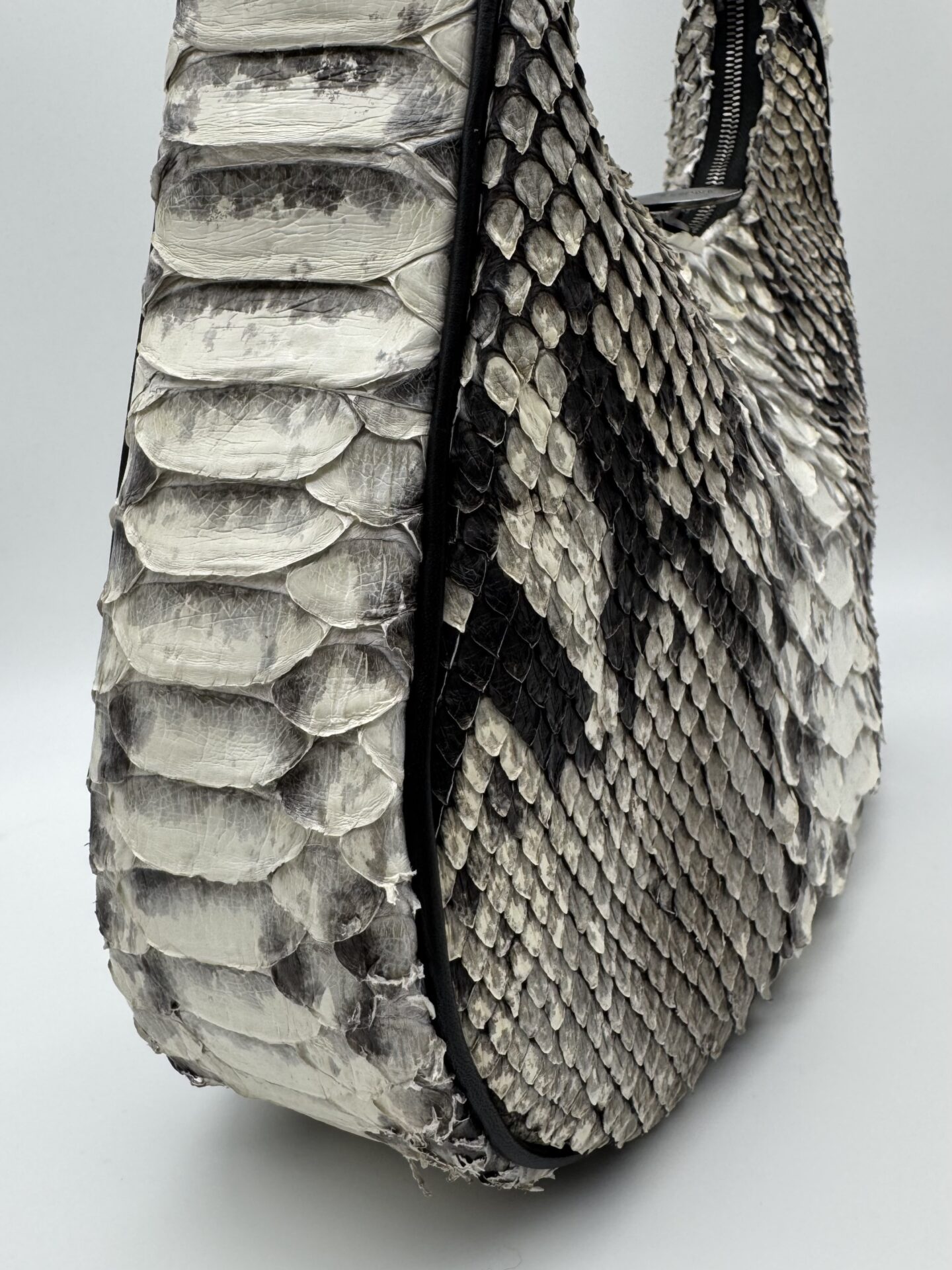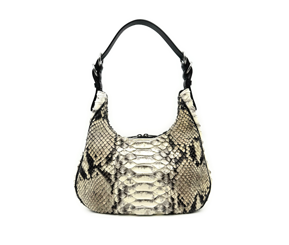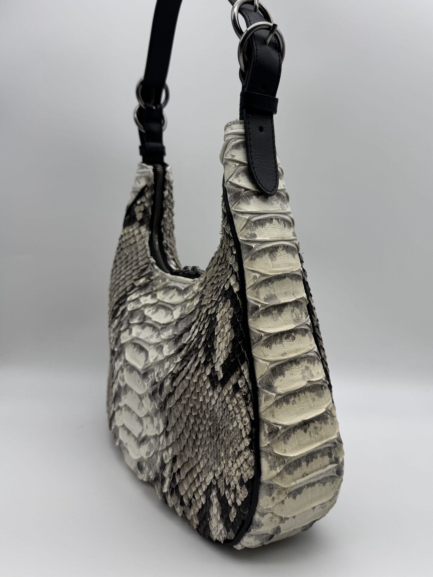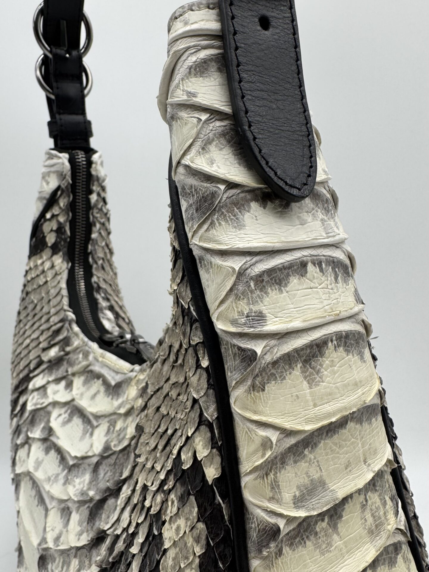 Hobo semi-rigida realizzata in vero pitone accostato a dettagli in pelle nera. Manico a cinghia regolabile tramite due fibbie su entrambi i lati. Interno foderato.