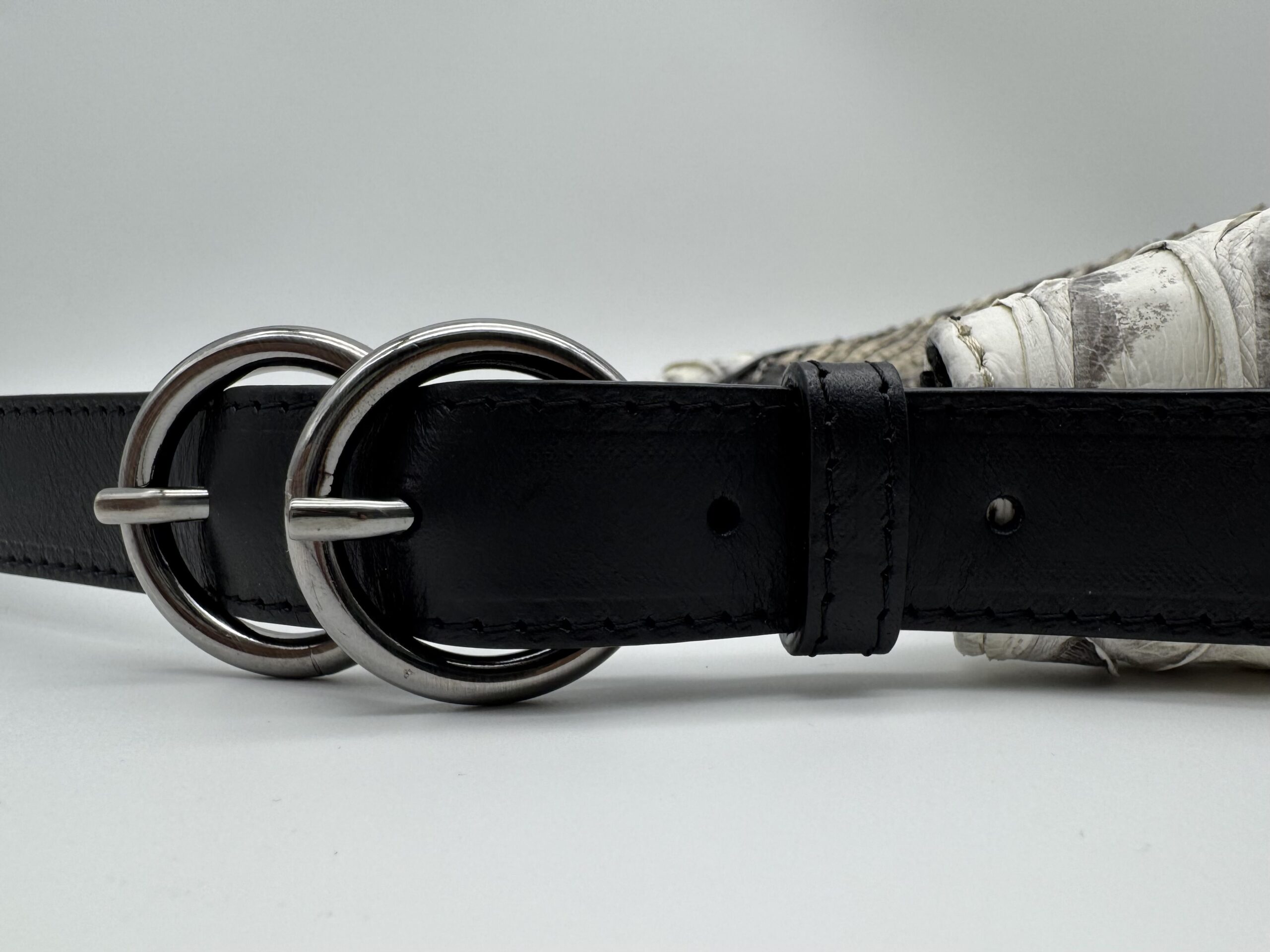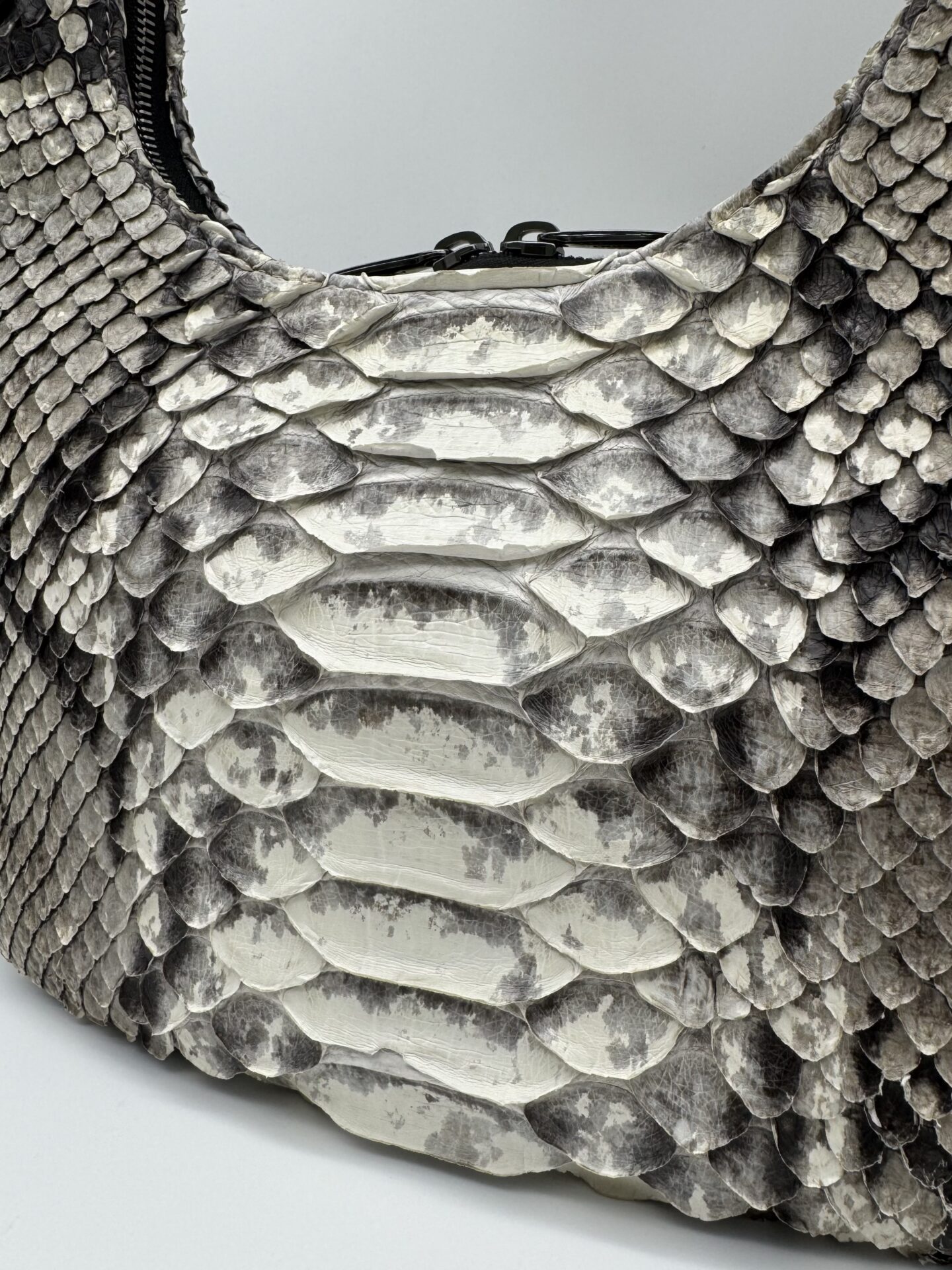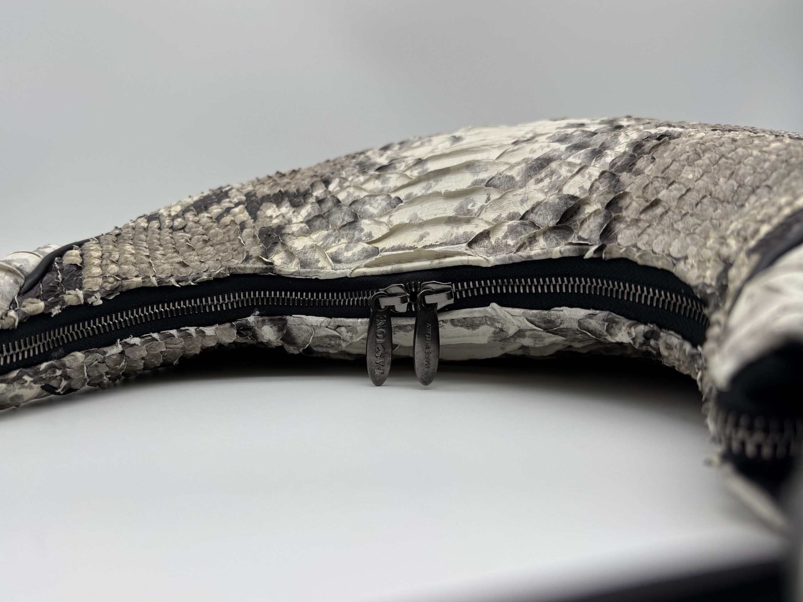 Hobo semi-rigida realizzata in vero pitone accostato a dettagli in pelle nera. Manico a cinghia regolabile tramite due fibbie su entrambi i lati. Interno foderato.