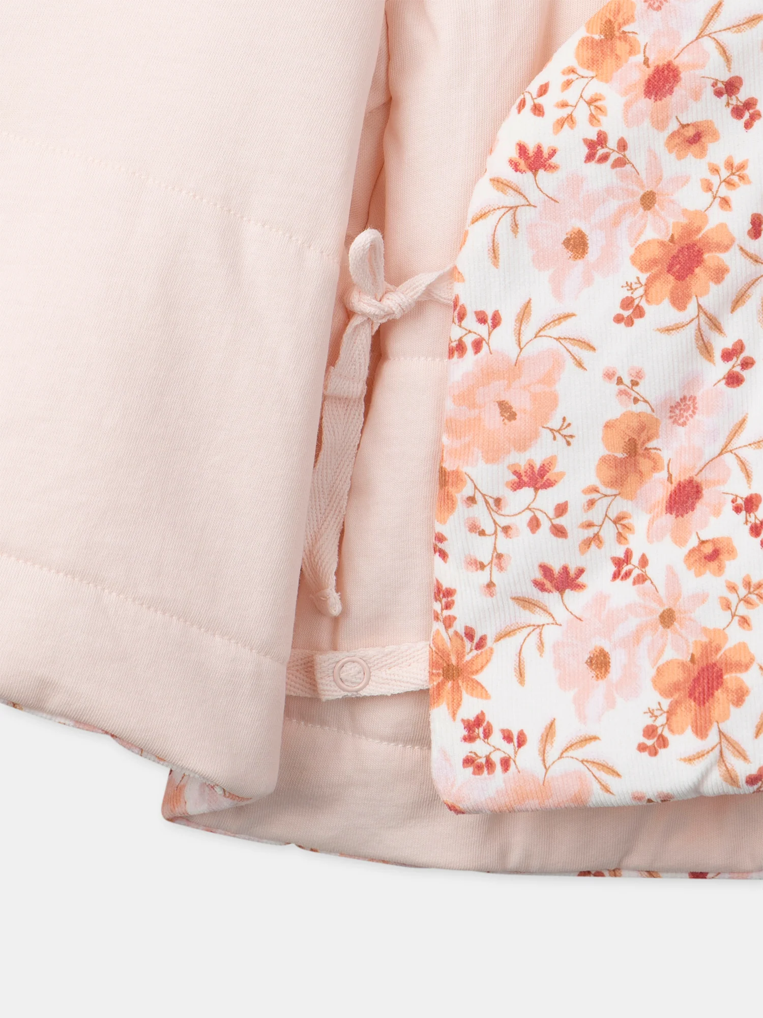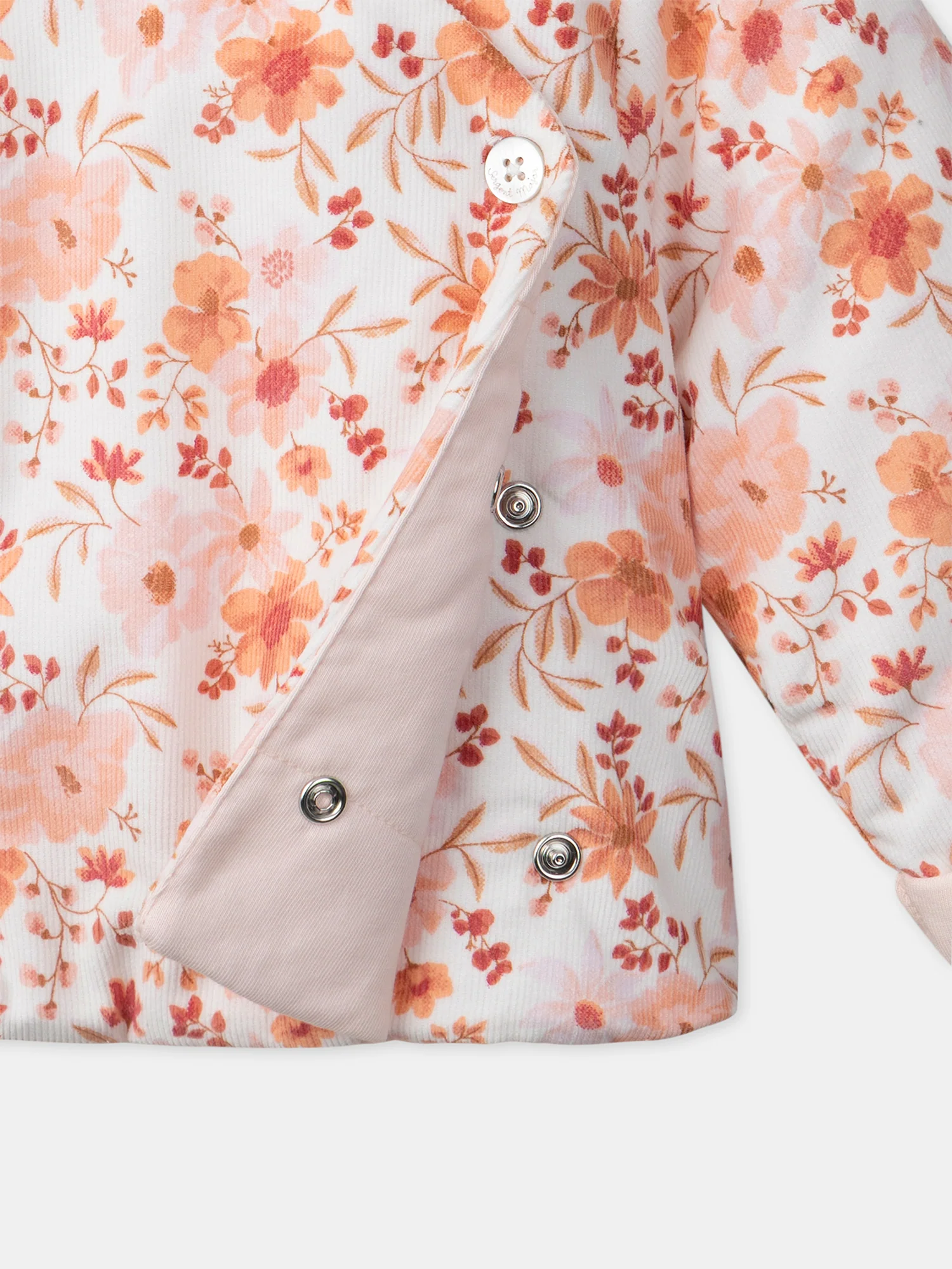 Hoodie per neonati in velluto corduroy Stampa floreale in rosa polveroso, arancione, ribes, corallo e marrone morbido su sfondo avorio Fodera in jersey rosa polveroso Polsini fissi che mettono in risalto la fodera