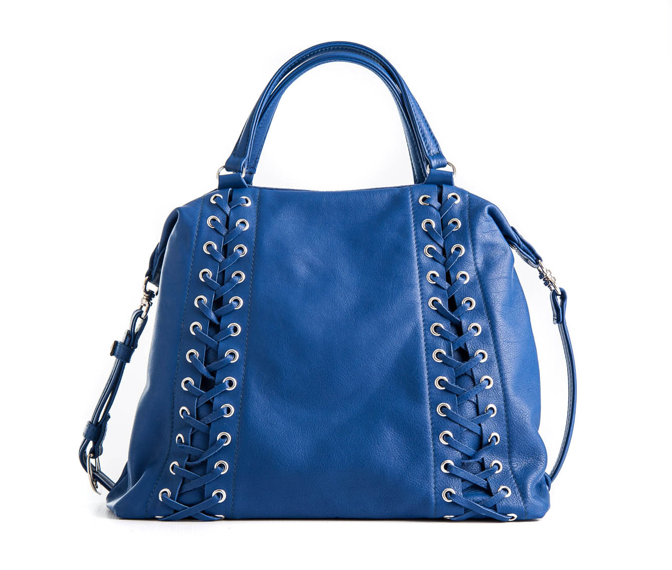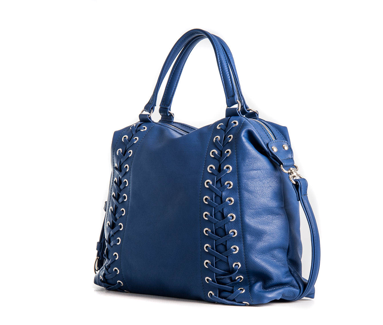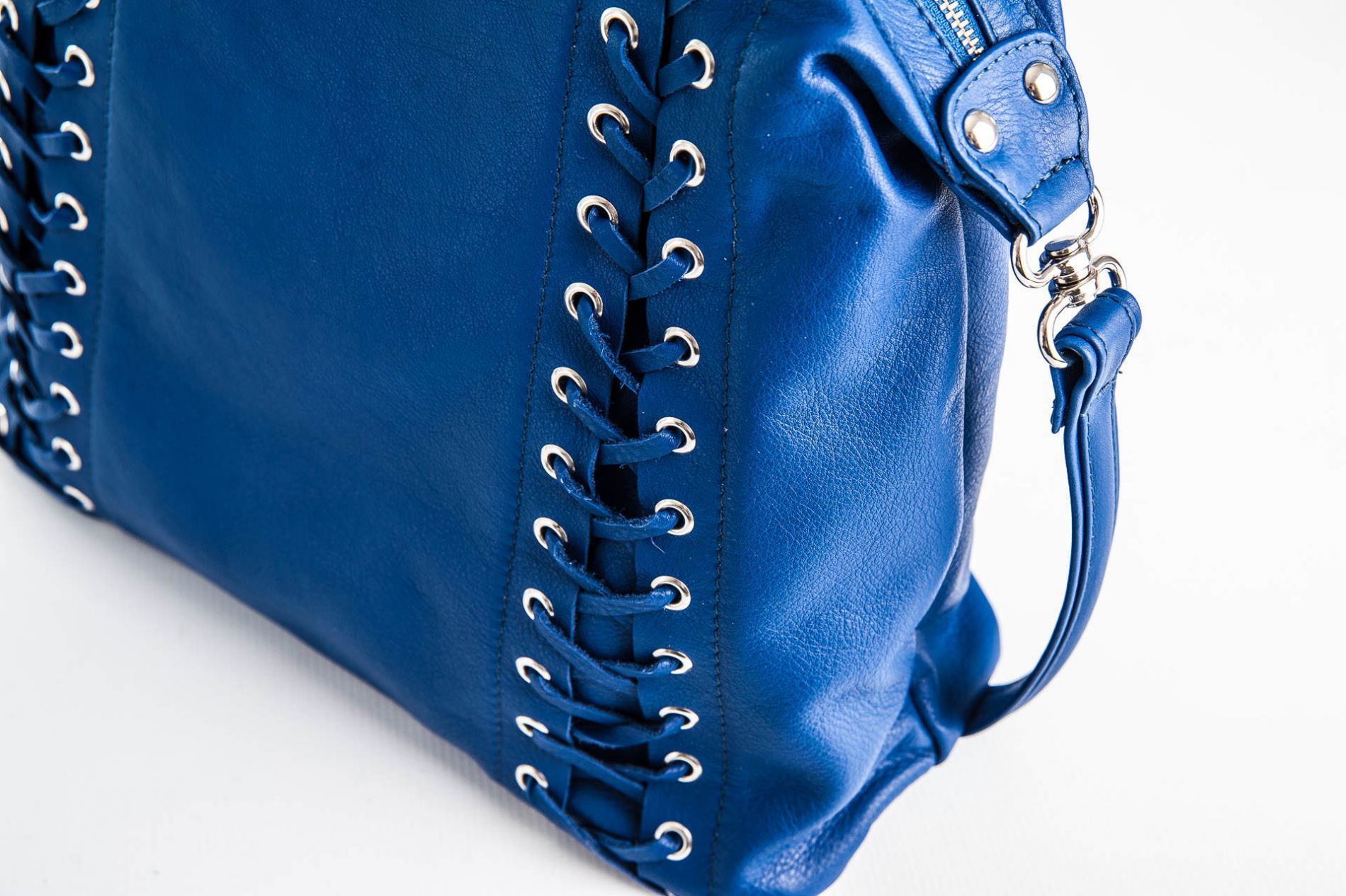 Borsa blu in vera pelle dalla forma morbida da portare a mano o a tracolla regolabile.