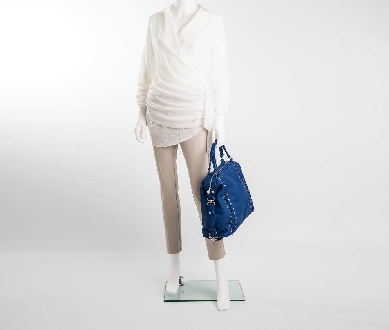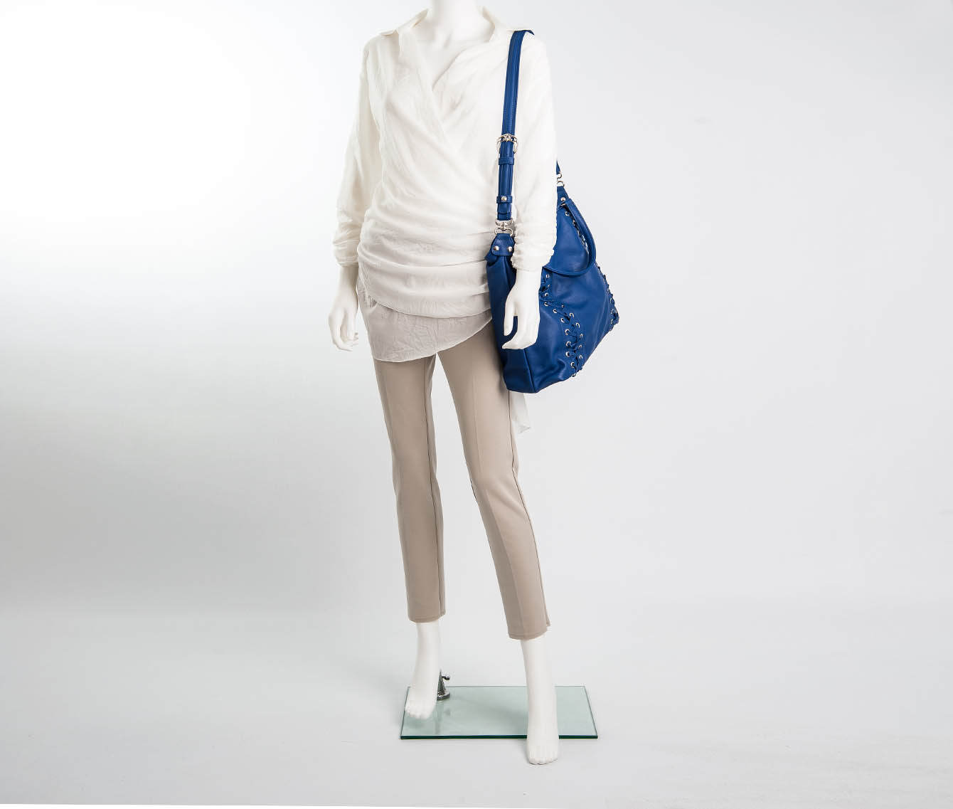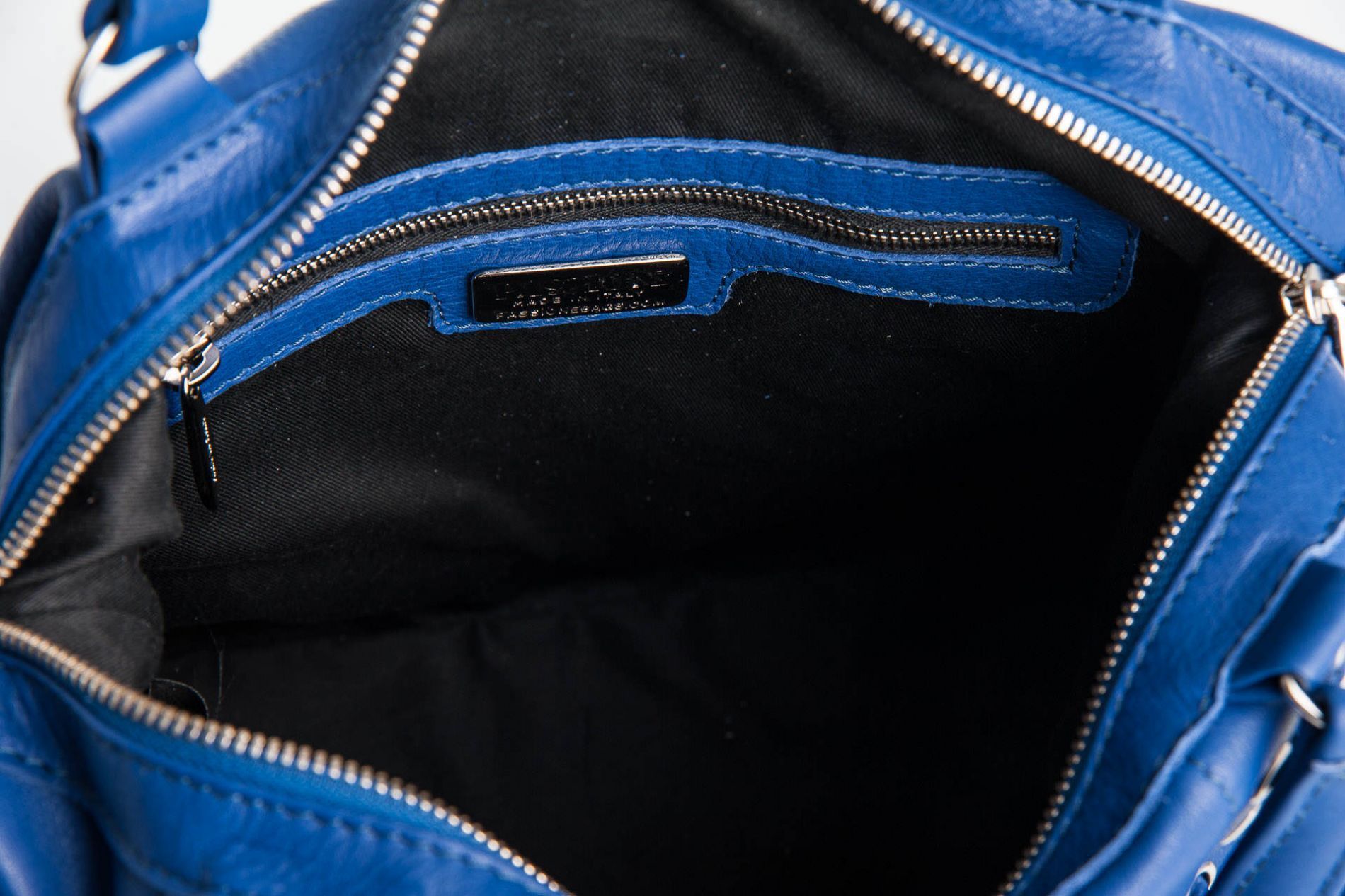 Borsa blu in vera pelle dalla forma morbida da portare a mano o a tracolla regolabile.