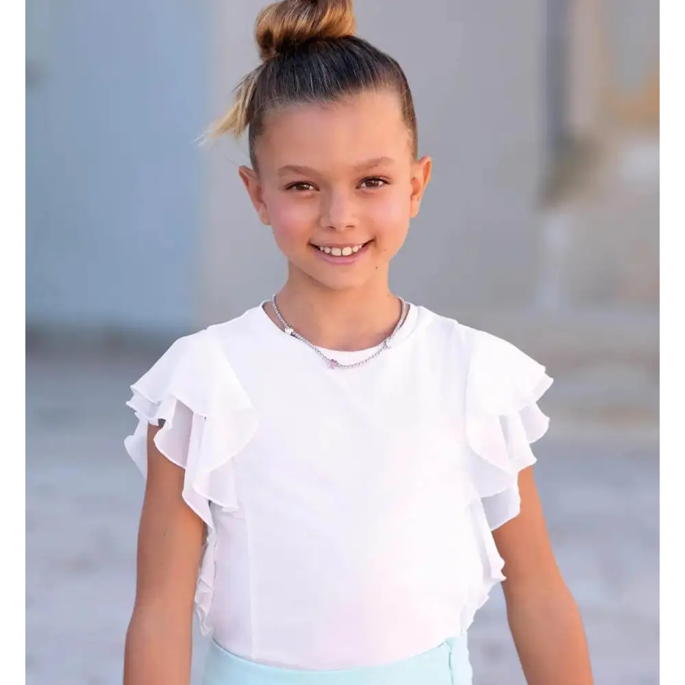 Questa elegante T-shirt Sarabanda è pensata per le ragazze dagli 8 ai 16 anni. Realizzata in morbido jersey stretch di cotone, offre comfort e libertà di movimento, rendendola ideale per le occasioni speciali. Le maniche in voile aggiungono un tocco di raffinatezza e leggerezza al capo. Completa il look una collana abbinata, pensata per esaltare lo stile della tua bambina. Un capo perfetto per l’abbigliamento bambini, firmato Sarabanda 0B448. Ideale per le ragazze che amano vestire alla moda e sentirsi a proprio agio. La maglietta è disponibile per la fascia d’età 8anni a 16anni Sarabanda.
