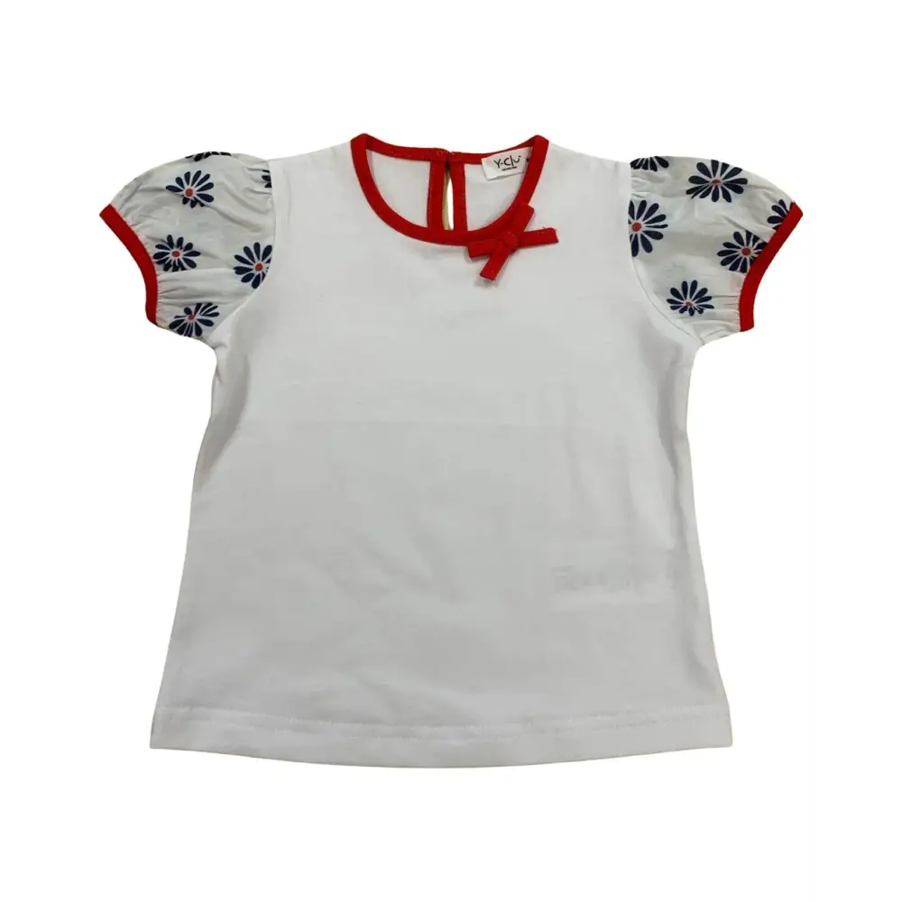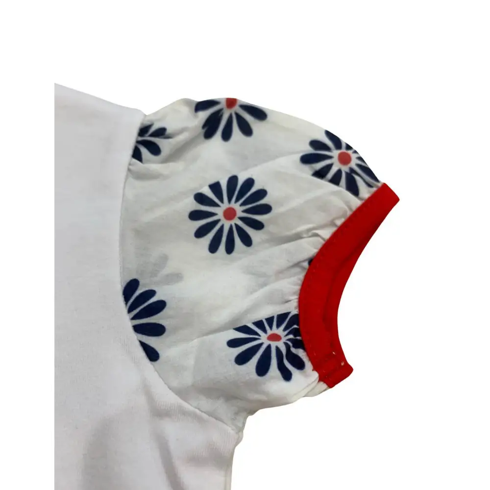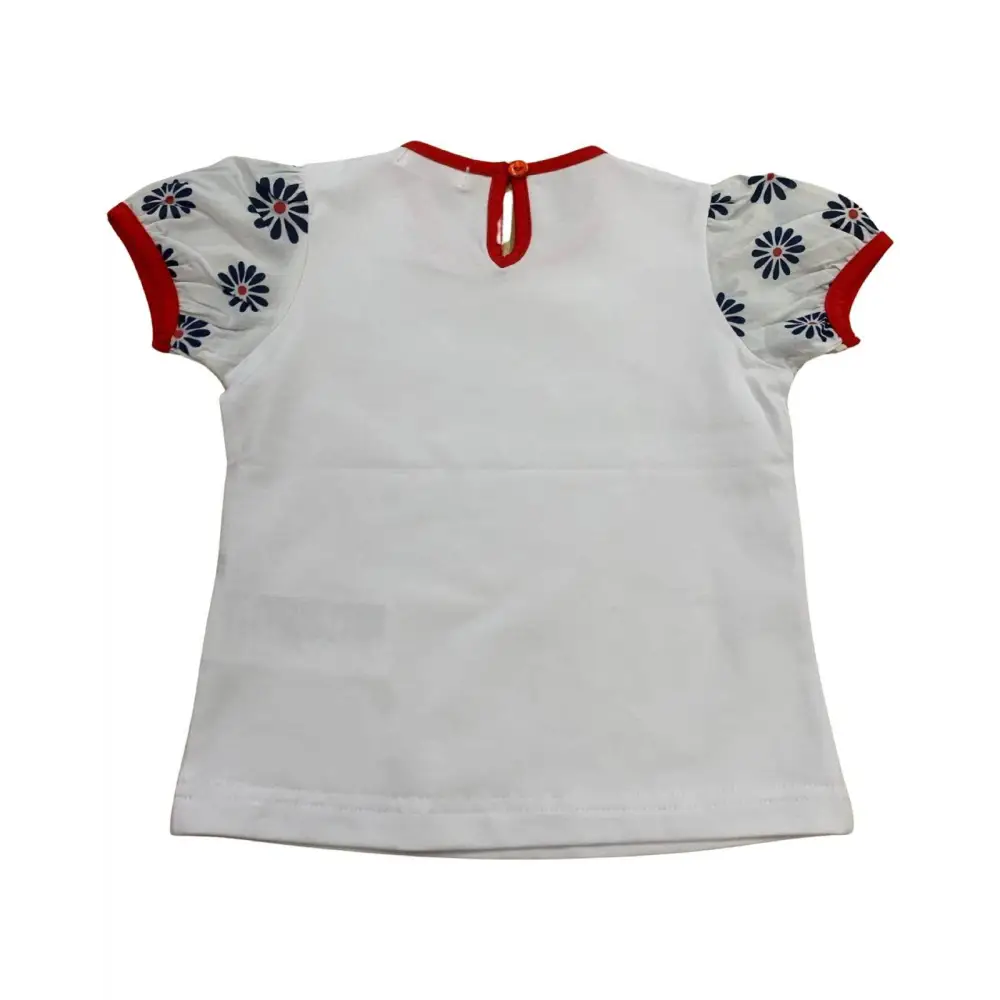 Questa maglietta bianca maniche corte bambina ha dettagli colorati sulle maniche che donano un tocco vivace e allegro. I bordi rossi e le piccole stampe floreali sulle maniche aggiungono stile, rendendo il capo diverso dalle semplici magliette. La qualità del tessuto resiste ai lavaggi frequenti.